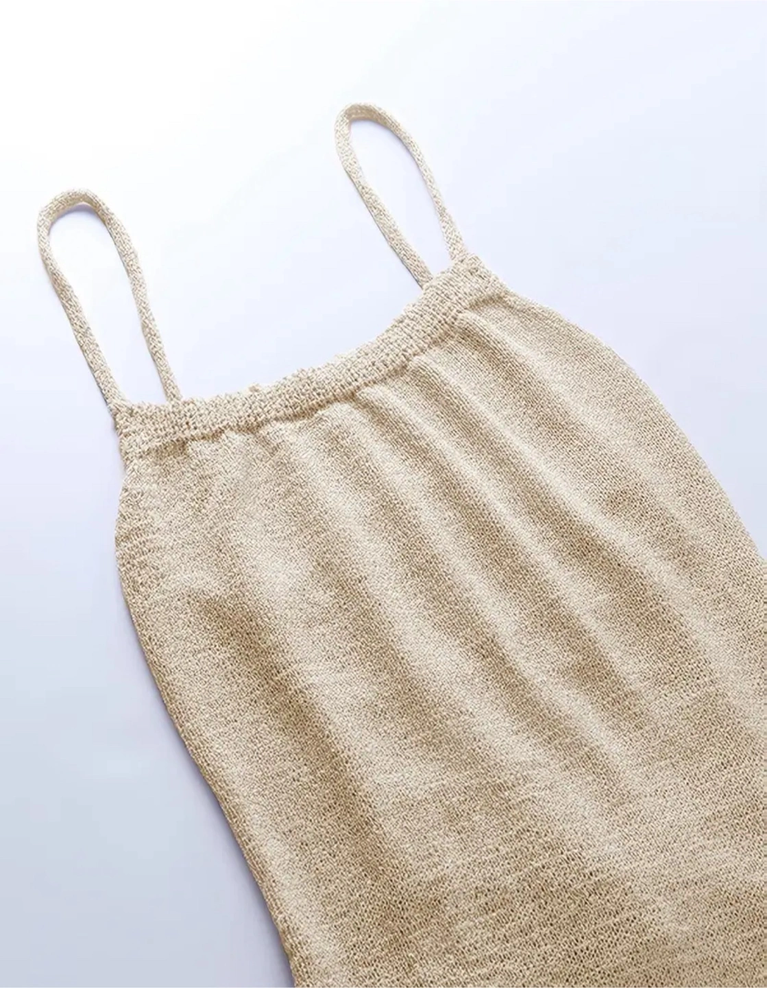 A midi dress in beige colour. Features thin straps and a laced back. A side slit adds a nice touch. Imagine yourself wearing this dress on a relaxing vacation.
