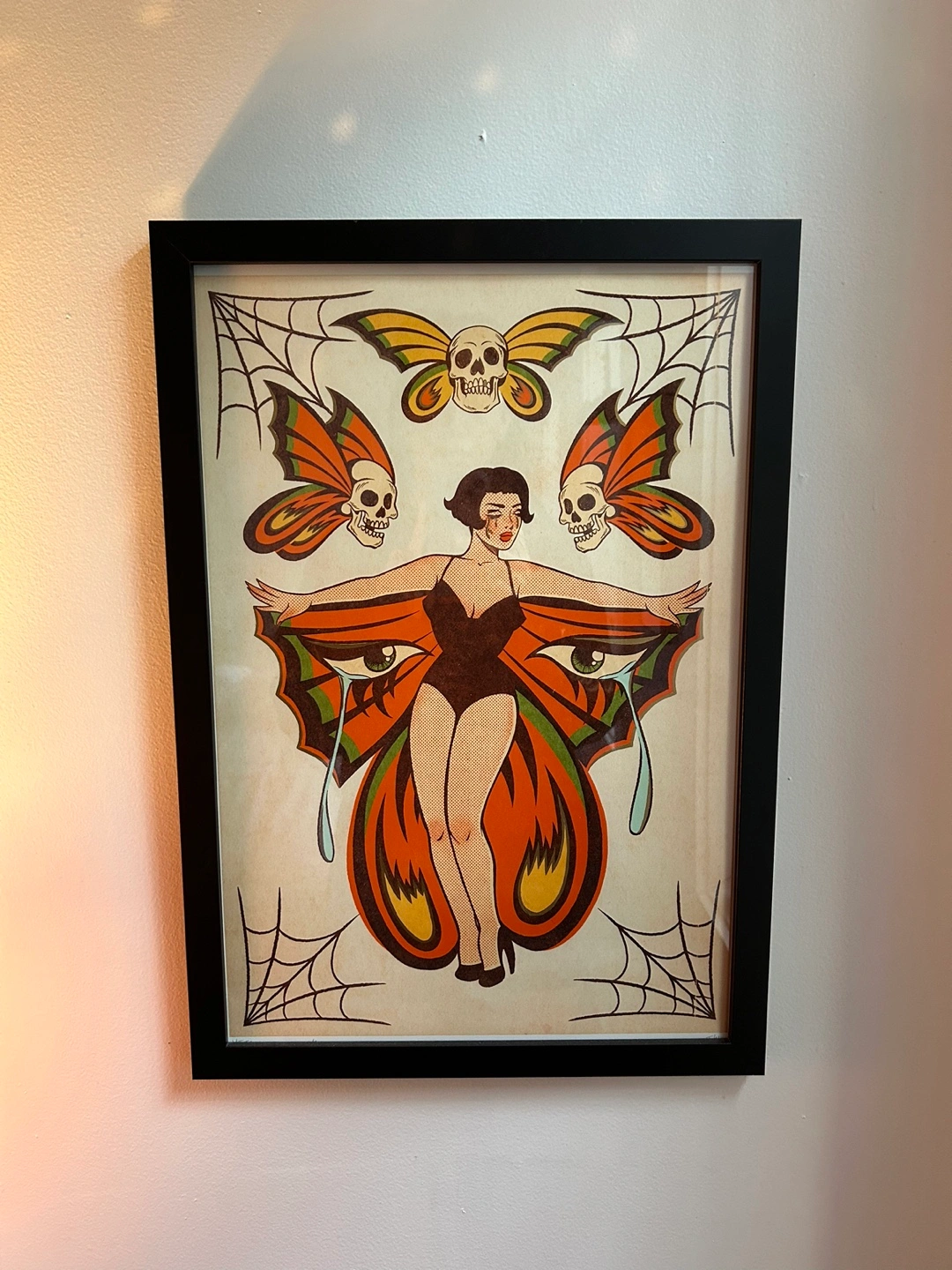 Print featuring a lady with butterfly wings and skull designs. Comes in a black frame.