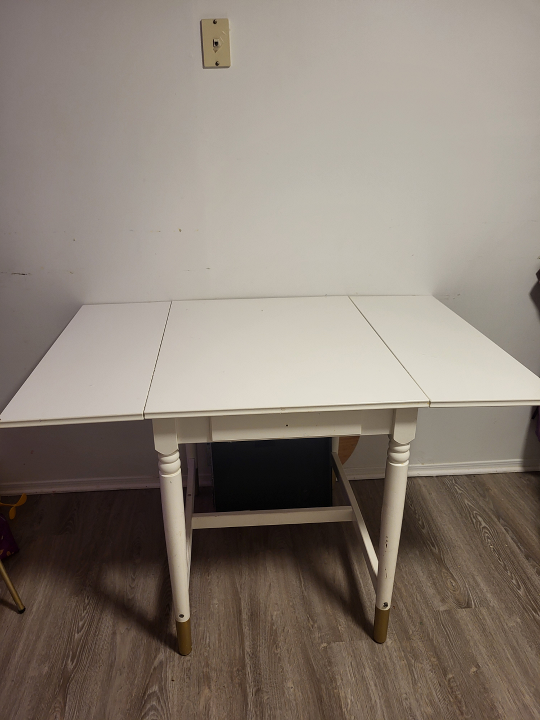 White drop leaf table. Features a rectangular shape. White frame. Table legs are round. A great spot for quiet mornings with your coffee.