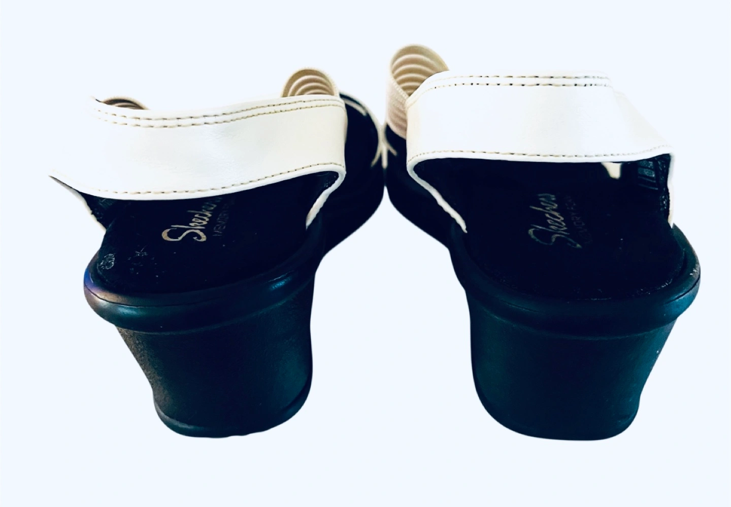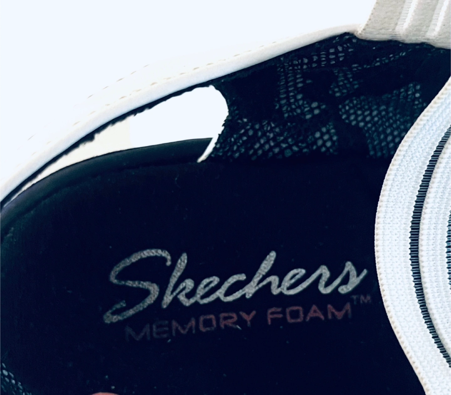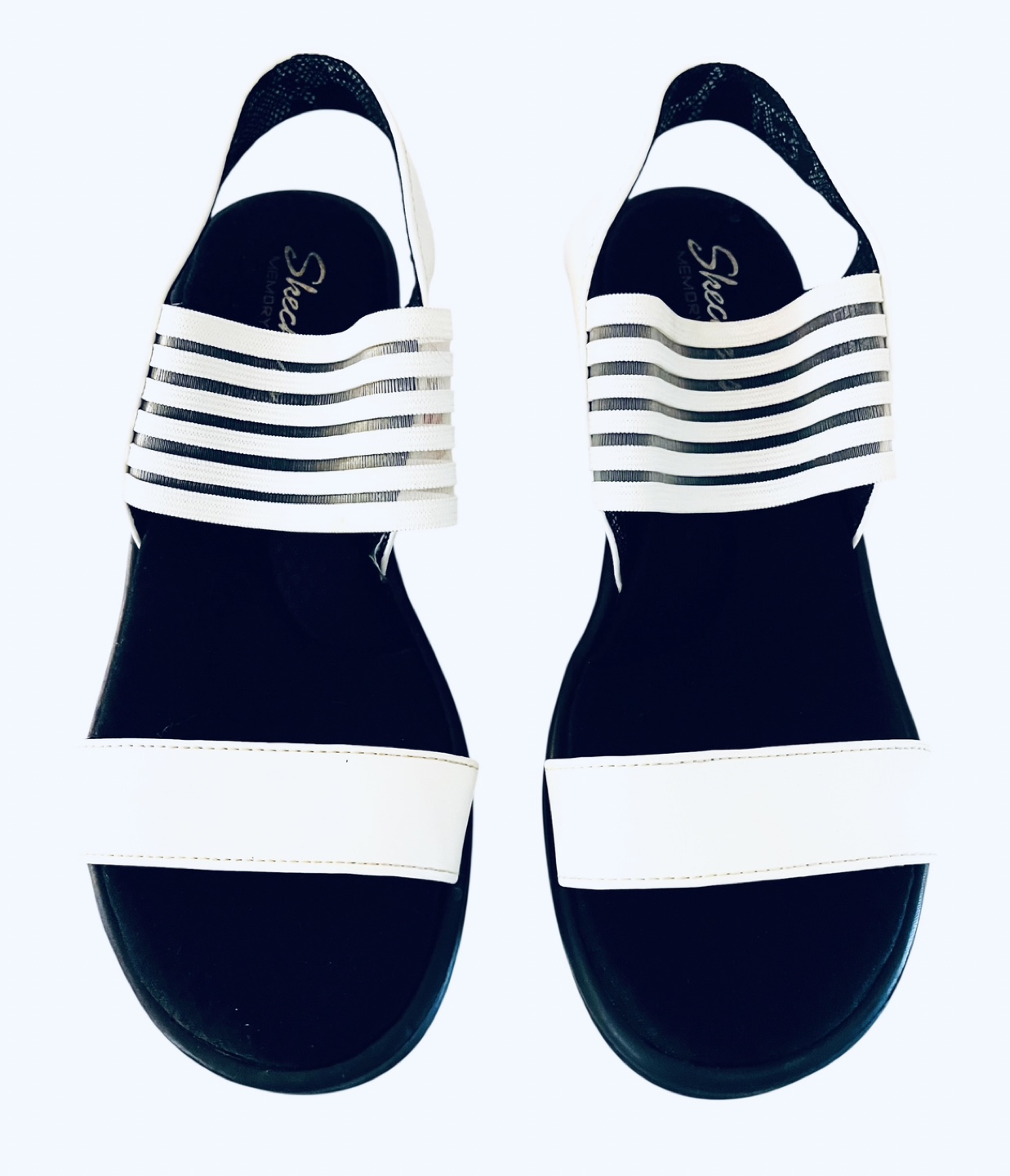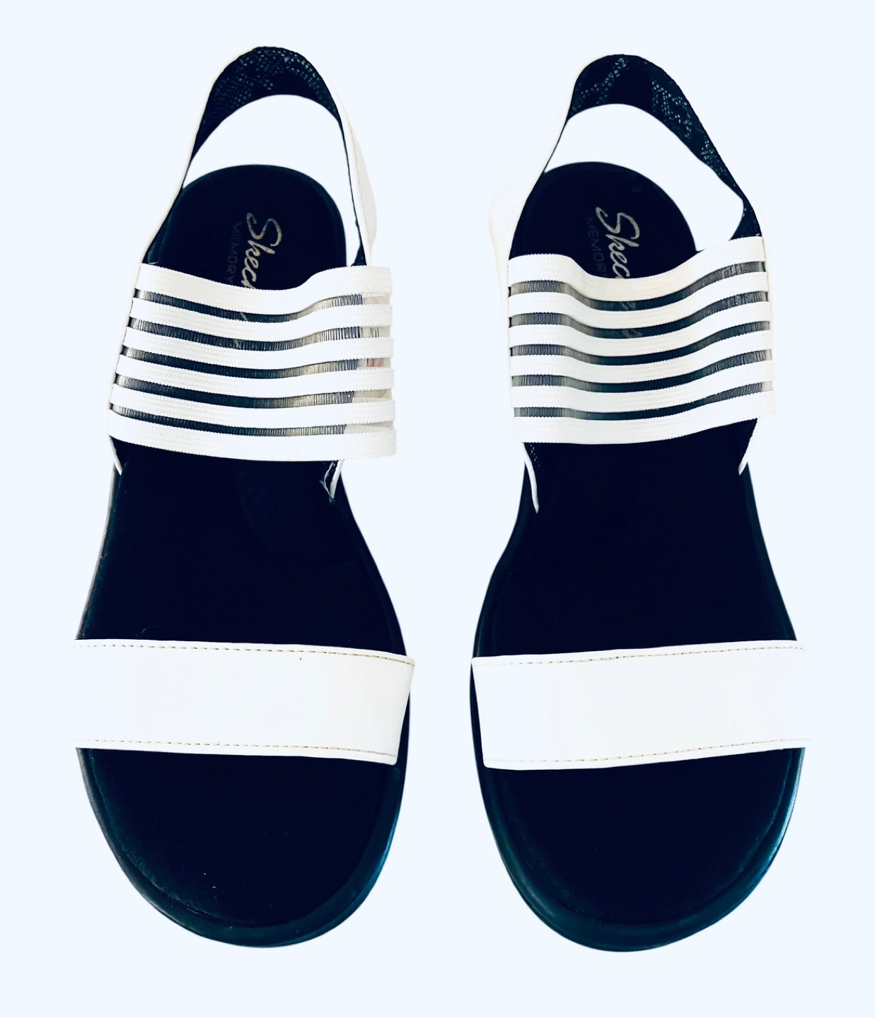 Keywords: Skechers sandals, white sandals, strappy sandals, slingback sandals, wedge sandals, memory foam sandals, women's sandals, summer footwear, casual sandals, comfortable sandals, size 9 sandals, black and white sandals, fashion sandals, stylish sandals
