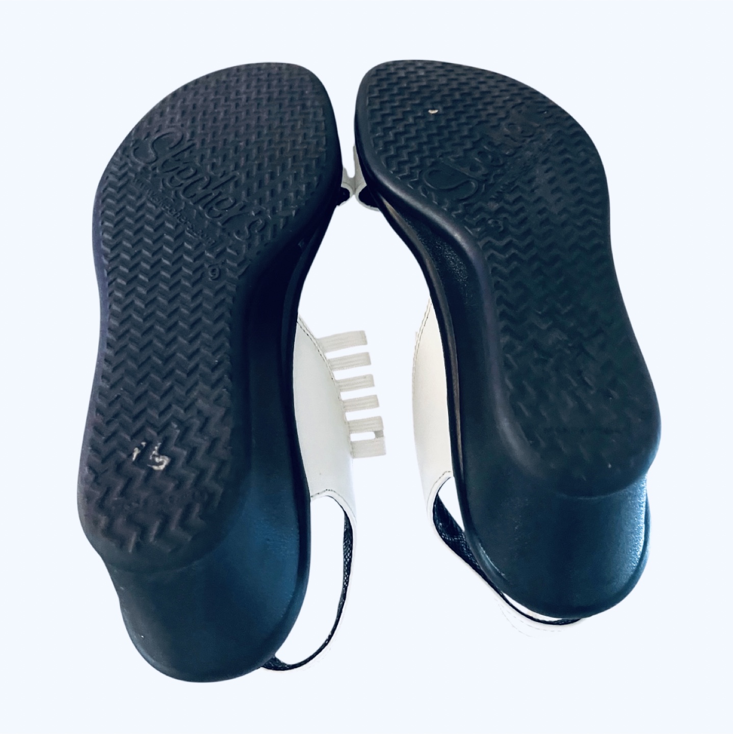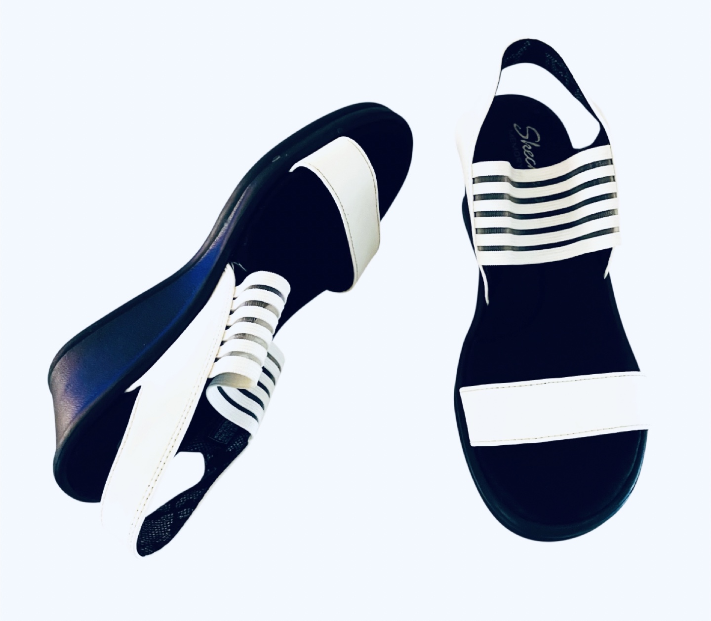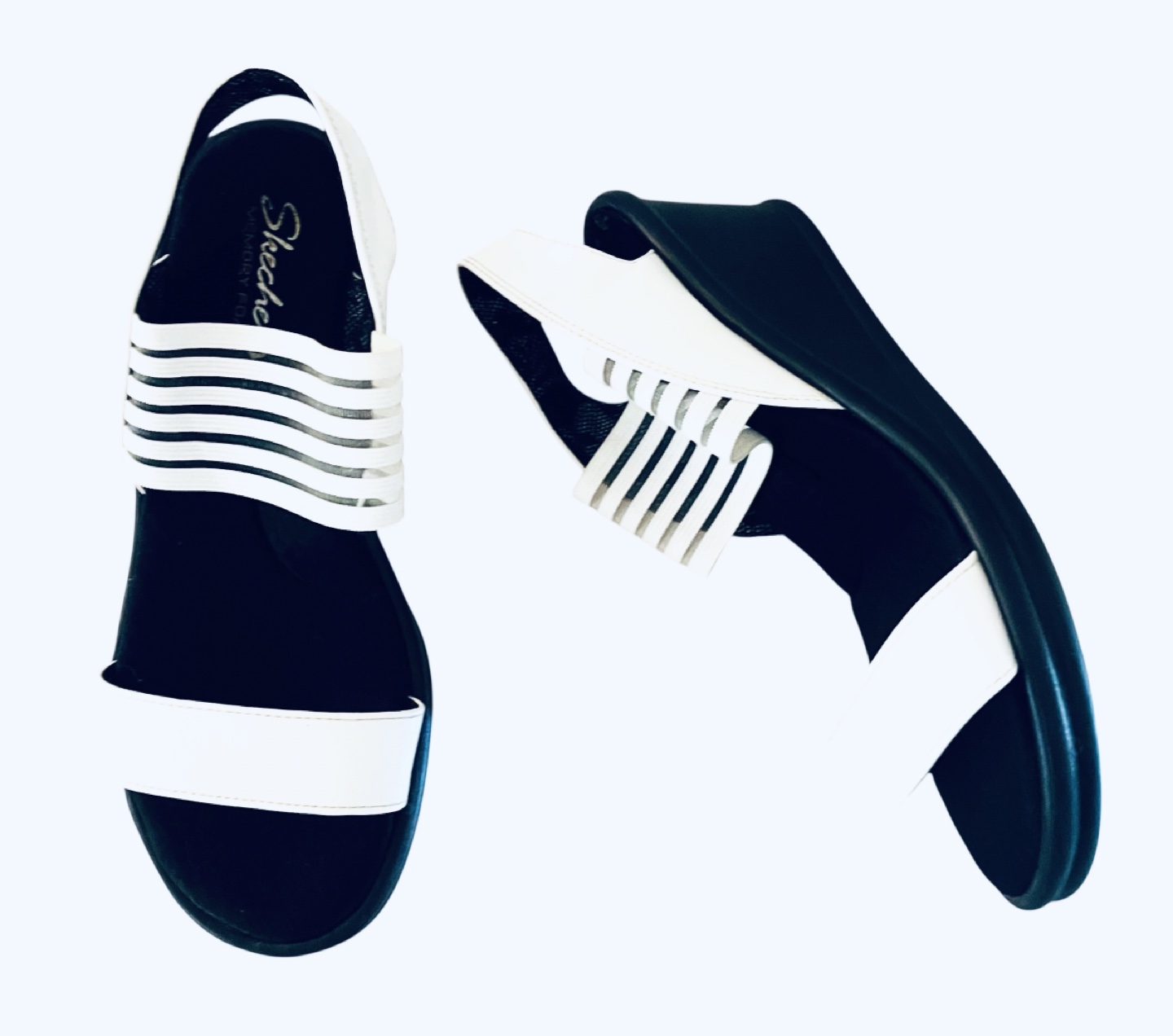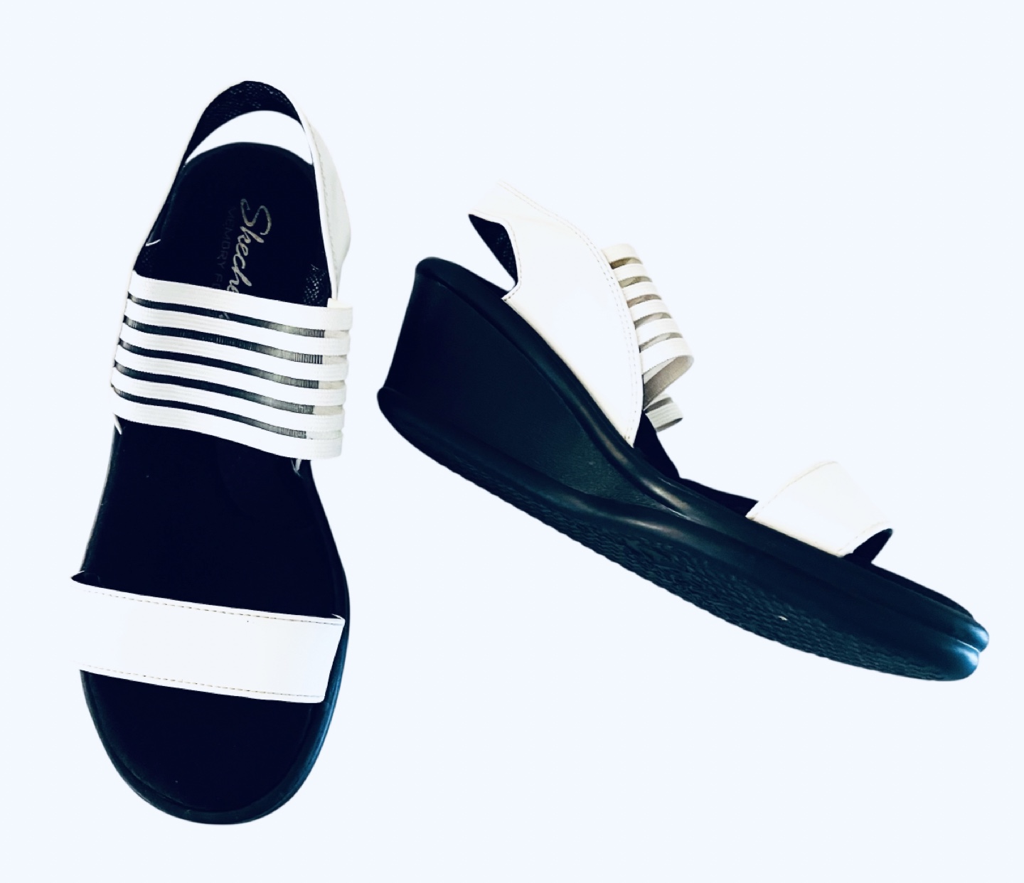 Keywords: Skechers sandals, white sandals, strappy sandals, slingback sandals, wedge sandals, memory foam sandals, women's sandals, summer footwear, casual sandals, comfortable sandals, size 9 sandals, black and white sandals, fashion sandals, stylish sandals