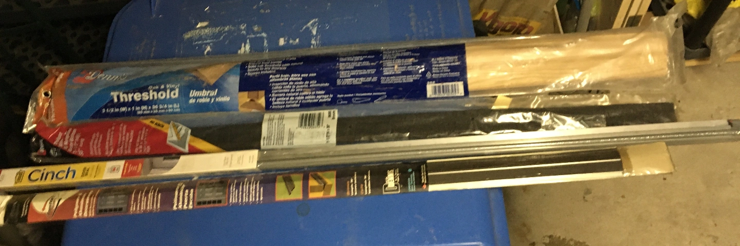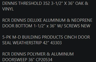 Four pieces of door and weather stripping. Items appear to be new in original packaging. These would be a great addition for someone to use in their home to keep out the outside weather. last picture for what each one is and how big it is. Cash only pick up at house
