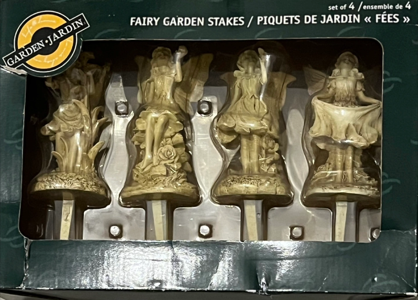 Set of fairy garden stakes. Four stakes in total. Each stake features a different fairy design. Will bring a tranquil vibe to your garden or yard.