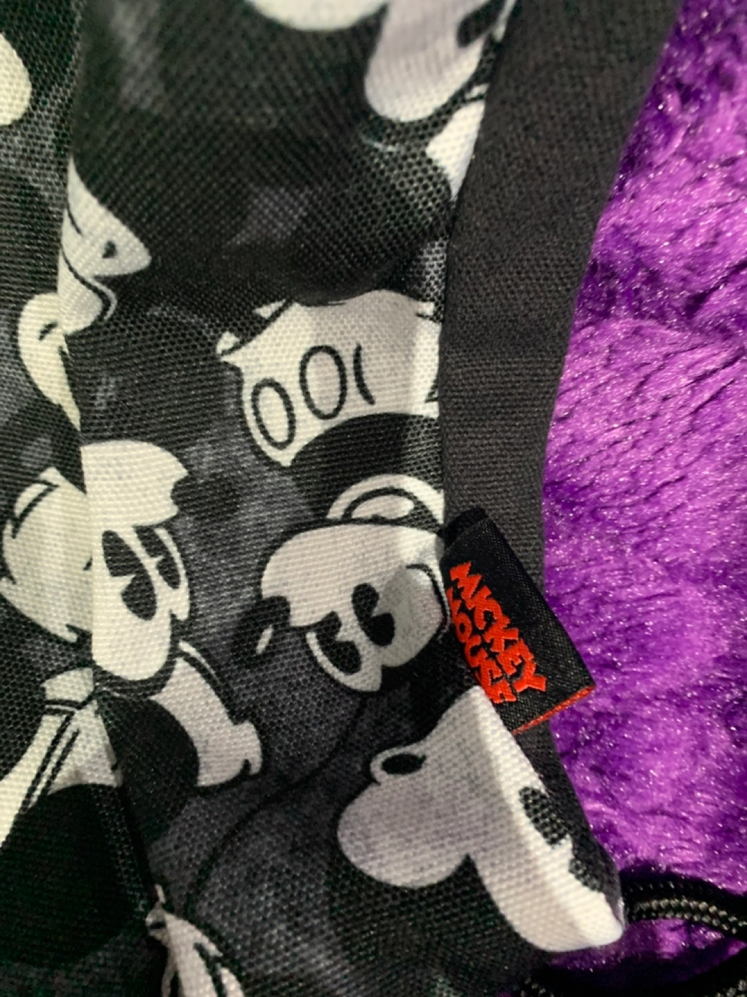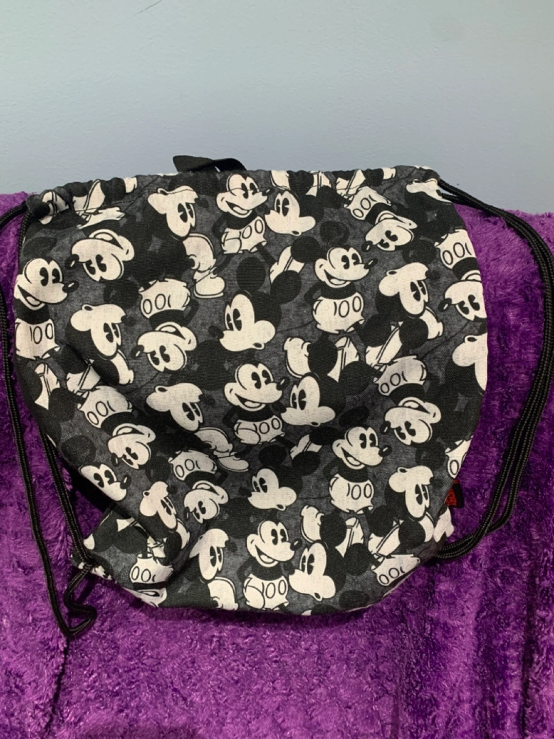 Drawstring closure backpack. Features a black and white Mickey Mouse pattern. Black drawstrings. A perfect item for carrying your essentials to a peaceful day out.