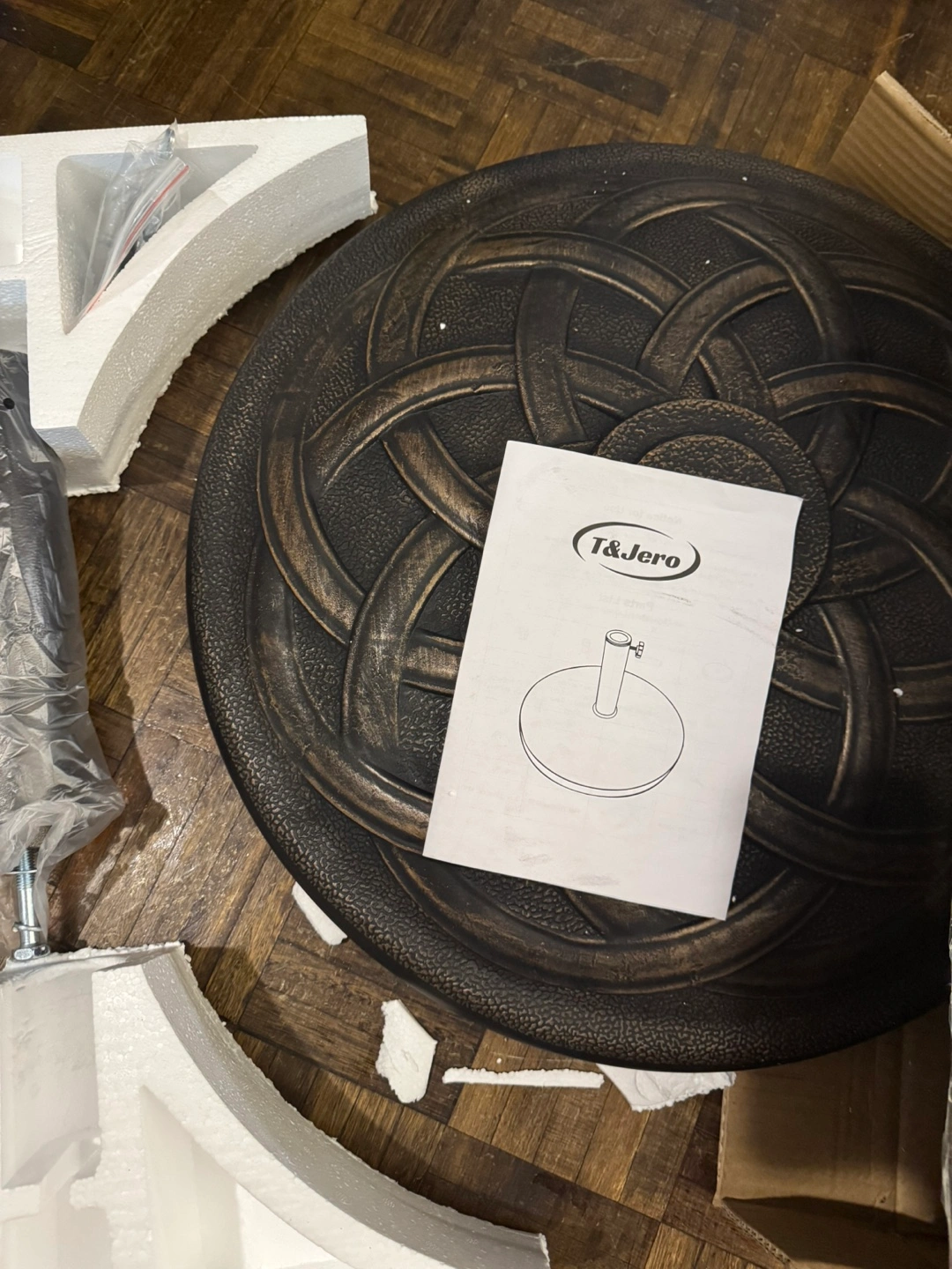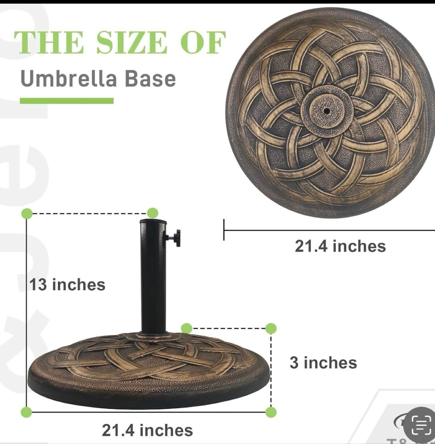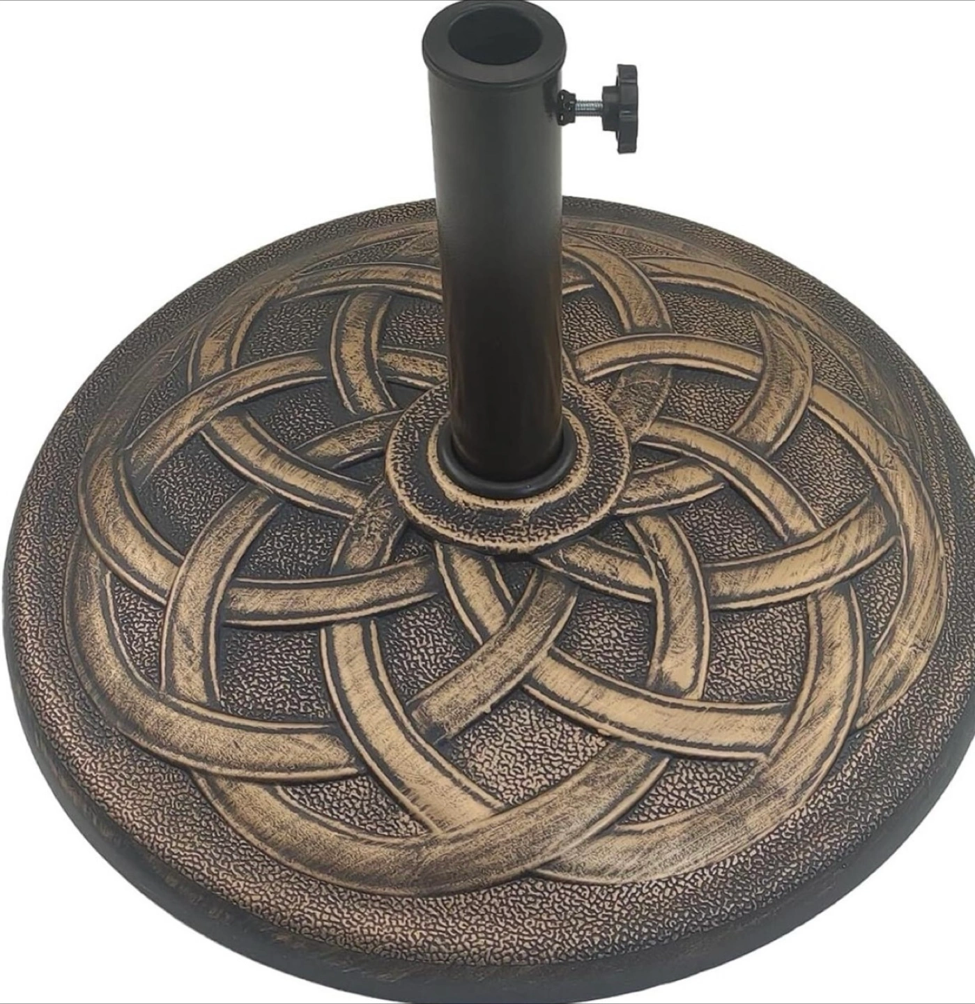 Durability Anti-rust resin concrete material and powder coated metal stem make it everlasting for outside use Elegant appearance Cast iron look with olympic ring pattern and bronze finish add extra ambience Easy to assemble It only takes a few minutes for one person to set it up. No additional tool is needed Maneuverability Equipped with adjustable holders to fit umbrella pole diameter from 1.5 to 2 inch Sturdiness This 21.5" large umbrella base is stable enough to support all sizes of market umbrellas using freestanding or together with a table