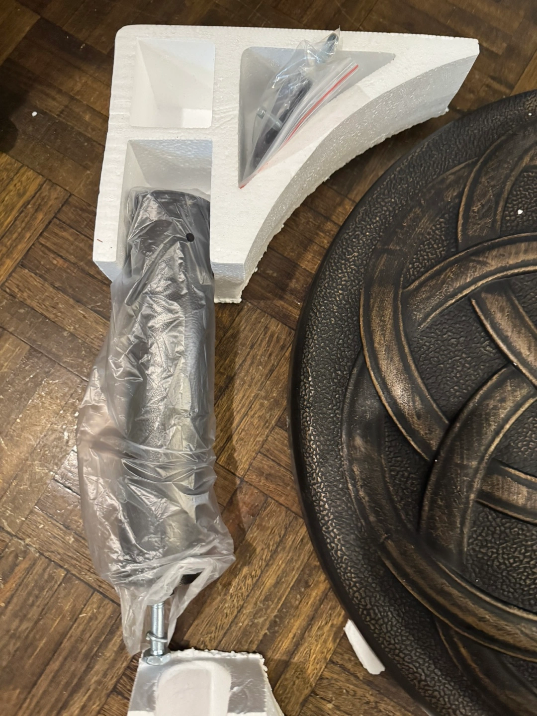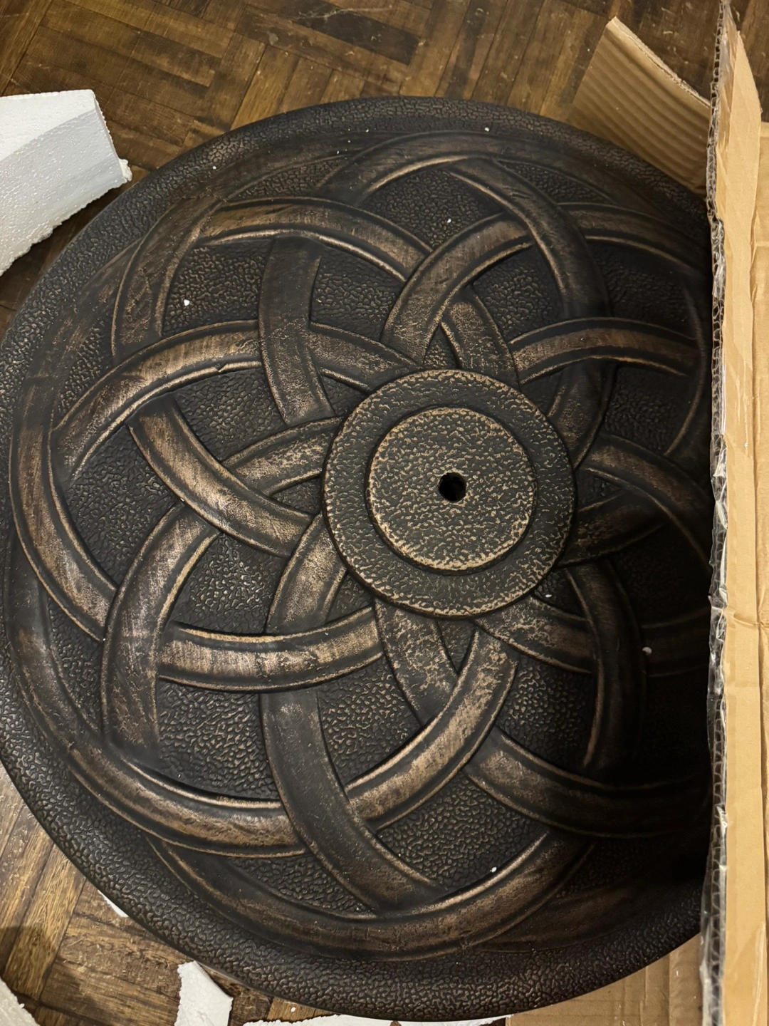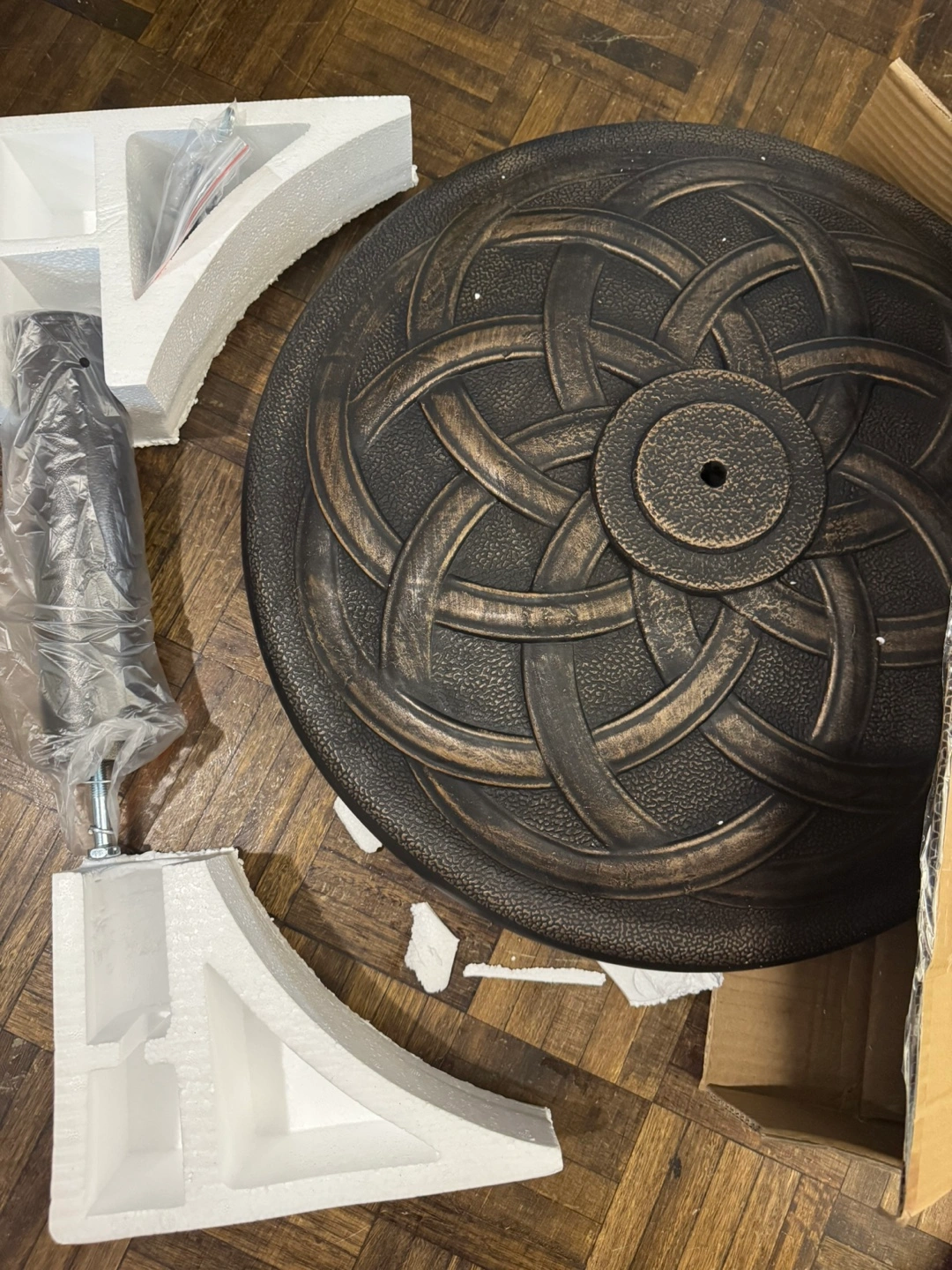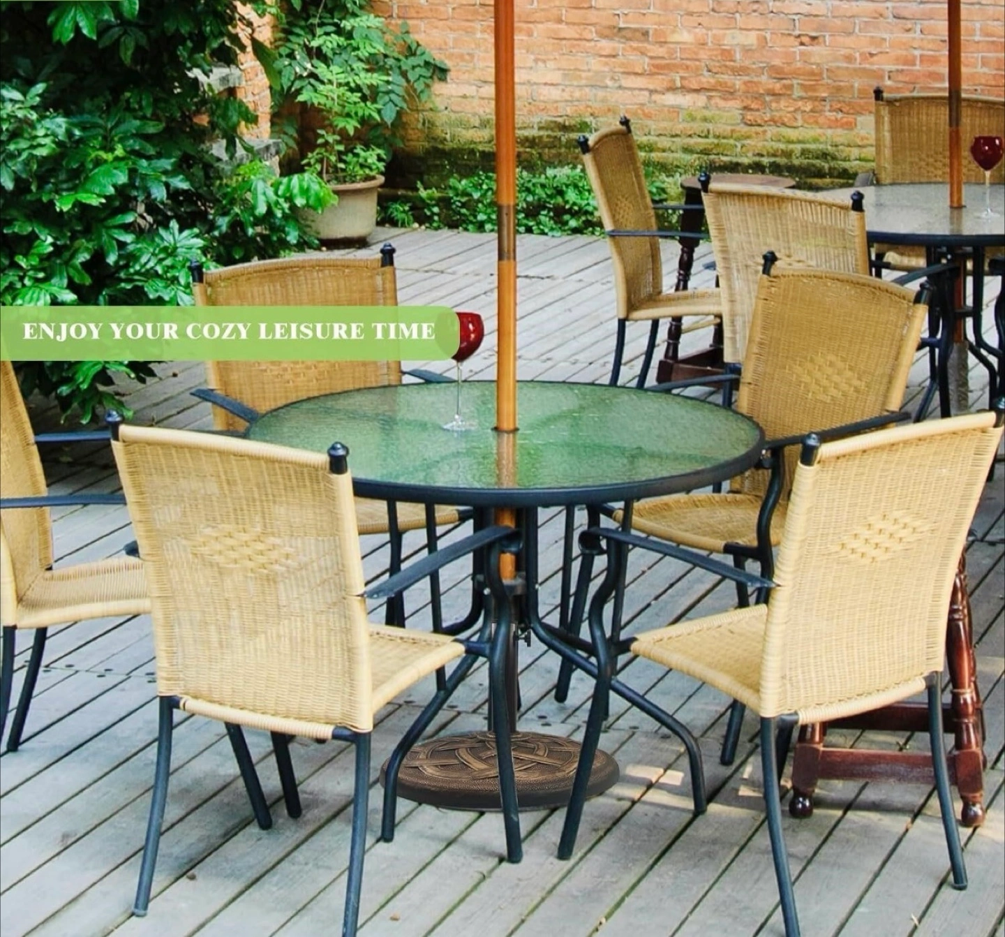 Durability Anti-rust resin concrete material and powder coated metal stem make it everlasting for outside use Elegant appearance Cast iron look with olympic ring pattern and bronze finish add extra ambience Easy to assemble It only takes a few minutes for one person to set it up. No additional tool is needed Maneuverability Equipped with adjustable holders to fit umbrella pole diameter from 1.5 to 2 inch Sturdiness This 21.5" large umbrella base is stable enough to support all sizes of market umbrellas using freestanding or together with a table