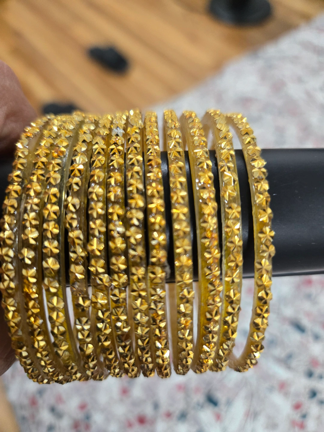 Golden bangles, many of them. Decorated with golden accents. Perfect for daily wear, as a gift or for a special occasion. A beautiful addition to any jewelry collection, providing a subtle sparkle and elegance.