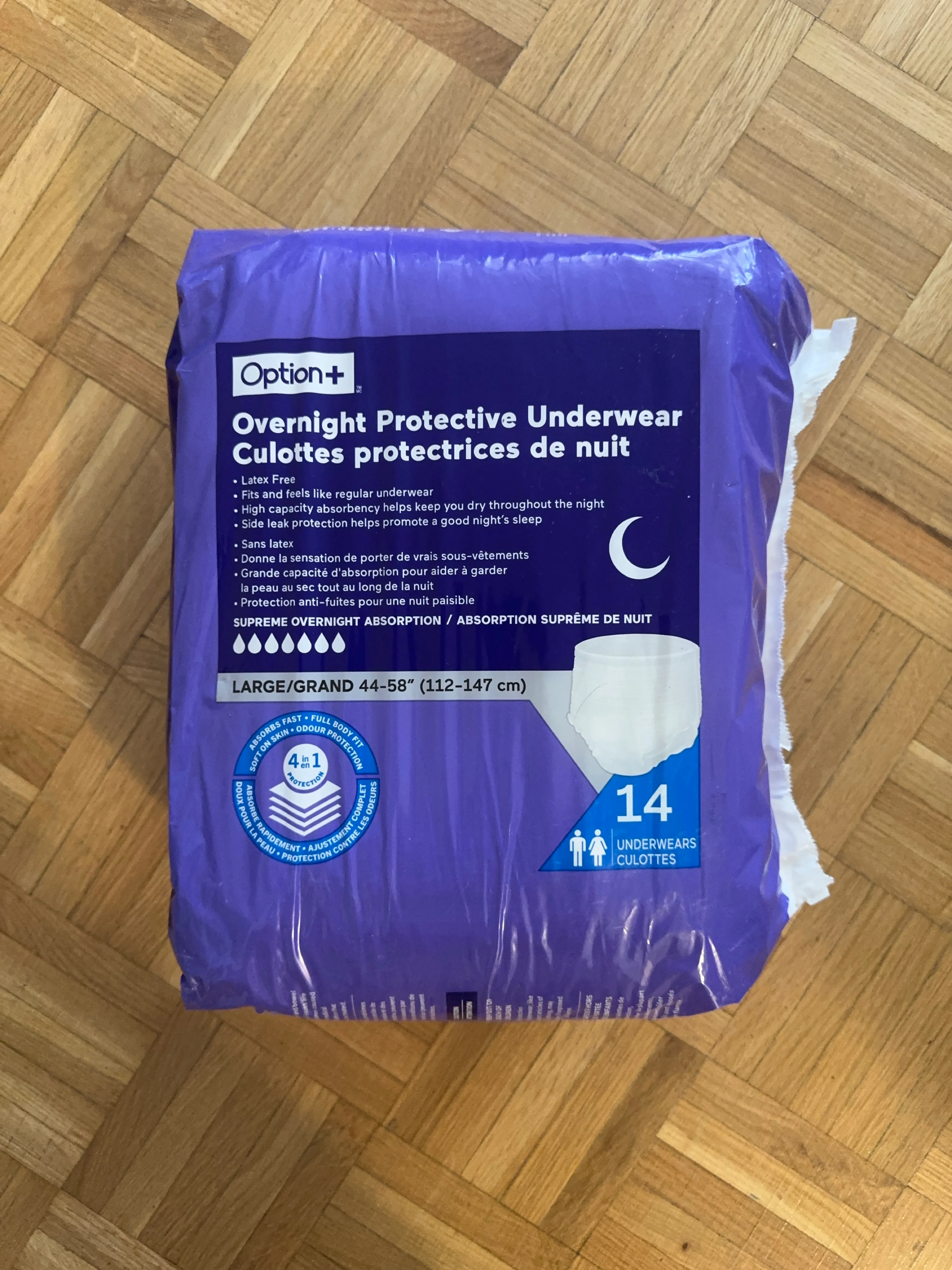 Overnight protective underwear. Large/Grand size. There are 14 pieces included in the package to help you rest easy at night.