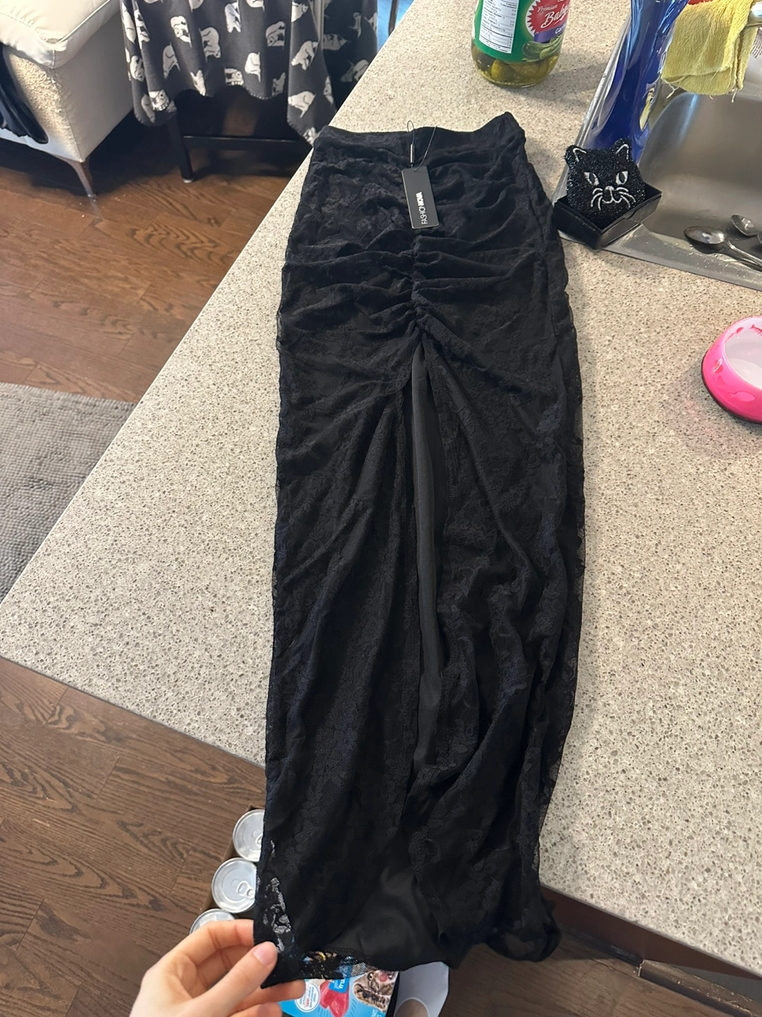 Long, black skirt. Lace detail. Features a side slit. A perfect skirt for a night out. Xs size