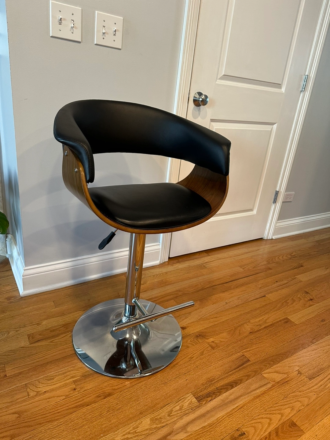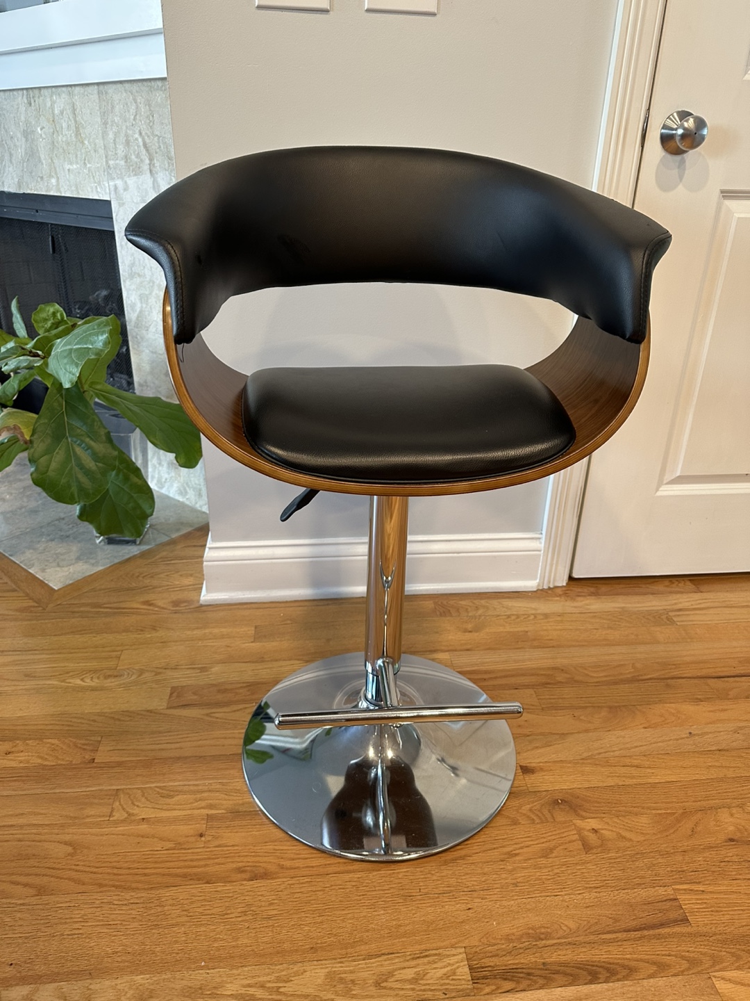 Black padded seat. Wooden curved back. Chrome adjustable base. Perfect for your kitchen island while sipping a morning coffee. Just one, pick up only.