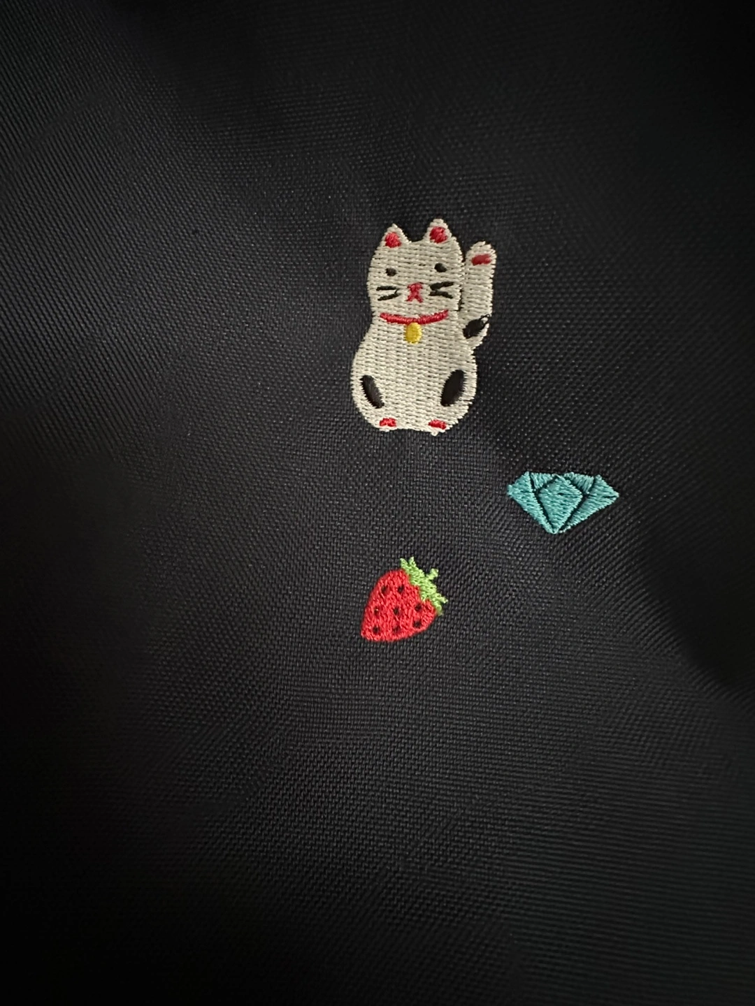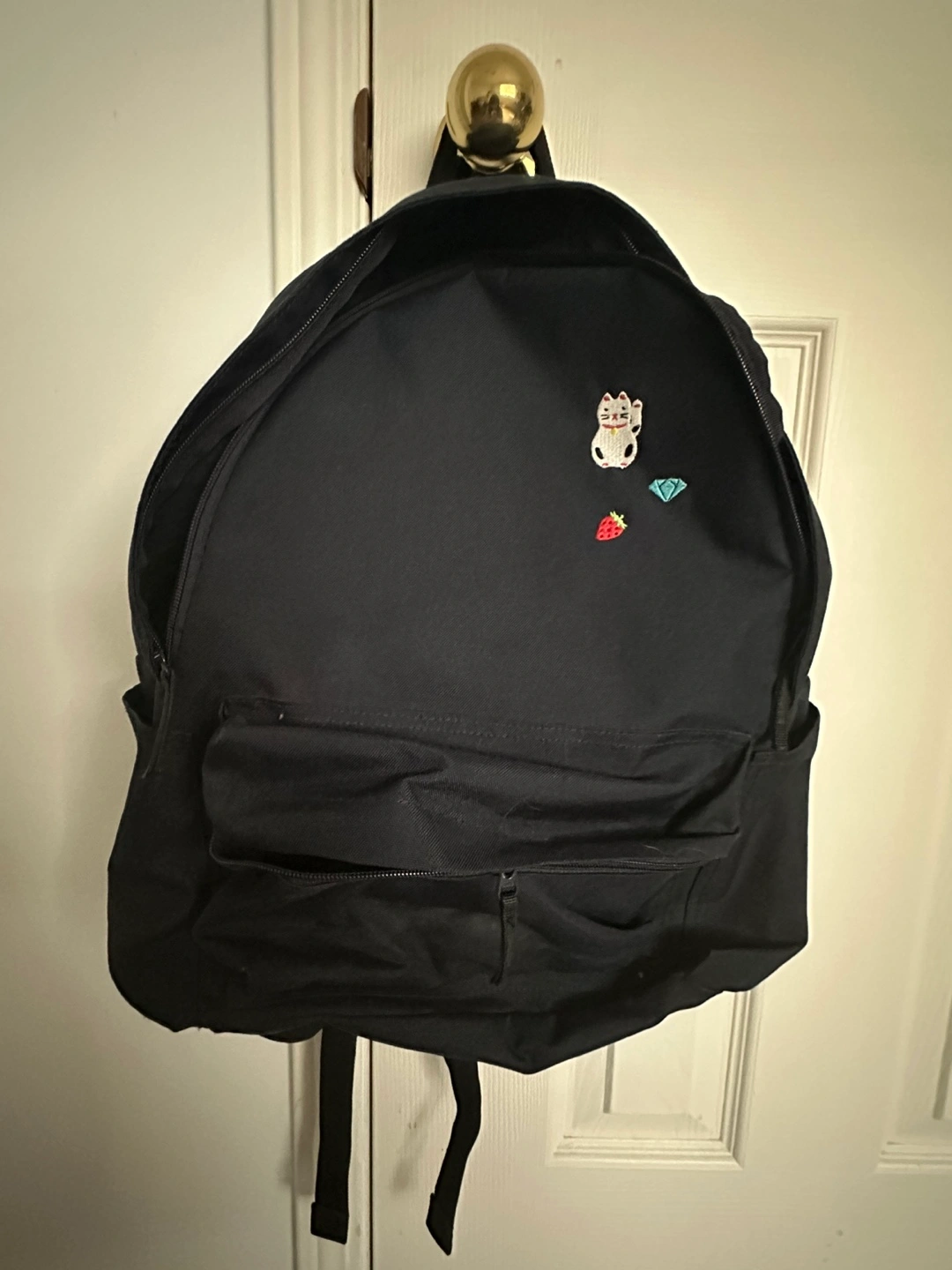 A black backpack with a spacious main compartment. Features a front pocket with multiple compartments. Adorned with embroidered patches. A great way to carry all your daily necessities.