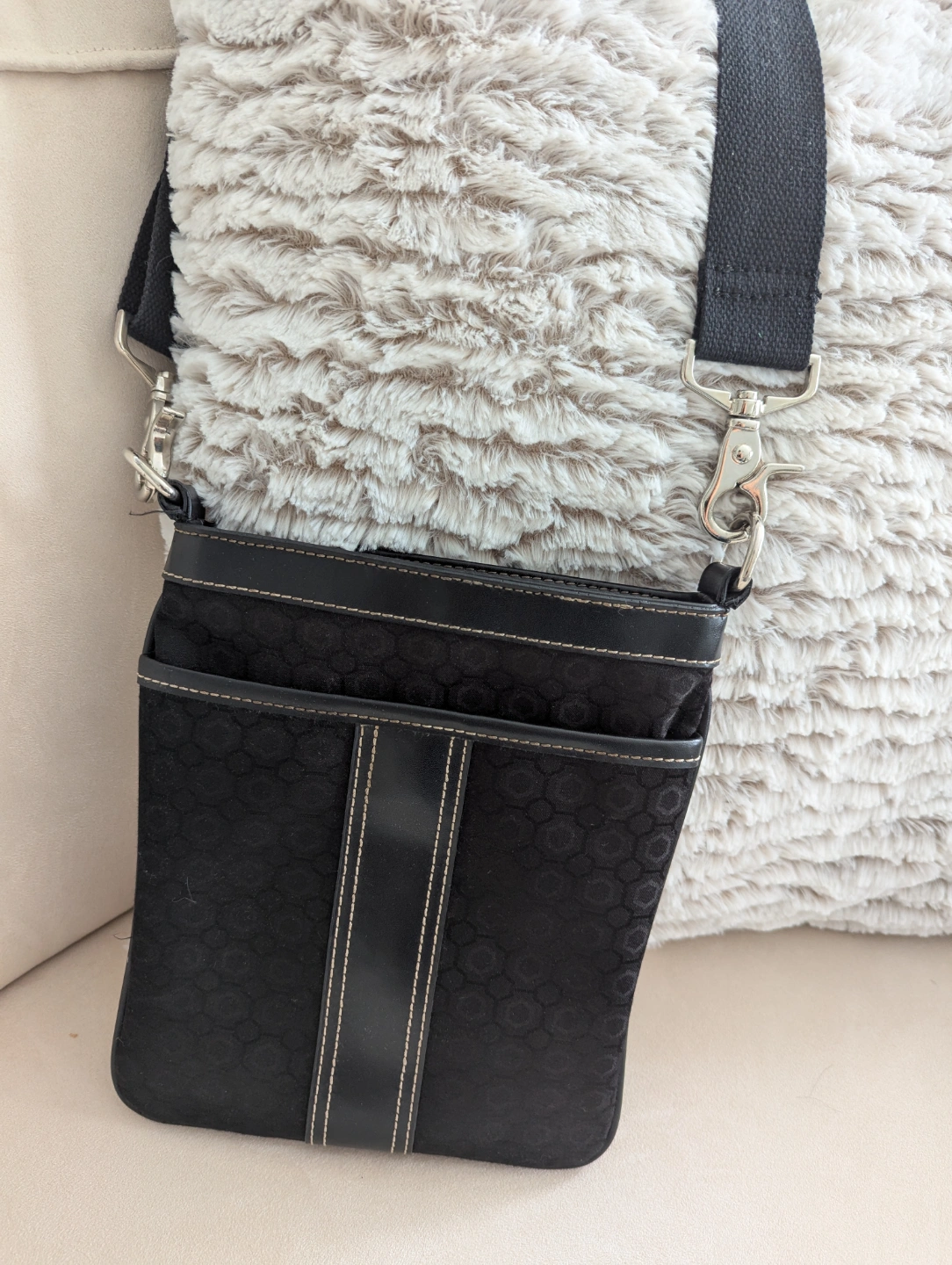 Black crossbody bag. Fabric with a geometric pattern. Includes a long, adjustable strap. Features multiple pockets. You can use this bag when you need to free your hands.