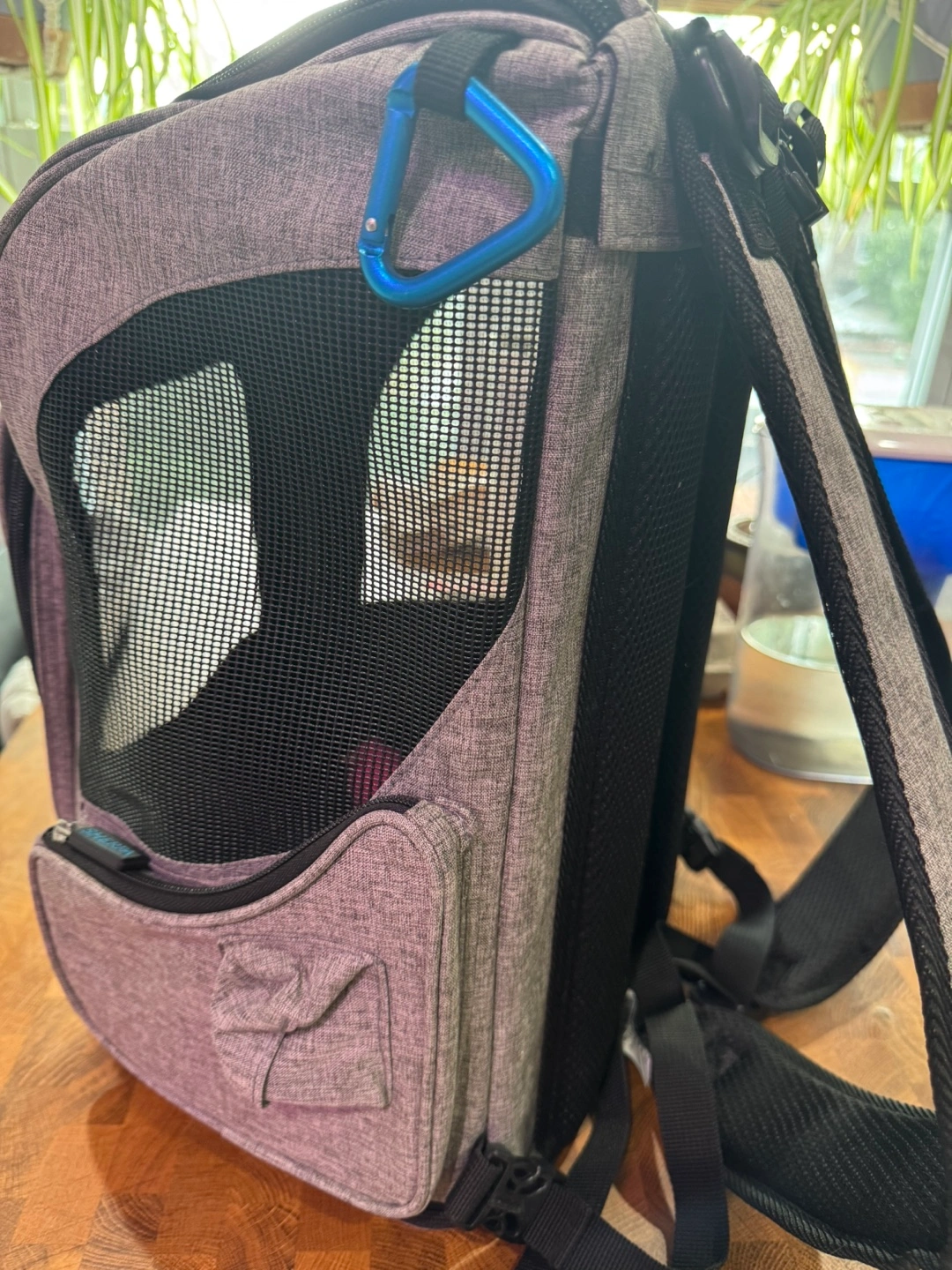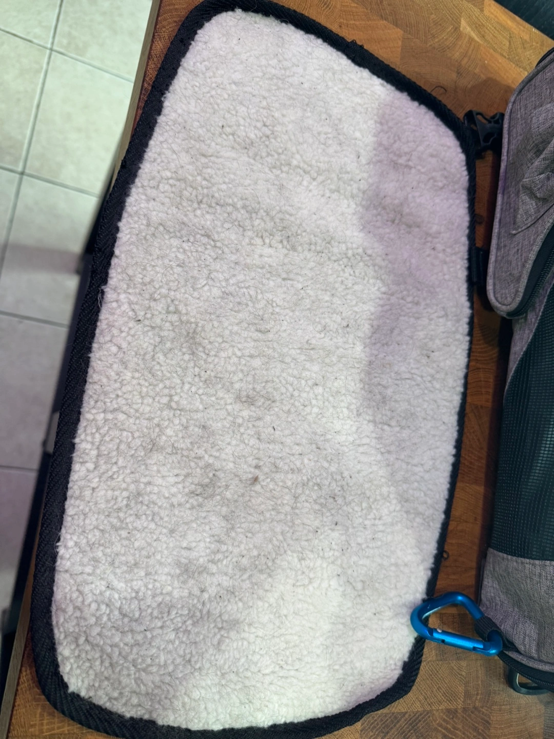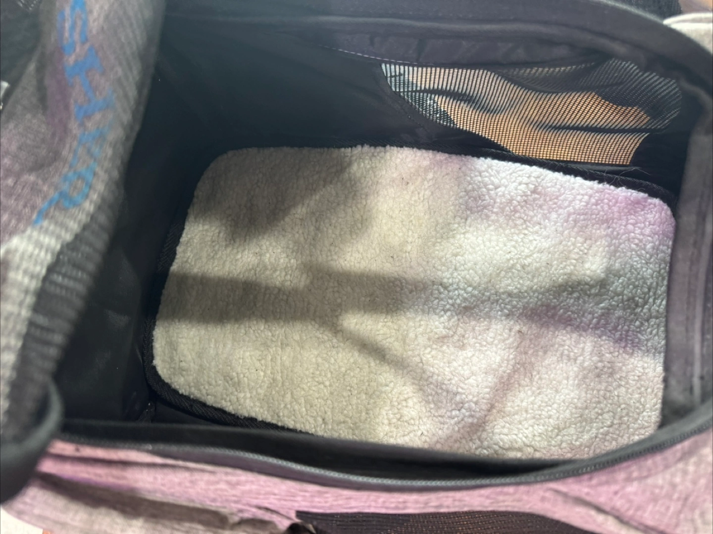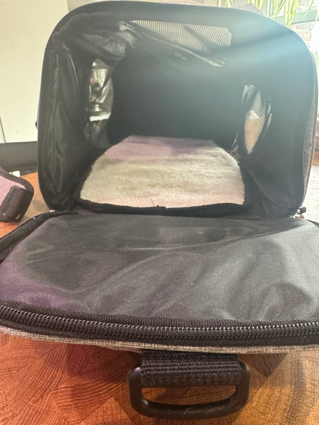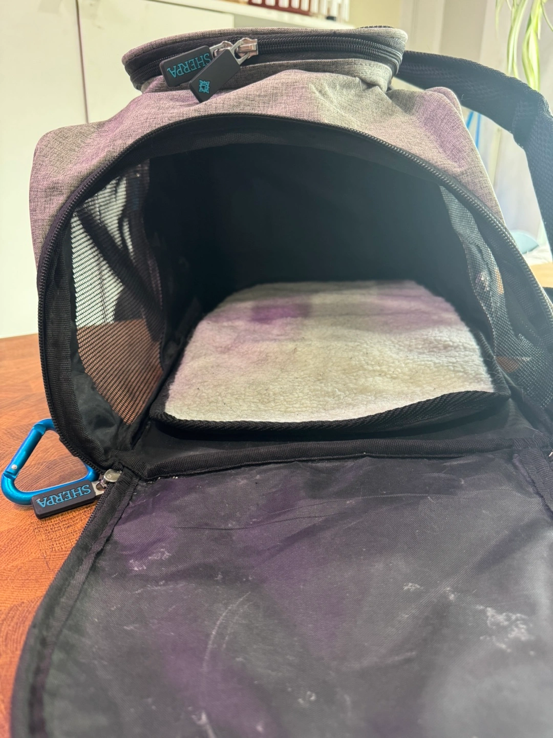 Good as new; no scratches, tears, holes, etc. with both straps and faux lambskin liner. Used once to transport two 3-month old rescue kitten siblings a couple years ago. Has been stored indoors, in a closet since.