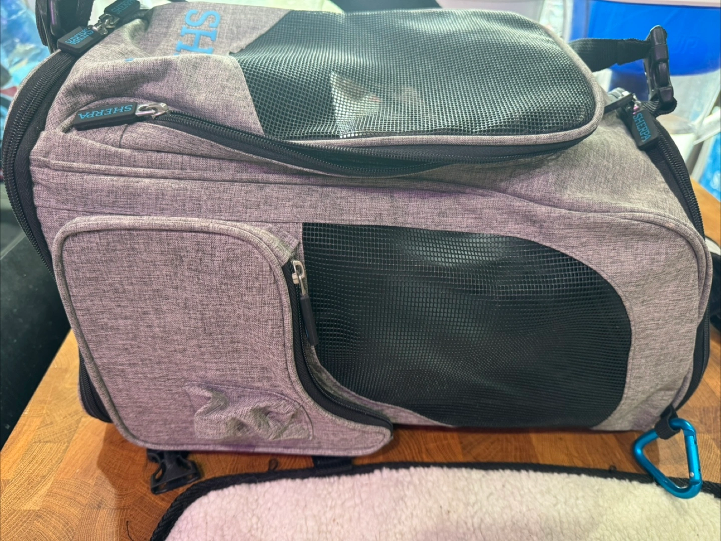 Grey and black carrier. Mesh windows and multiple zippered compartments. Carrying handle and shoulder straps. Consider this carrier as a cozy getaway for your pet.