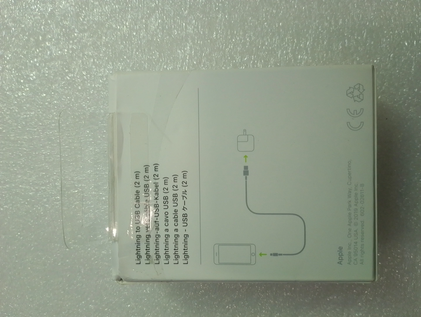 A white rectangular box. The front displays an illustration of a cable. The back has some writing in different languages. This item is perfect for charging your devices without being stressed by a short cable.