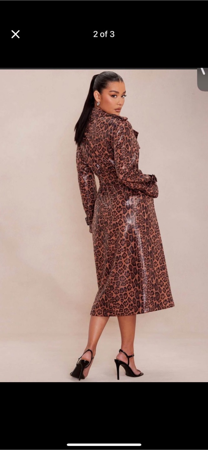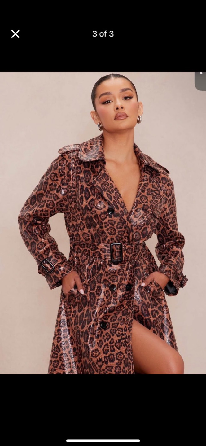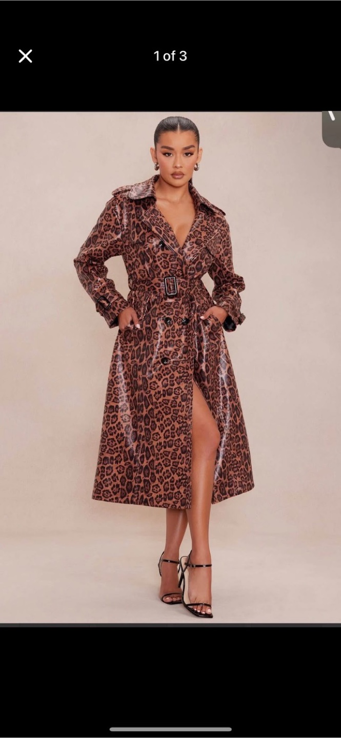 A trench coat in a vibrant leopard print. Featuring a belted waist. Great for making a style statement. Message for more information.