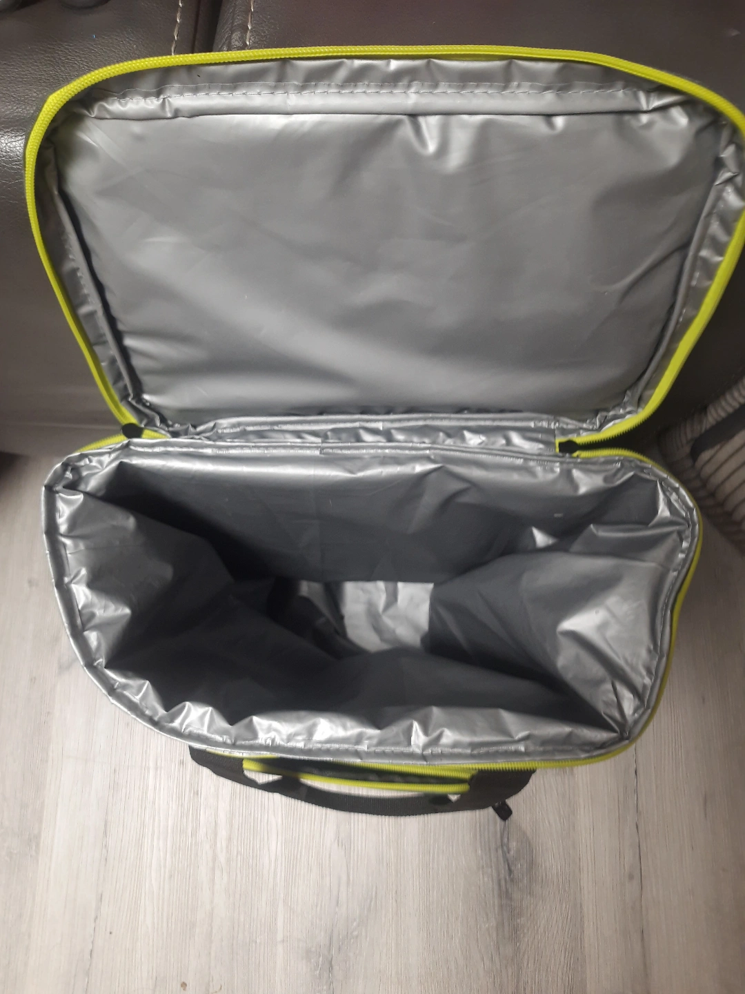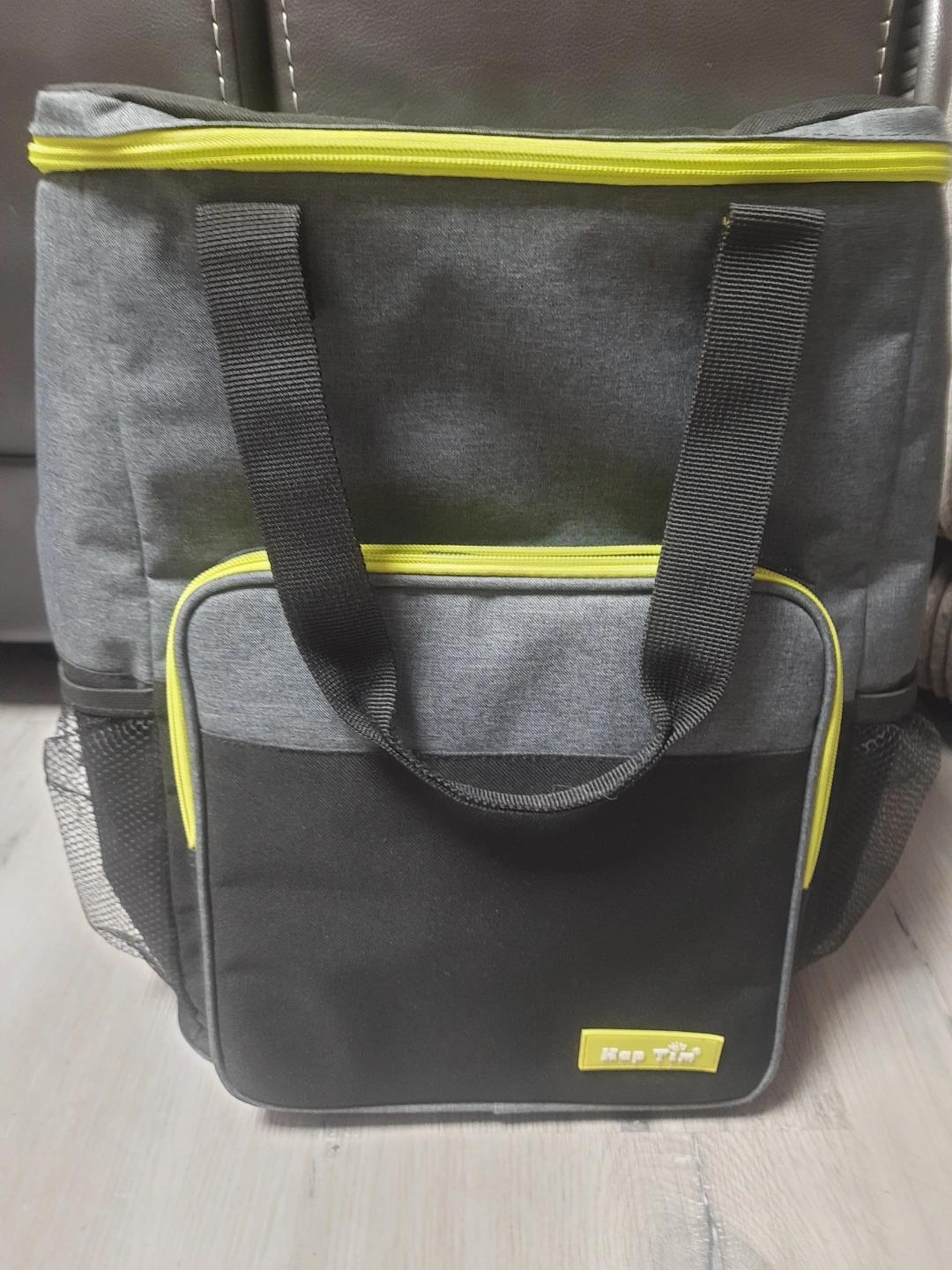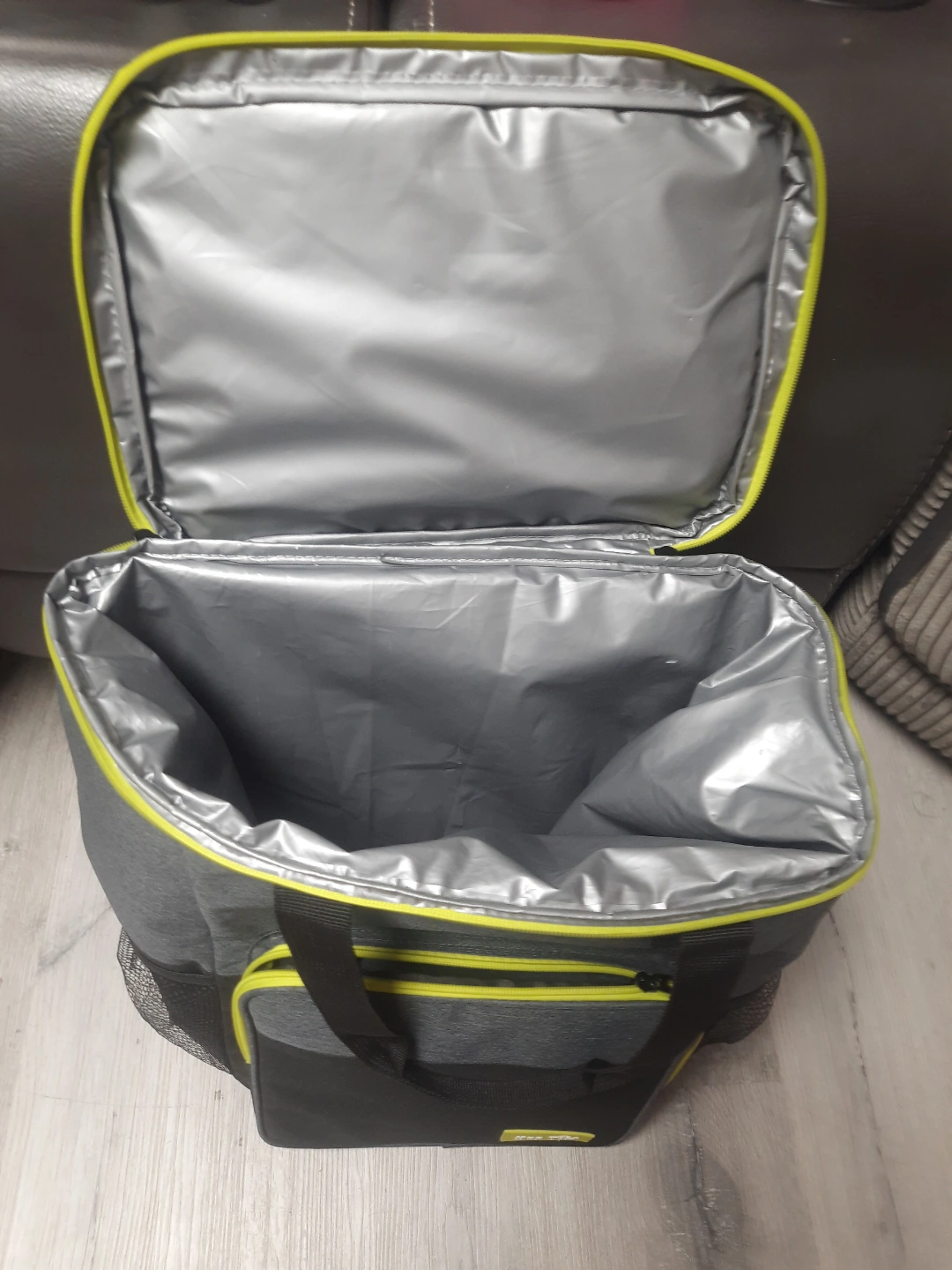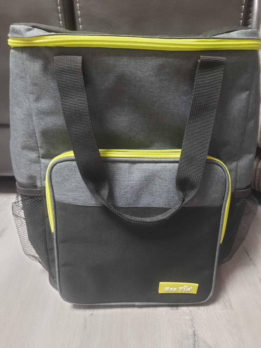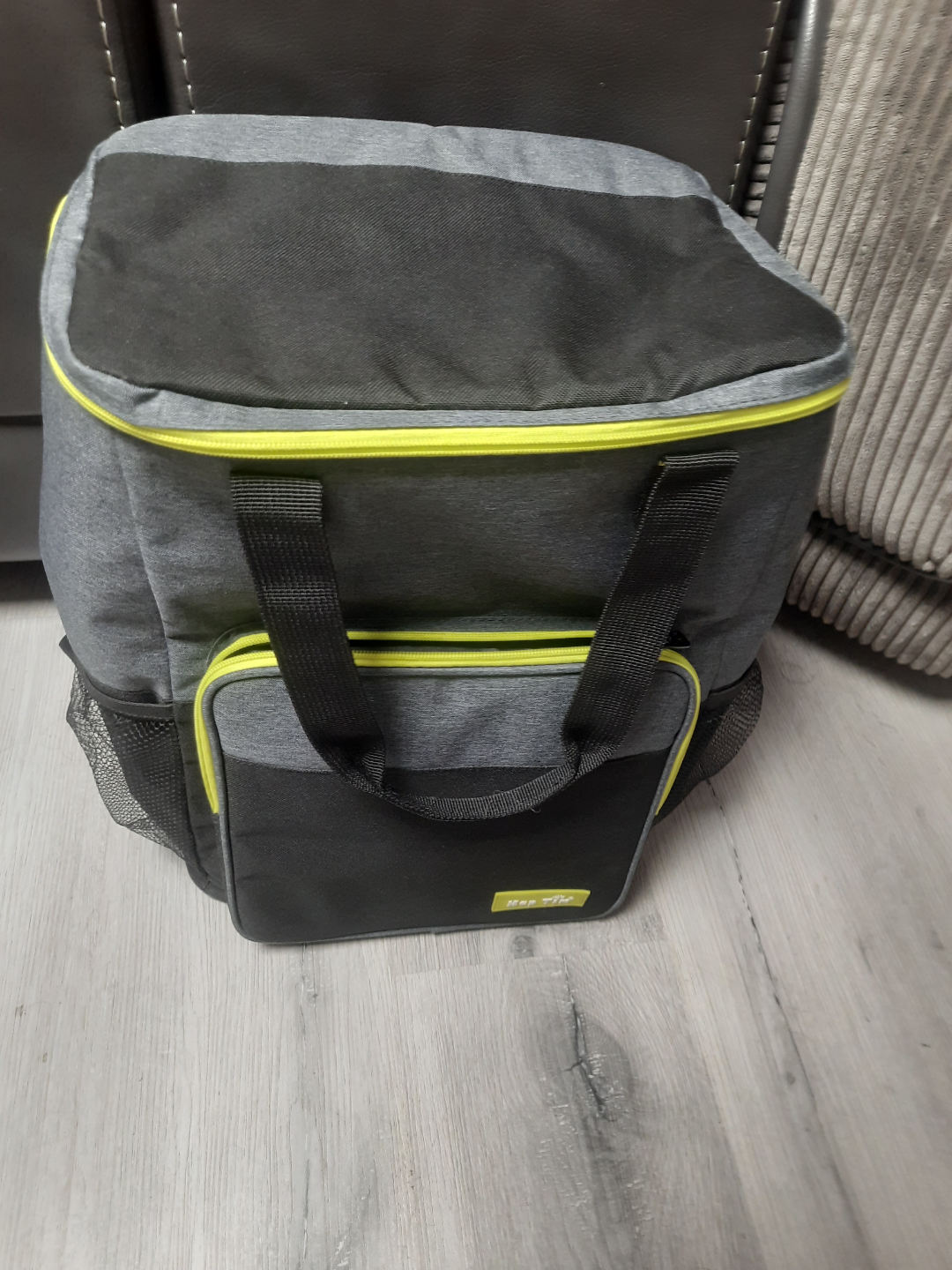 Grey and black delivery bag with yellow detailing. Has a front pocket and mesh side pockets. A great bag for keeping your food and drinks fresh for a picnic.