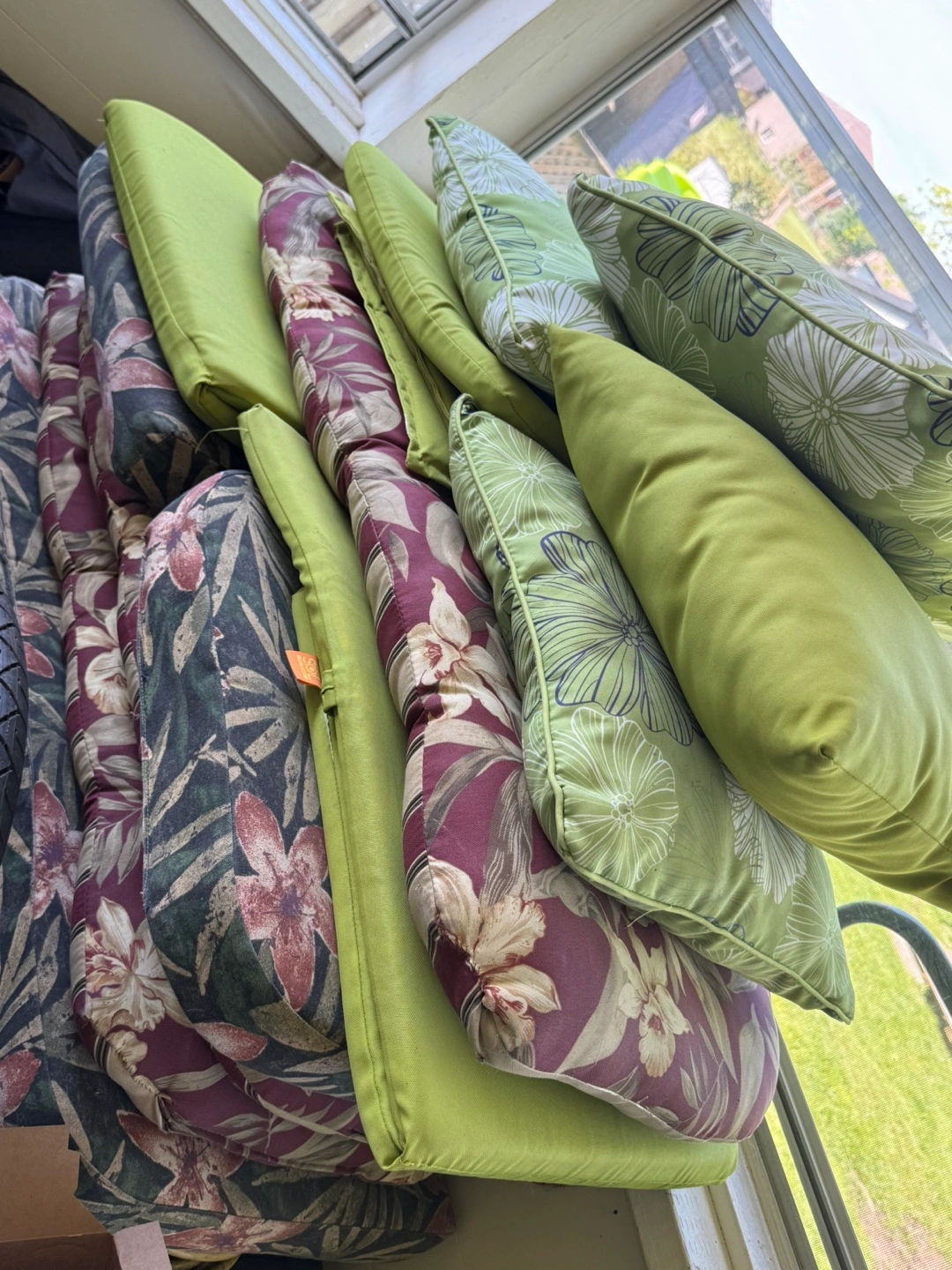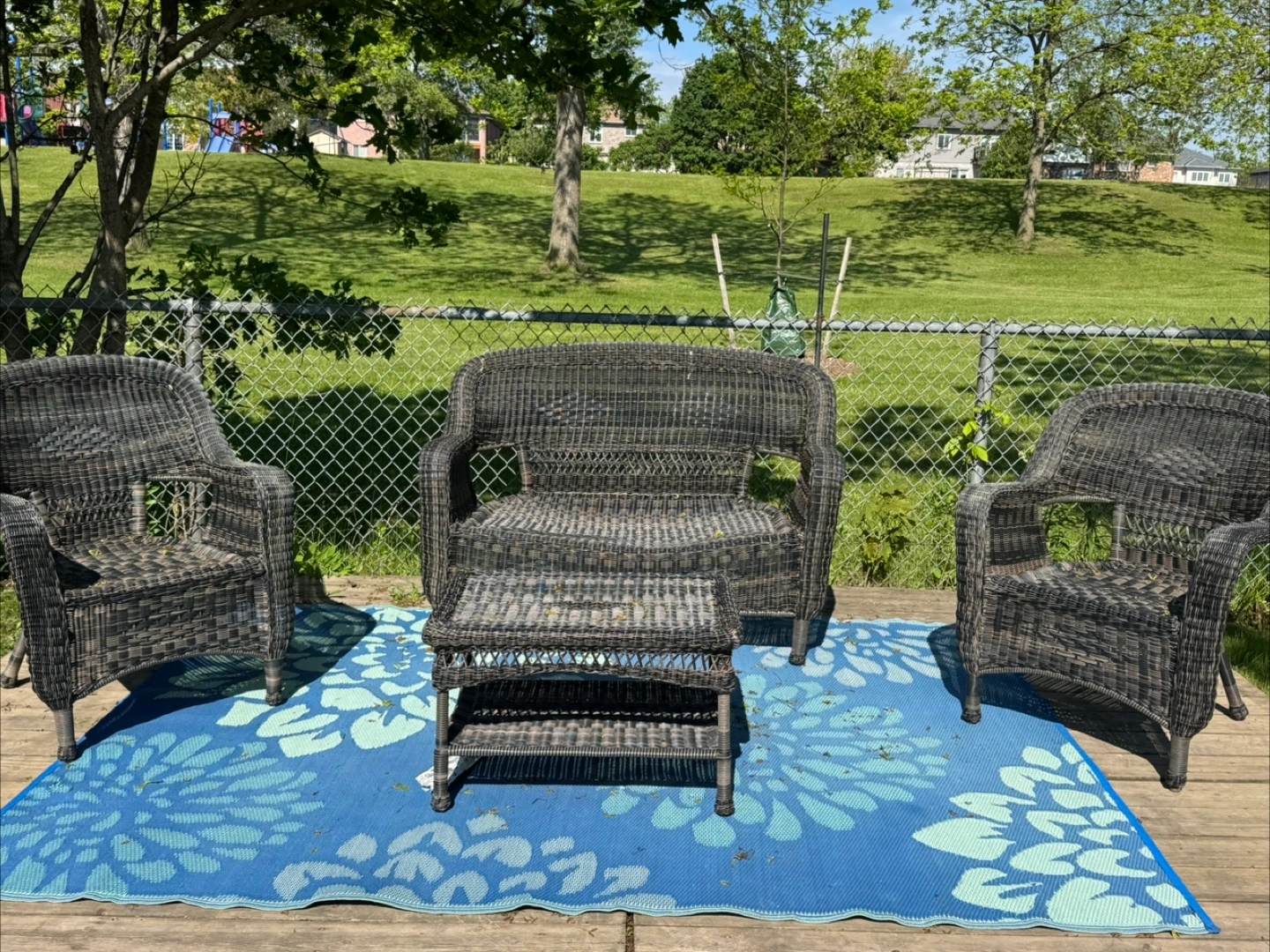 Wicker patio set. Includes a loveseat, two chairs, and a small table. Cushions & pillows included & outdoor rug . It's a great idea to enjoy the fresh air and relax after a long day. $200 obo