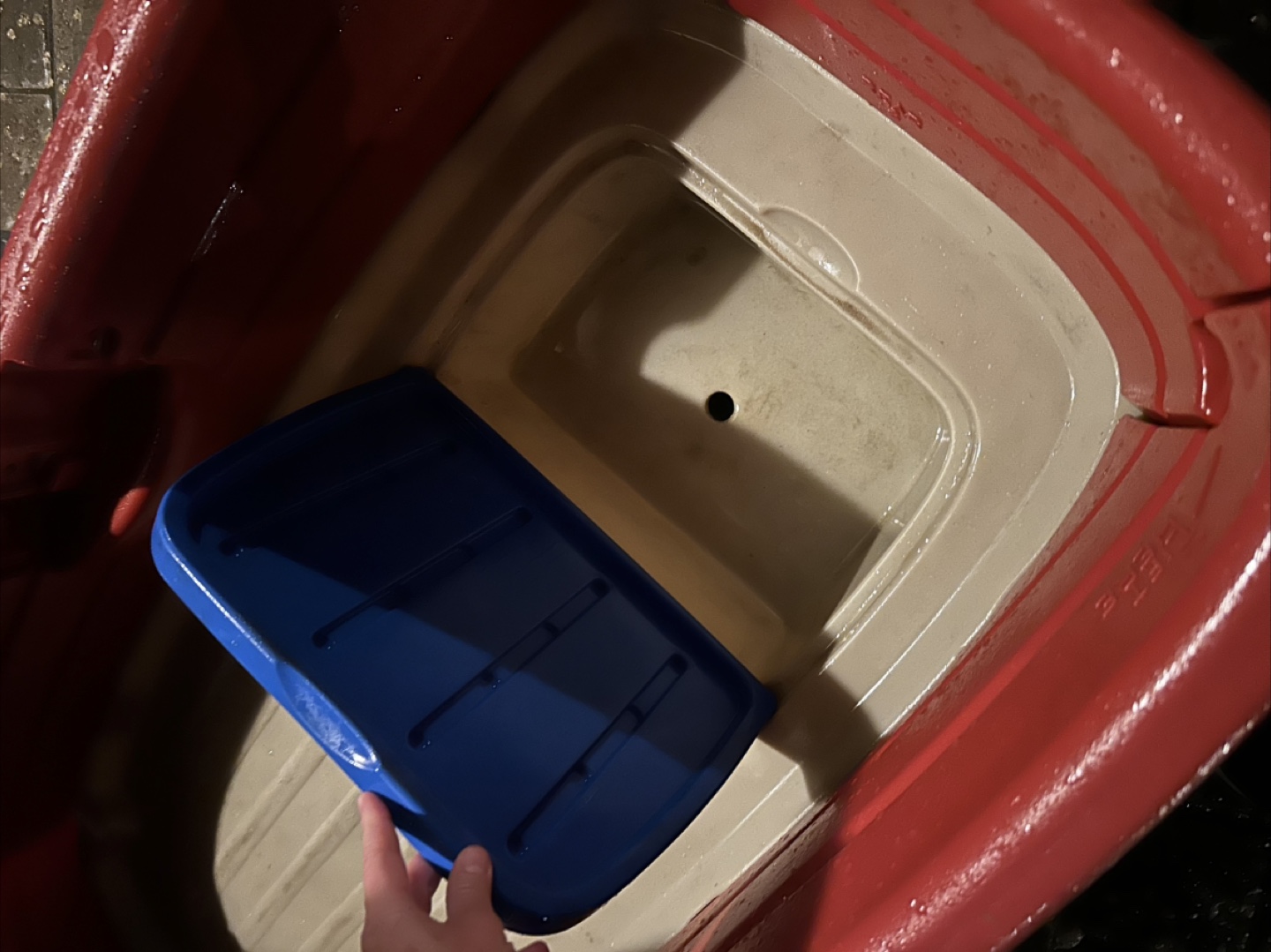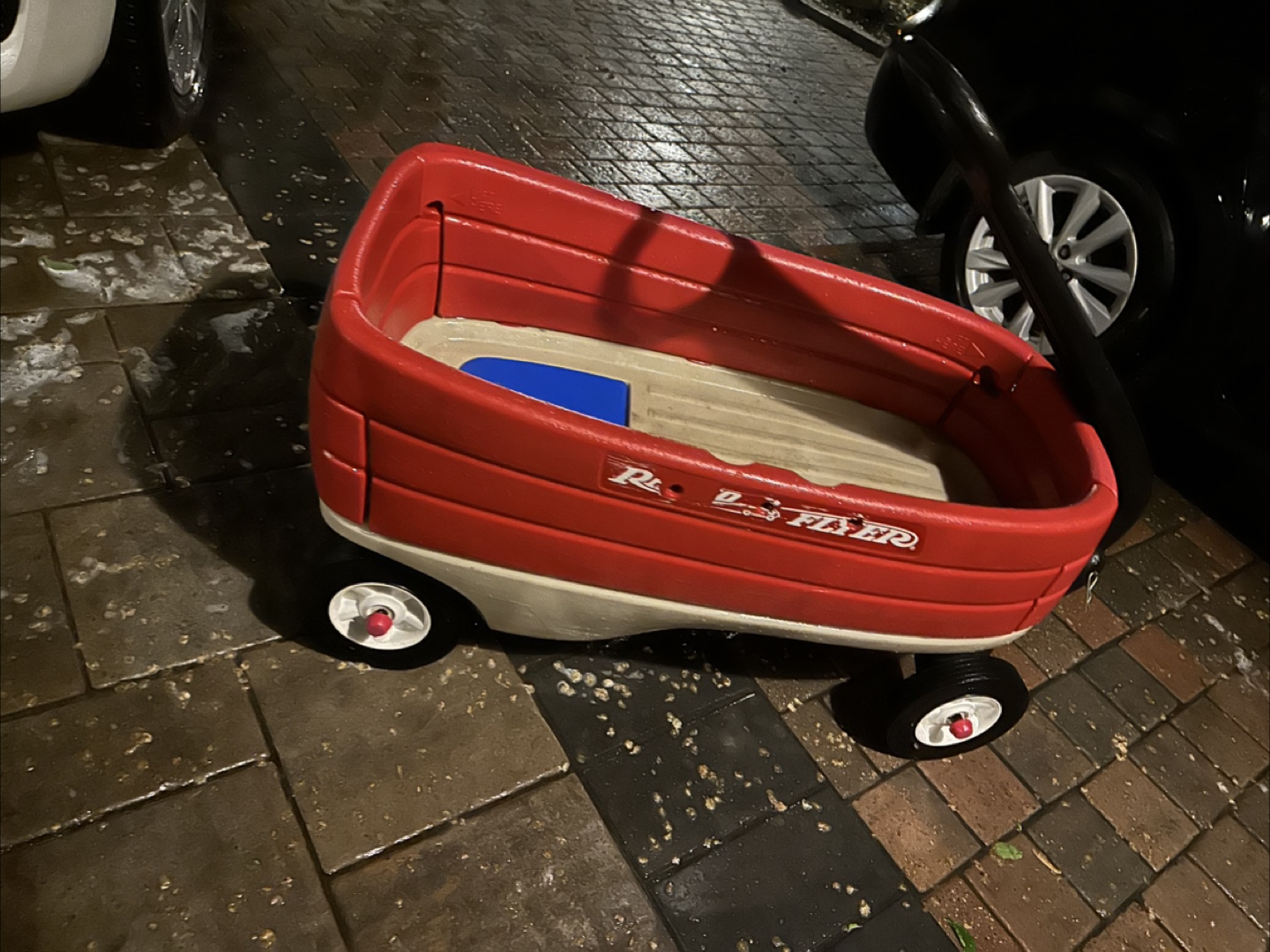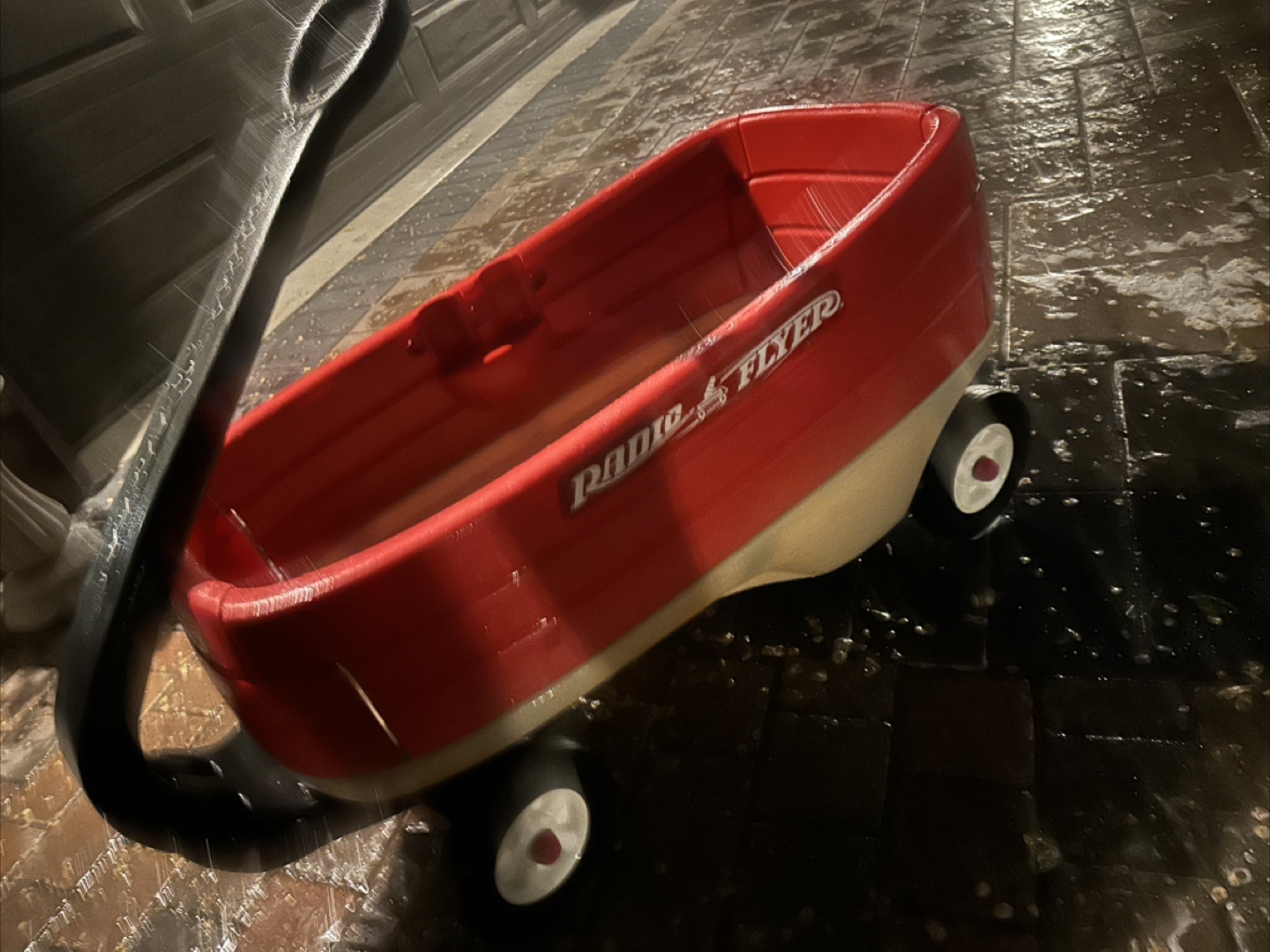 A red wagon with a red and beige bed. The wagon has four wheels with white tires. A black handle to pull the wagon. Consider this wagon for a leisurely stroll around the neighbourhood. $120 OBO goes for $285 on Amazon new mines used but good condition I even gave it a quick wash and scrubbed it with soap and rinsed it and let it dry