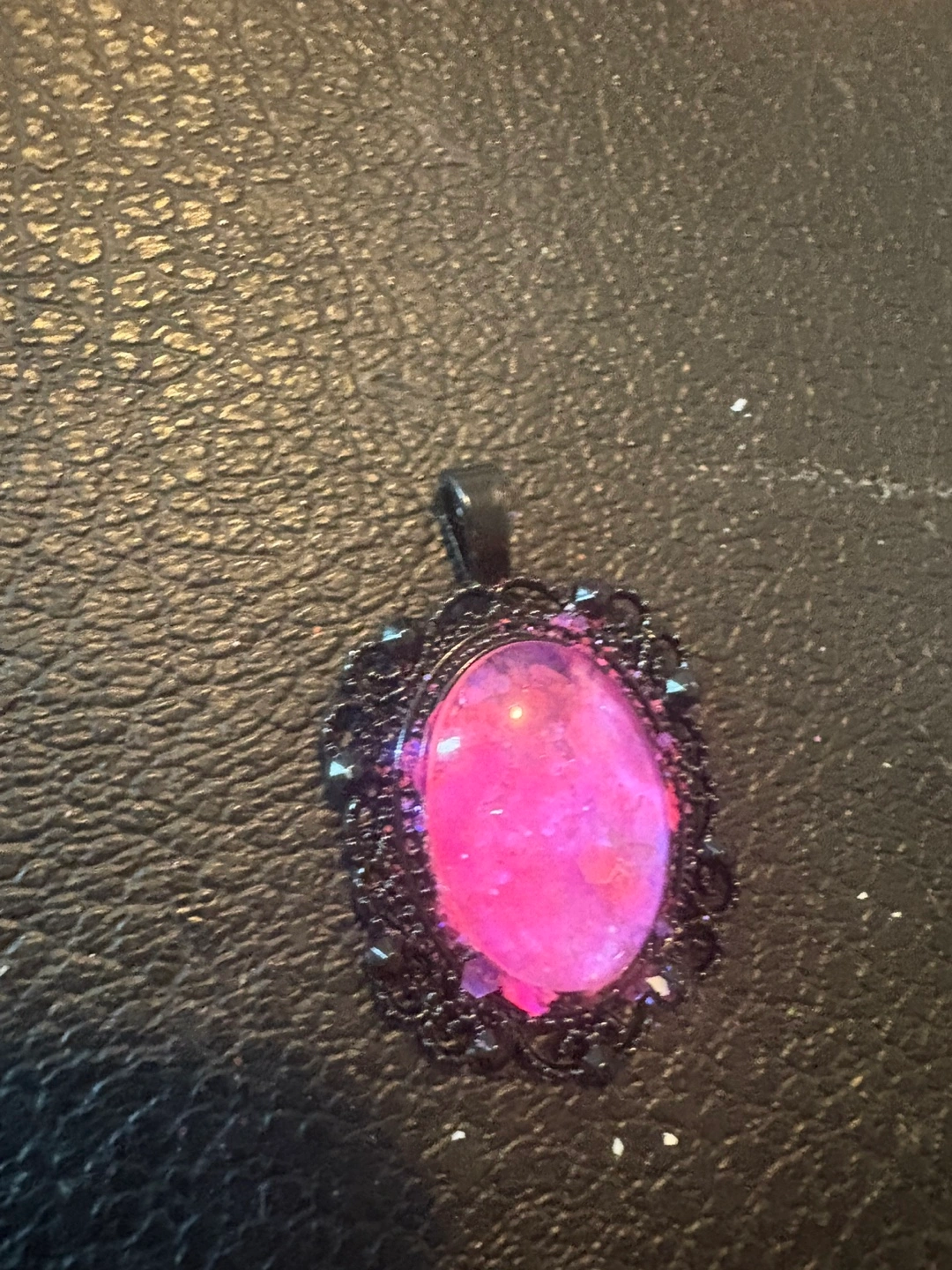 Oval shaped pendants with different colours. Each pendant framed in a black ornate design. A wonderful accessory to enhance your look, creating a sense of calm and style.