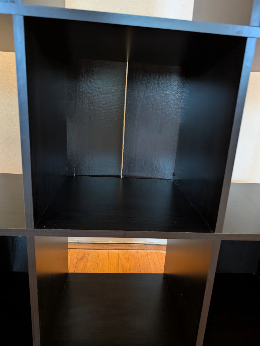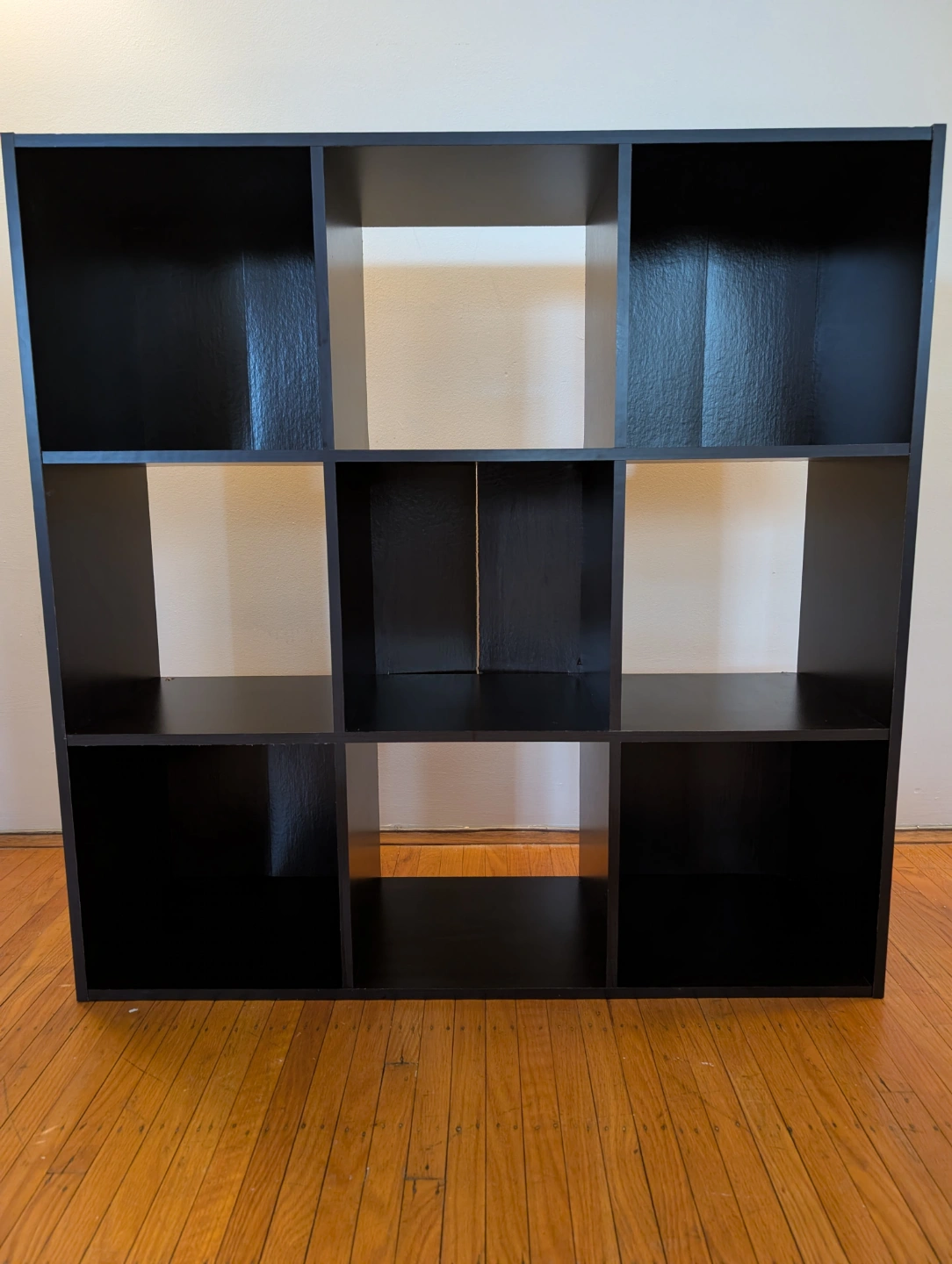 Cube shelving unit. Constructed with a dark finish. Features a grid-like design with multiple cube compartments. Use it to create a sense of order and tranquility in your space.