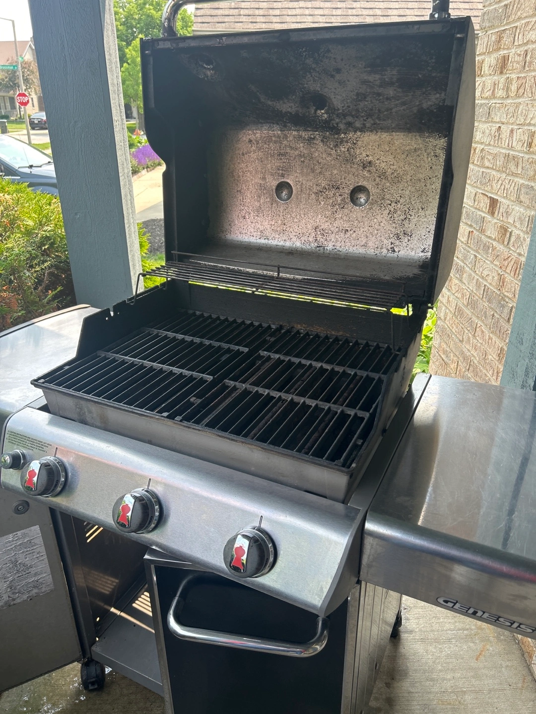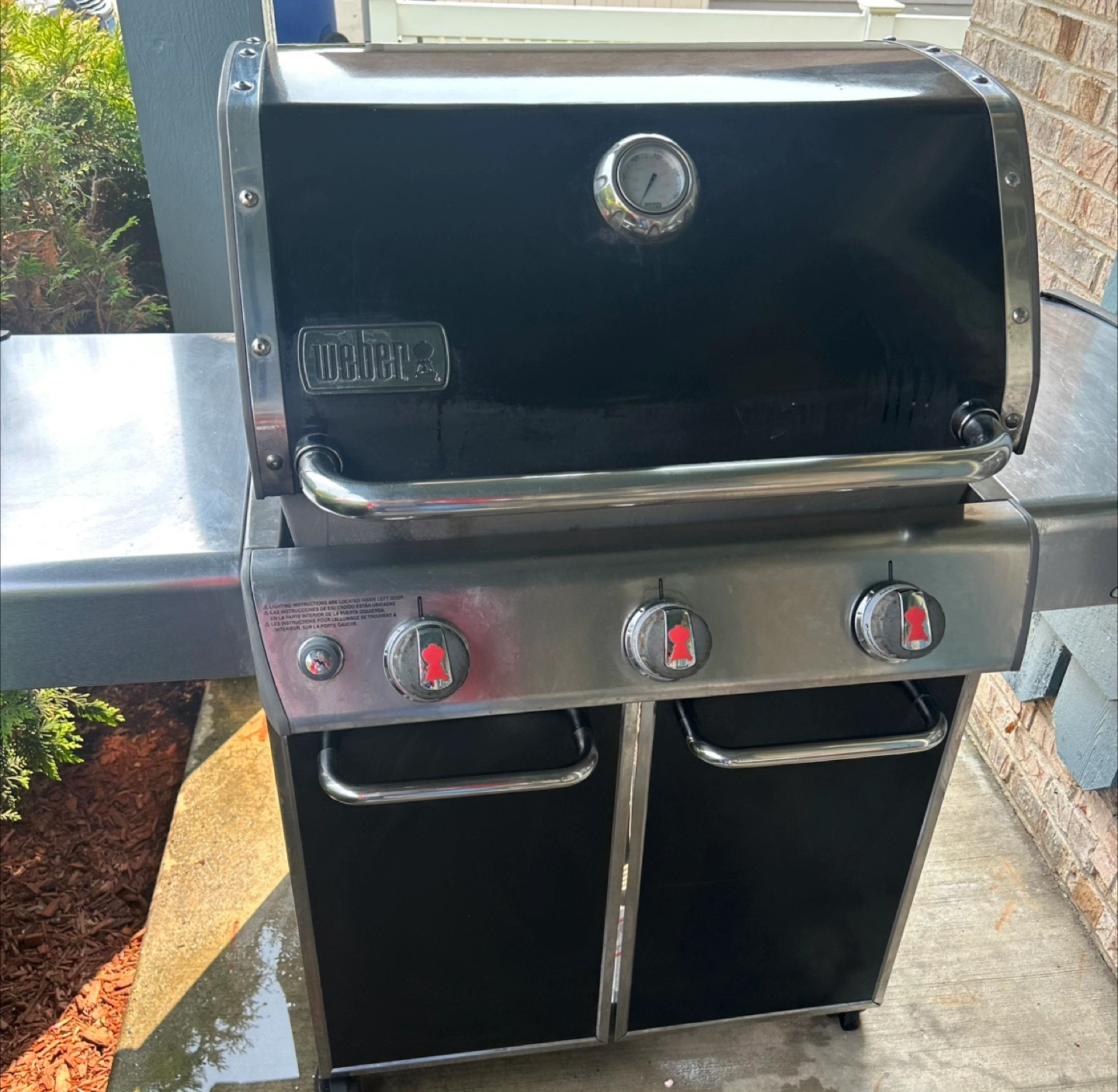 Weber Genesis Outdoor cooking grill. The grill features a black top with a temperature gauge. It has three burners and a stainless steel body. A great grill is perfect for any outdoor space, where you can enjoy the company of loved ones.comes with instructions manual.