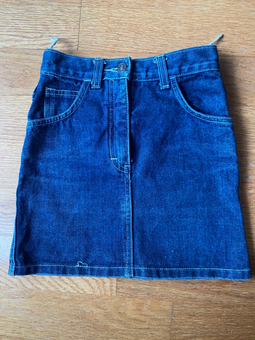 Dark blue denim skirt. Classic style with pockets in the front and back. Button closure. A lovely skirt for any occasion, allowing you to look stylish while remaining comfortable.