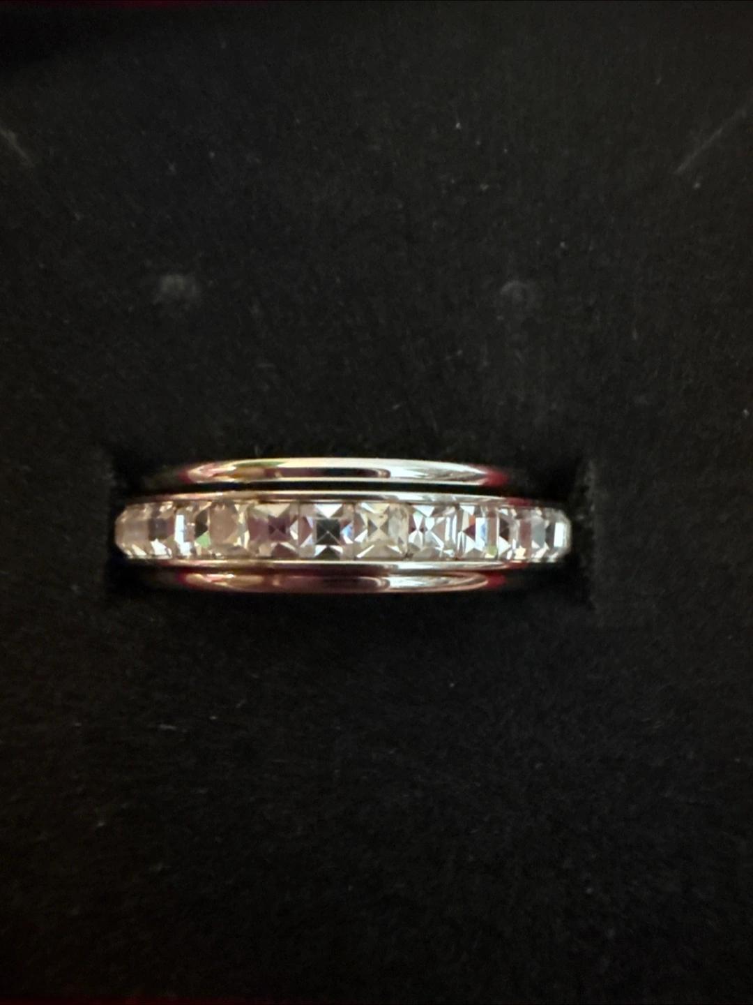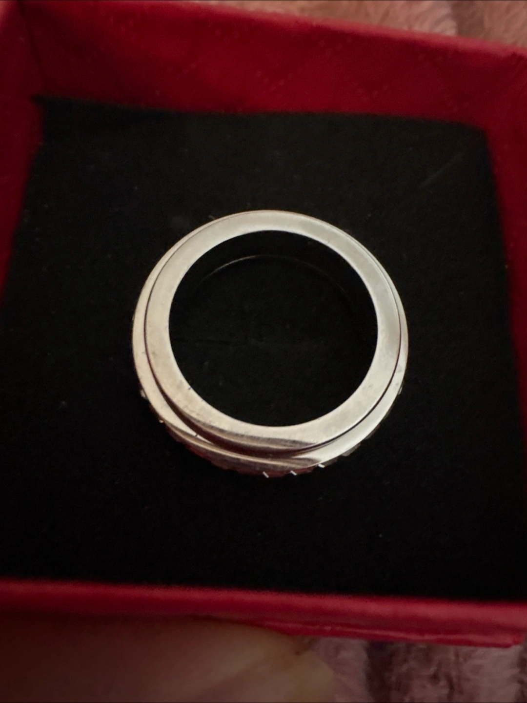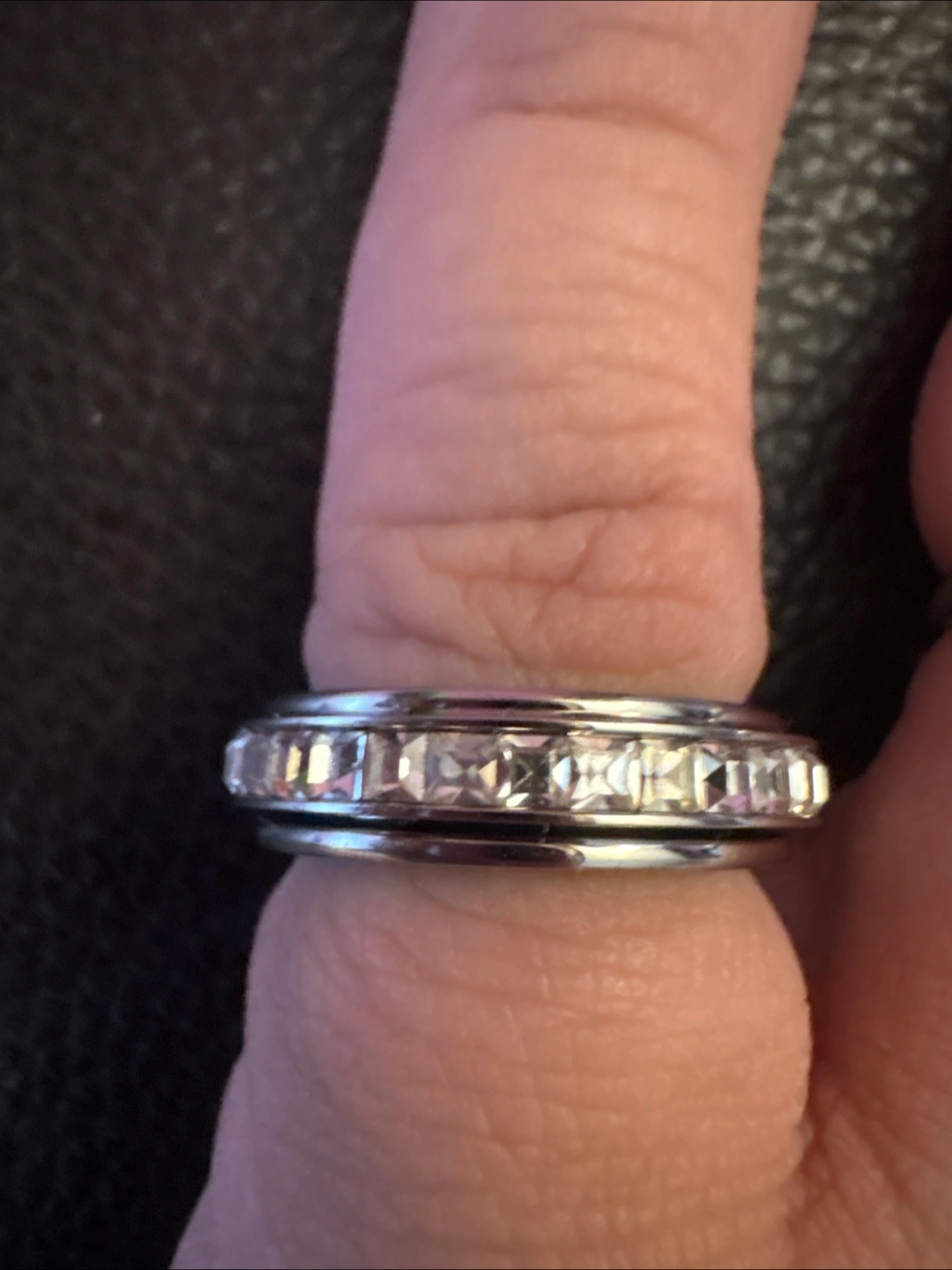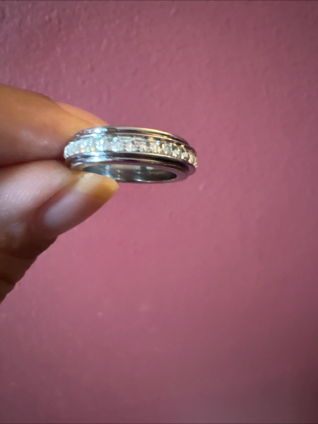 Silver Stainless Steel Spinner band ring with clear CZ stones around the outer layer. Wear it when you need a bit of sparkle to brighten your day.