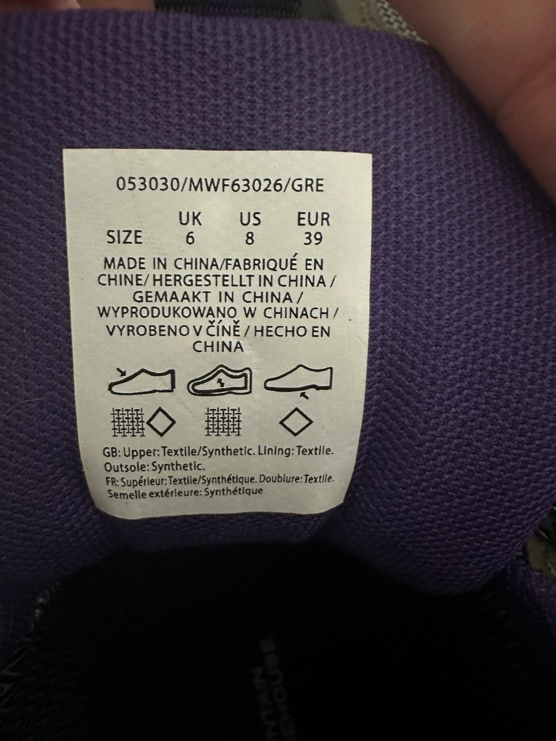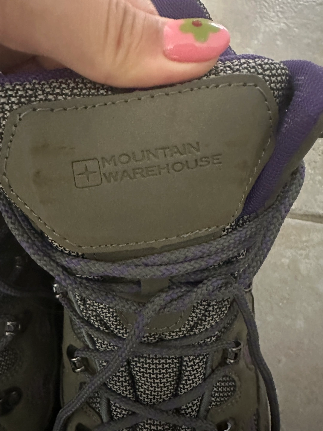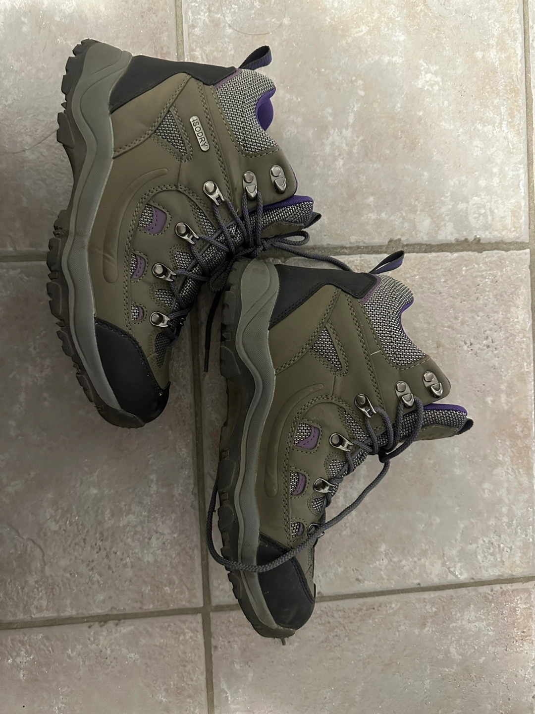 Hiking boots with laces. Olive green and purple colouring. Features the brand name on the tongue. Going for a walk in these would be a perfect way to relax and de-stress. Only wore once.