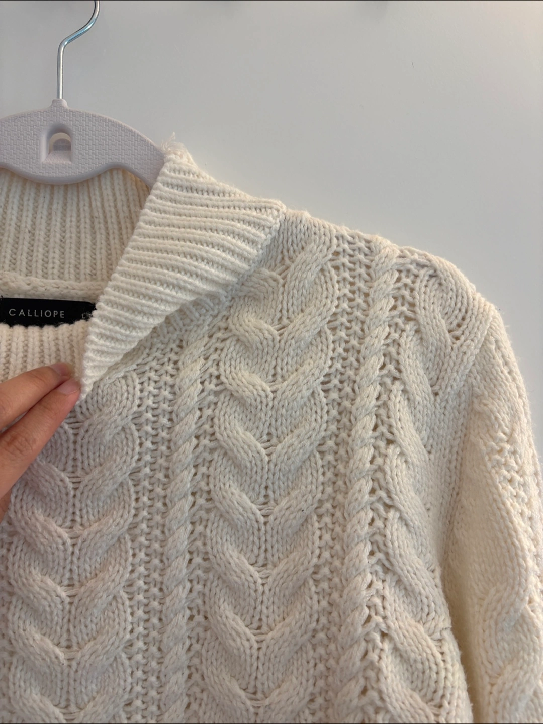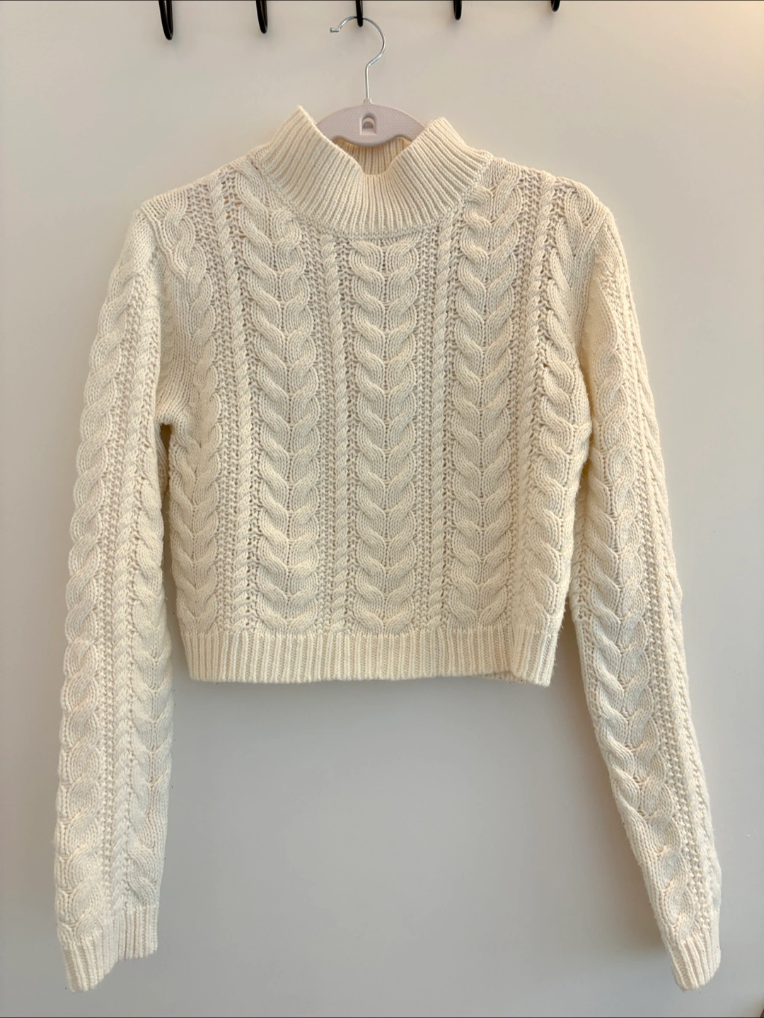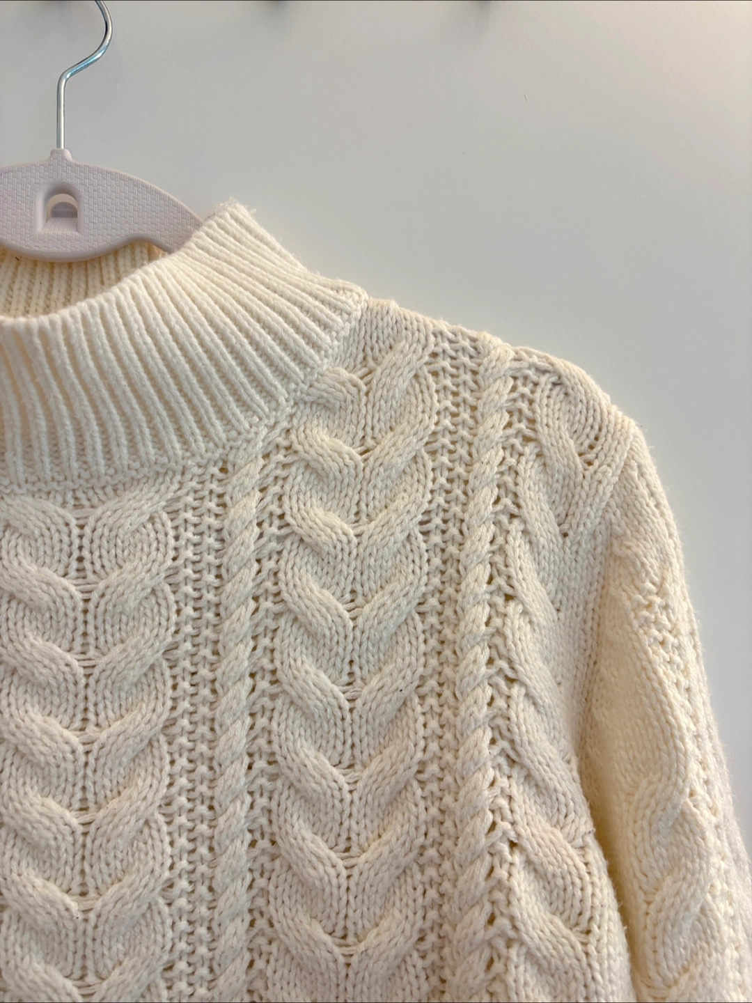 Ivory-coloured cable knit sweater. Features a mock neck and long sleeves.