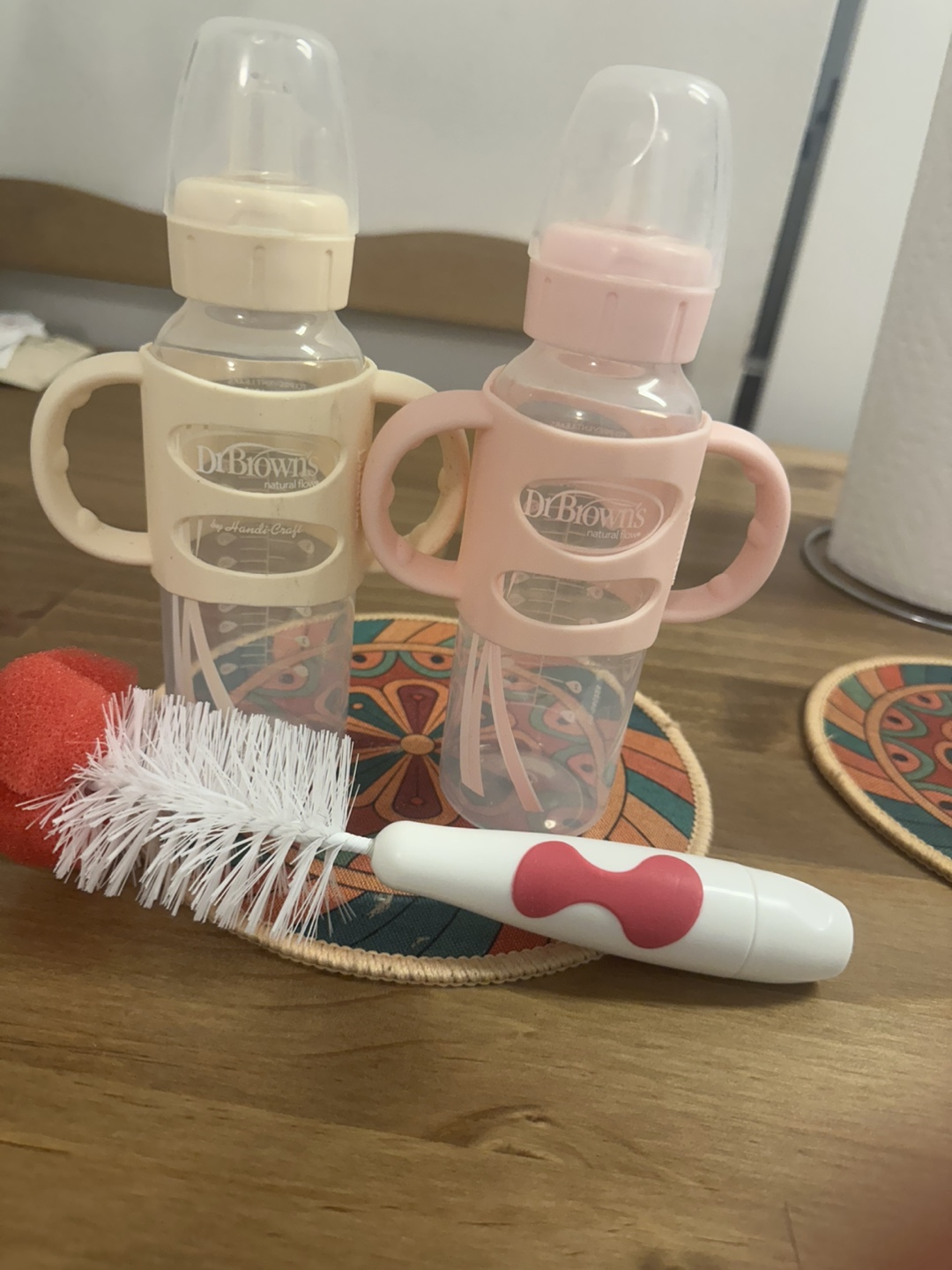 Dr brown bottles completely new 2 color with one bottle cleaning brush . My daughter is doing only brestfeeding bought these so that she could start the bottle feeding however does’t work. Great for who already doing bottle feed .