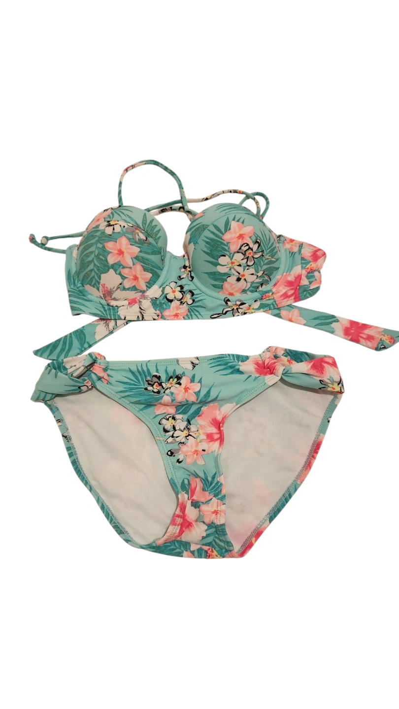 18Bikini set, matching top and bottoms. The top, strapless with bow detail. The bottoms, high waisted. Finding joy while wearing this. sizes small and medium