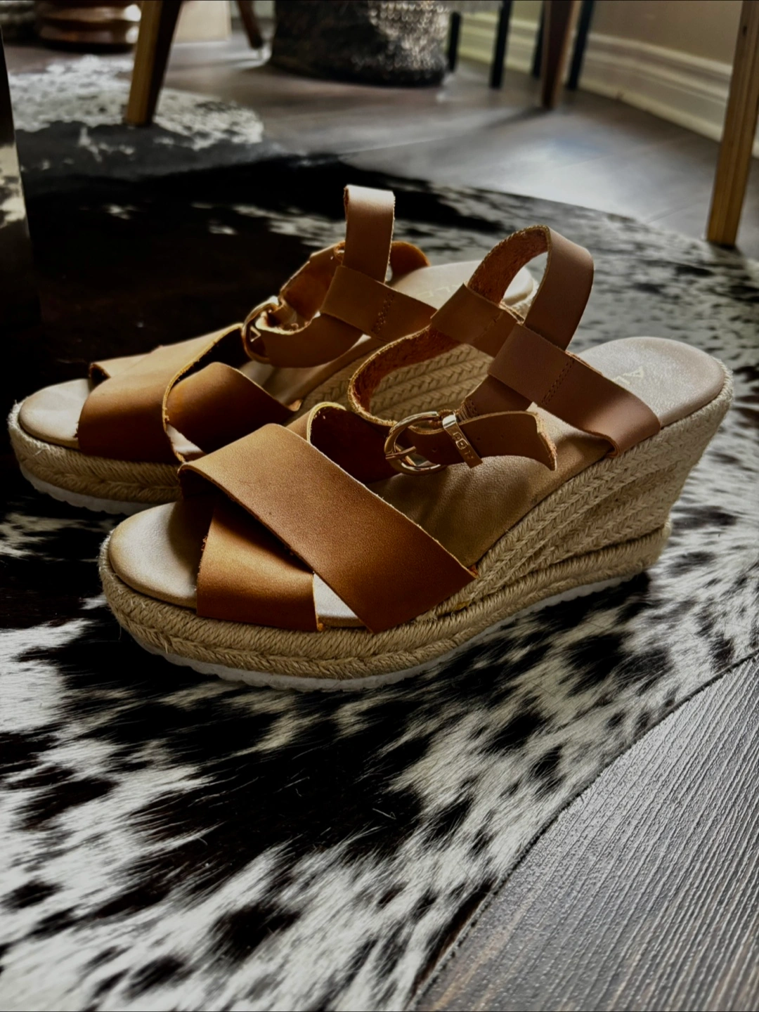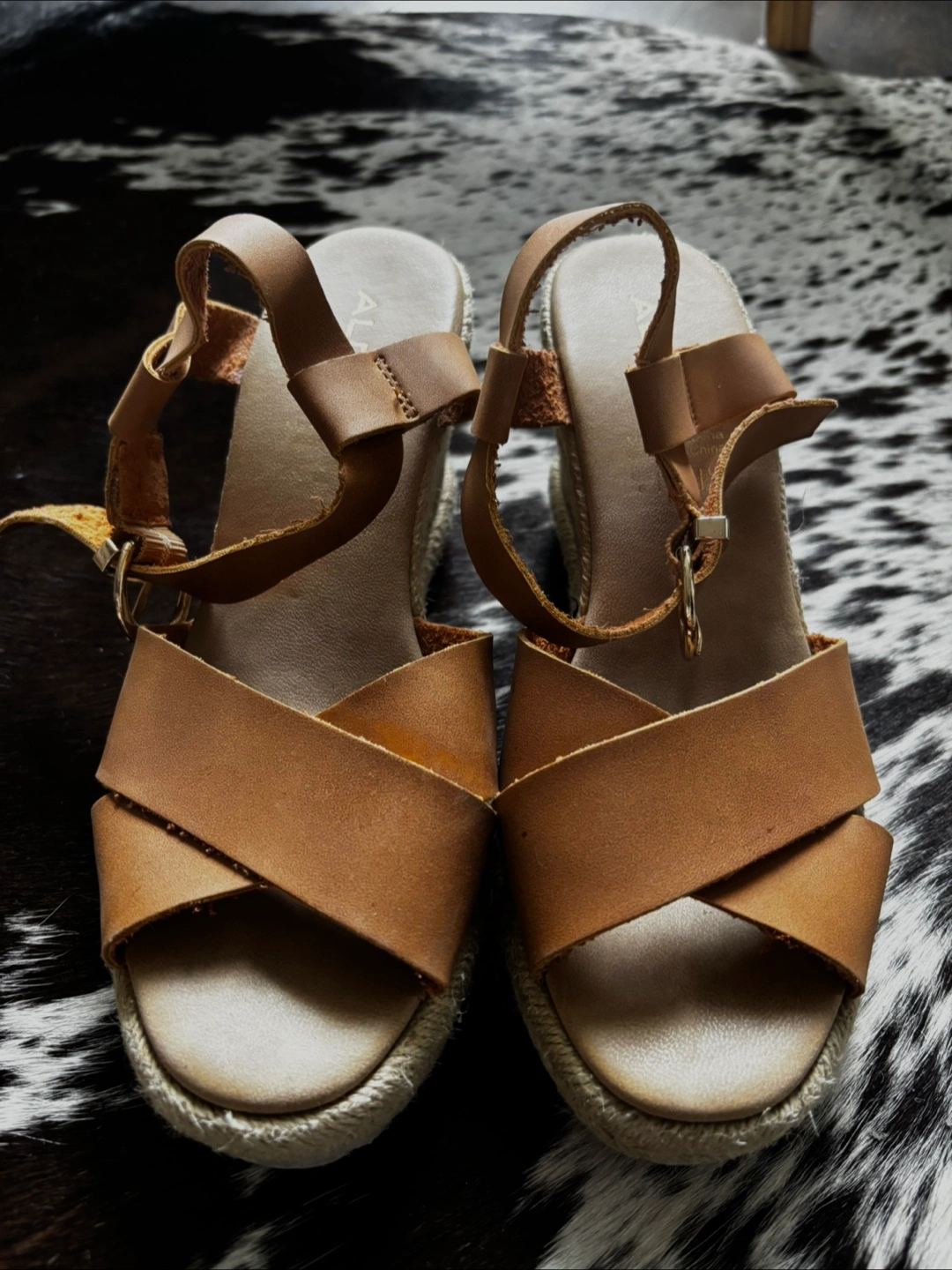 ALDO Women’s tan-cognac faux leather espadrilles wedge sandals, ankle strap buckle closure, jute platform, rubber soles, 8.5cm height, size 6, like new.