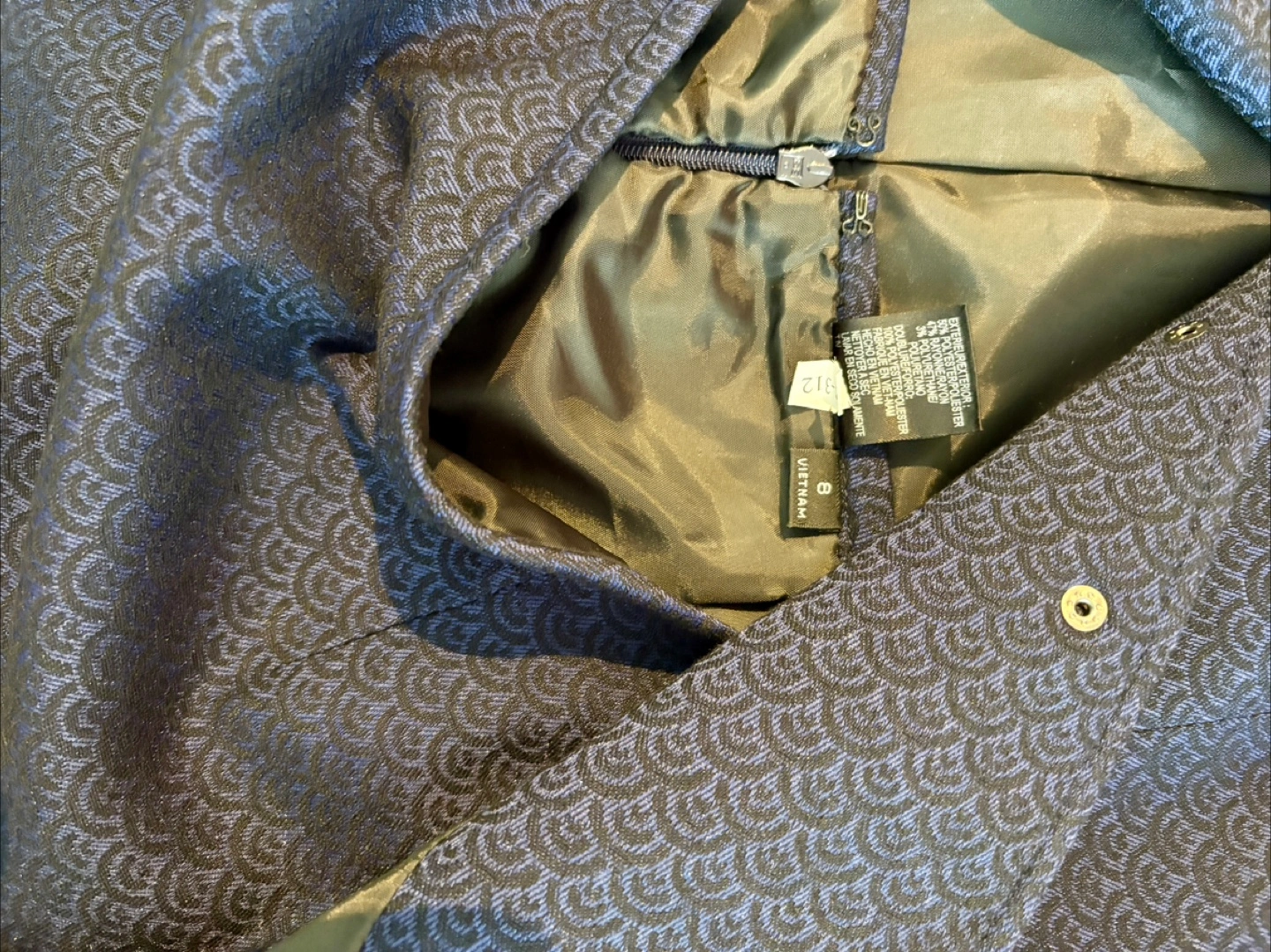 A classy suit. Featuring a blue marine patterned design. Button-down blazer with a skirt. The blazer has pockets and comes with a belt. used once , not my size anymore