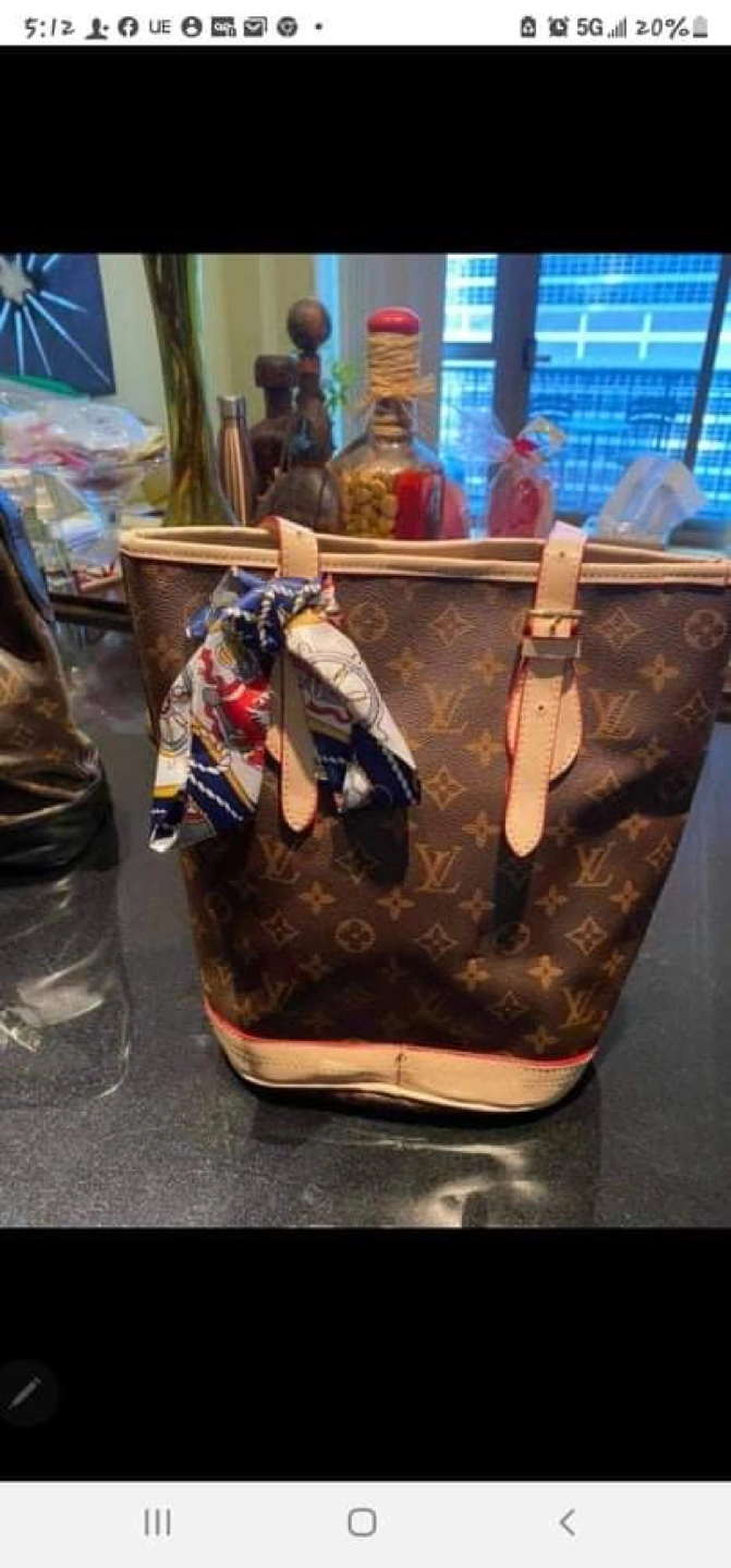 Tote bag in brown with a floral design. Features two top handles with scarf tied around one of them. This tote bag would be a beautiful addition to any collection.