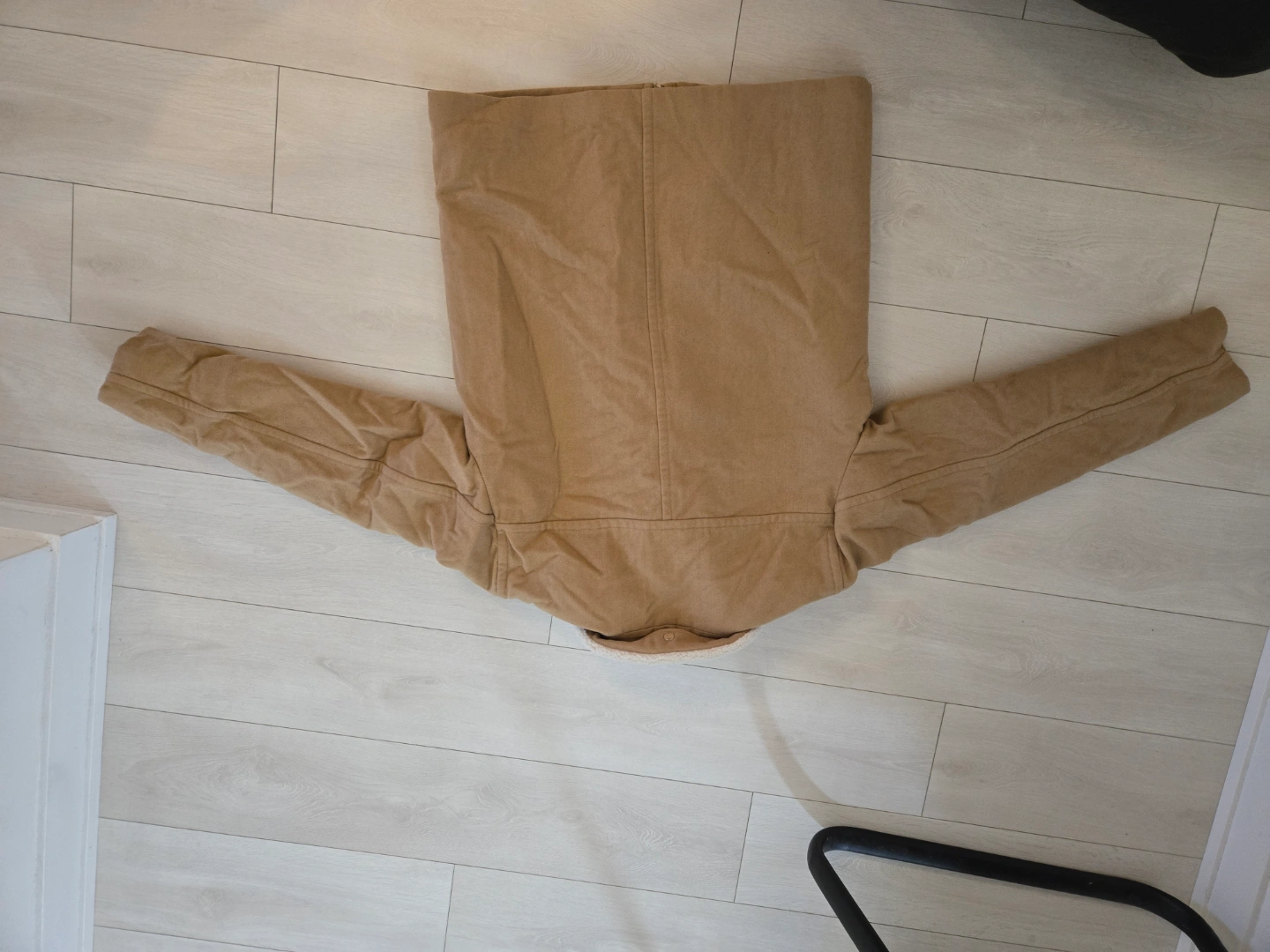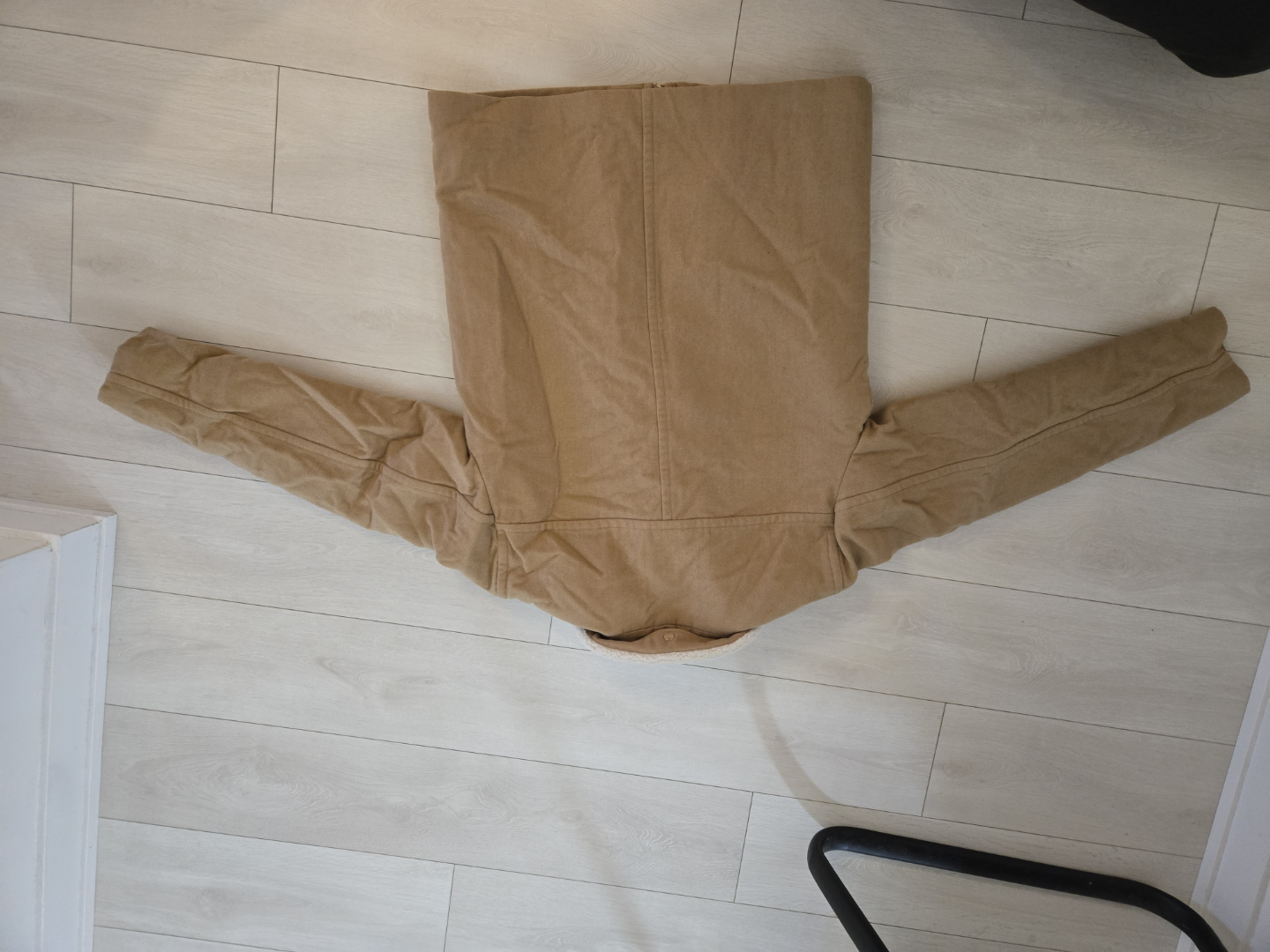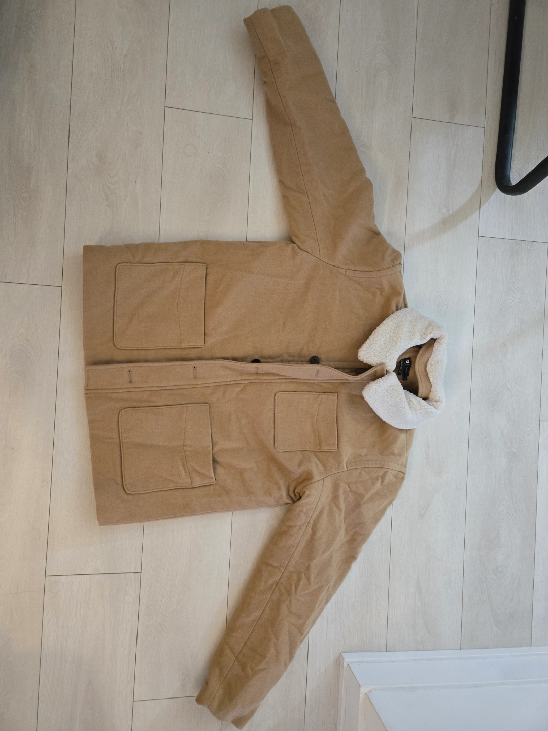 Tan coloured jacket. Featuring a sherpa collar. Two front pockets with button closure. Wear it to stay warm on a cold day. Bought it a few years ago but it was too large for me and I never filled it in.