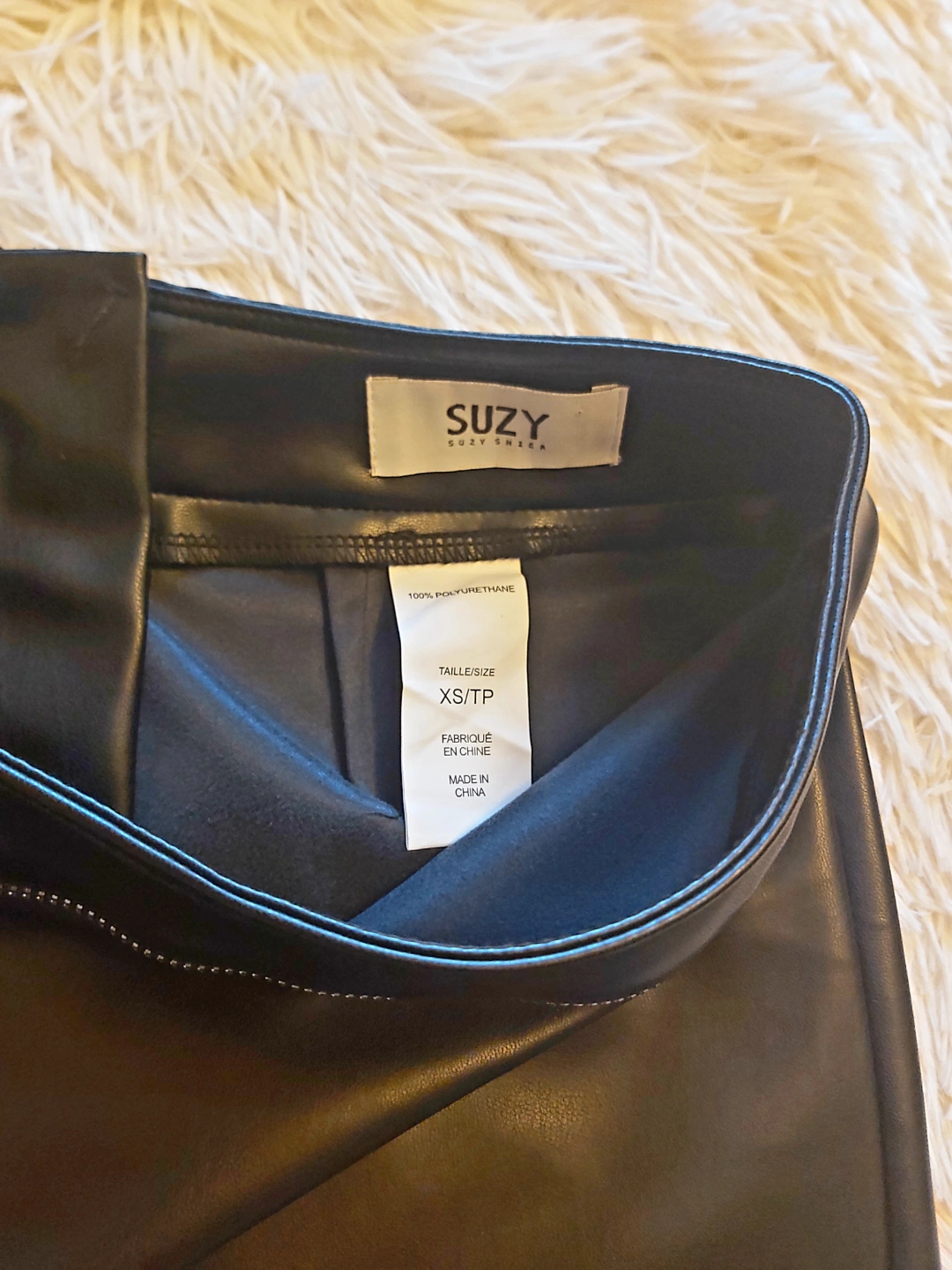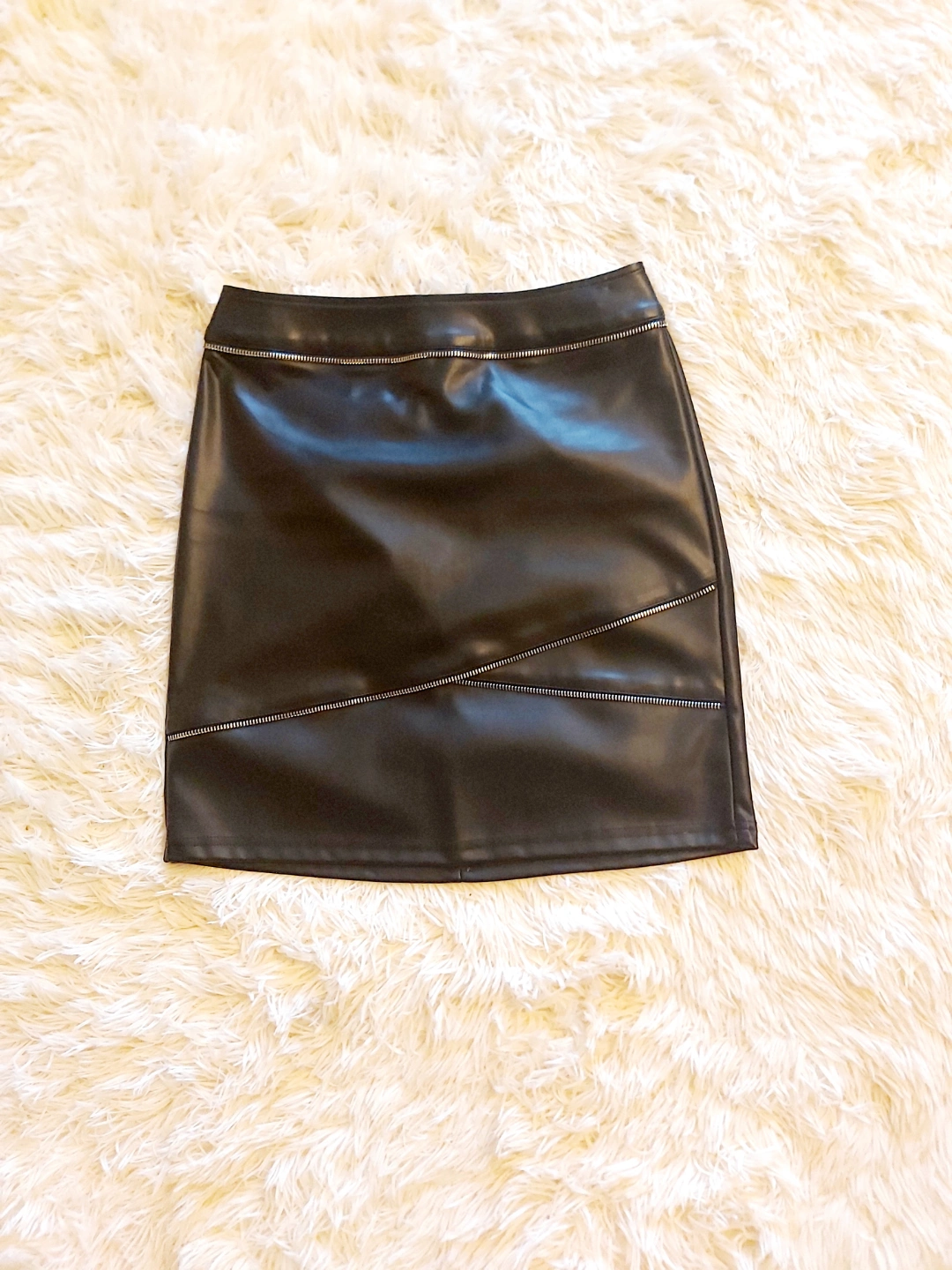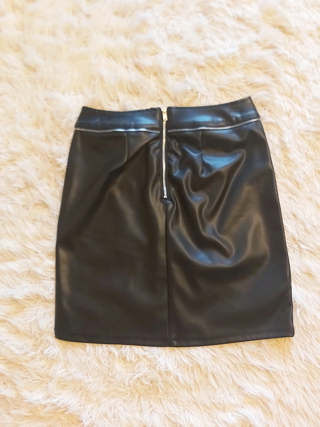 Black faux leather mini skirt. Features a zipper in the back. A great addition to your wardrobe for many outfits, especially if you're planning a night out. zipper detail in the front.