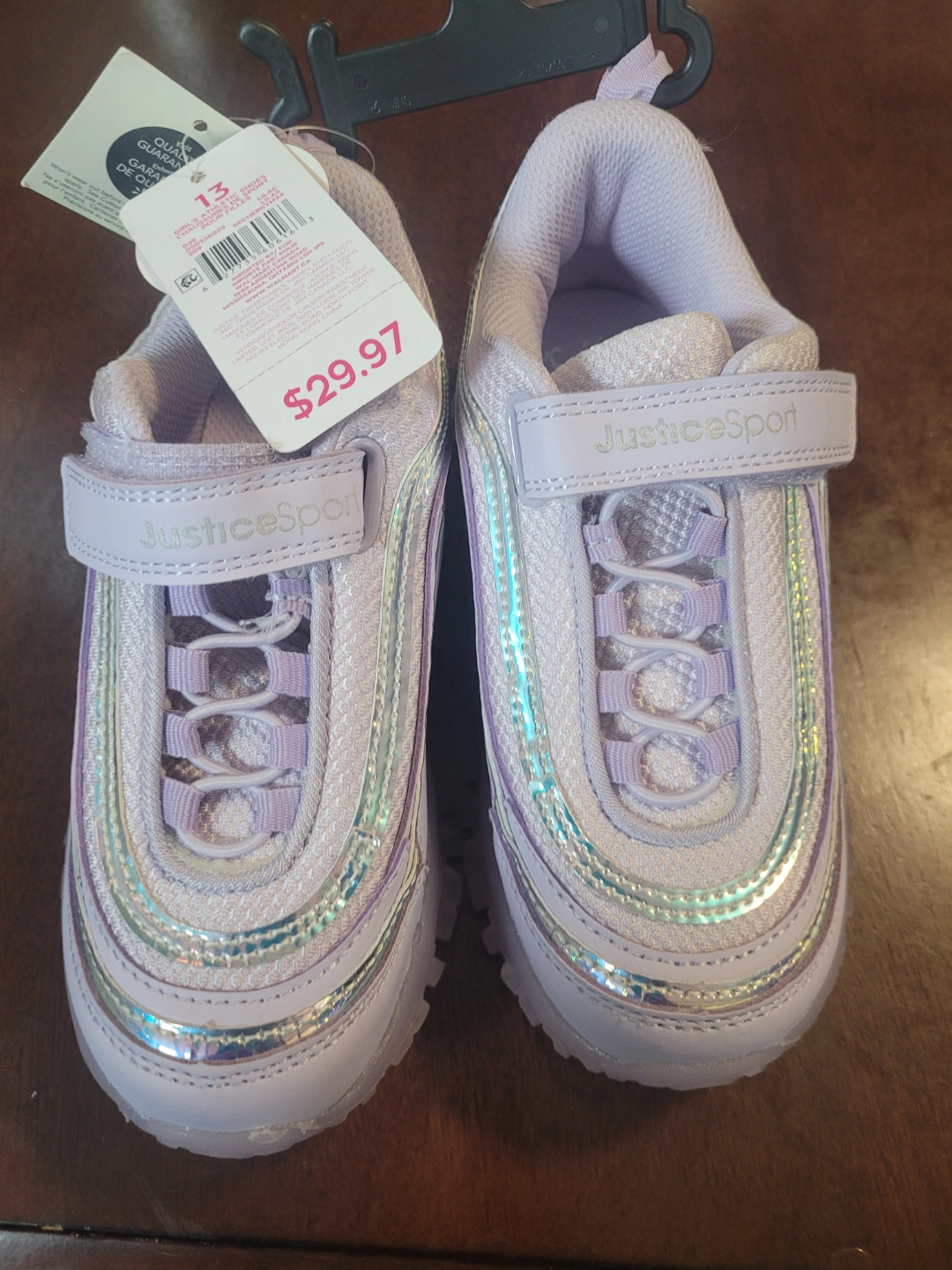 New with tags size 13 Justice running shoes. Lavender-coloured sneakers with silver accents on the upper part of shoe. Features a velcro strap and memory foam. These sneakers are perfect addition to any young girls wardrobe.