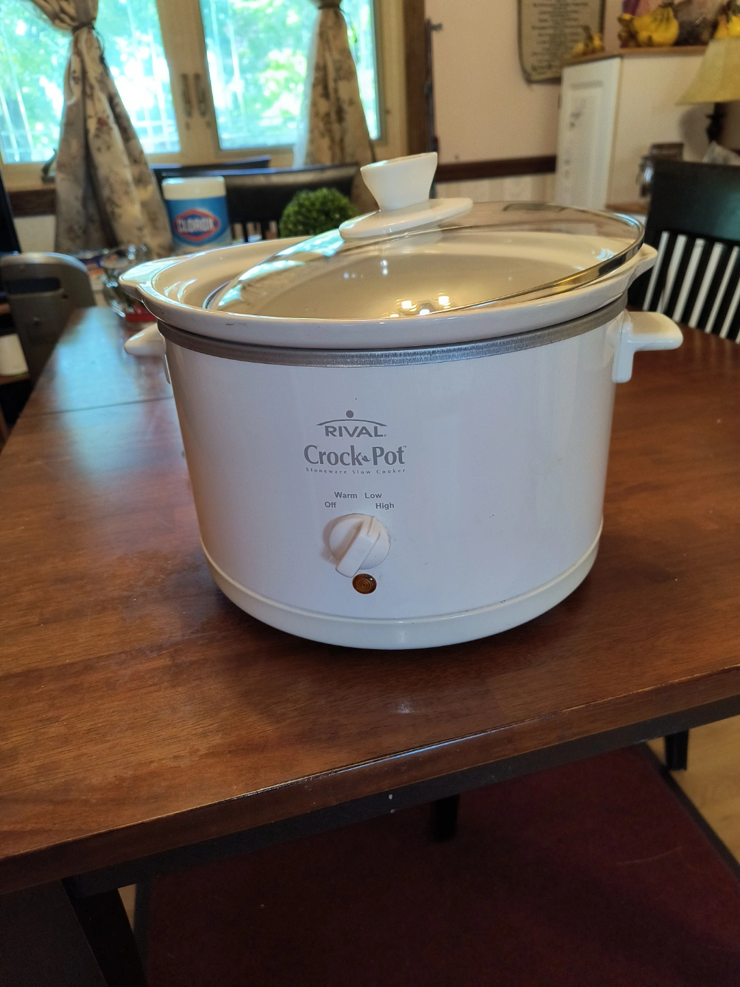 White slow cooker. Comes with a glass lid. Features a dial with off, warm, low, and high settings.