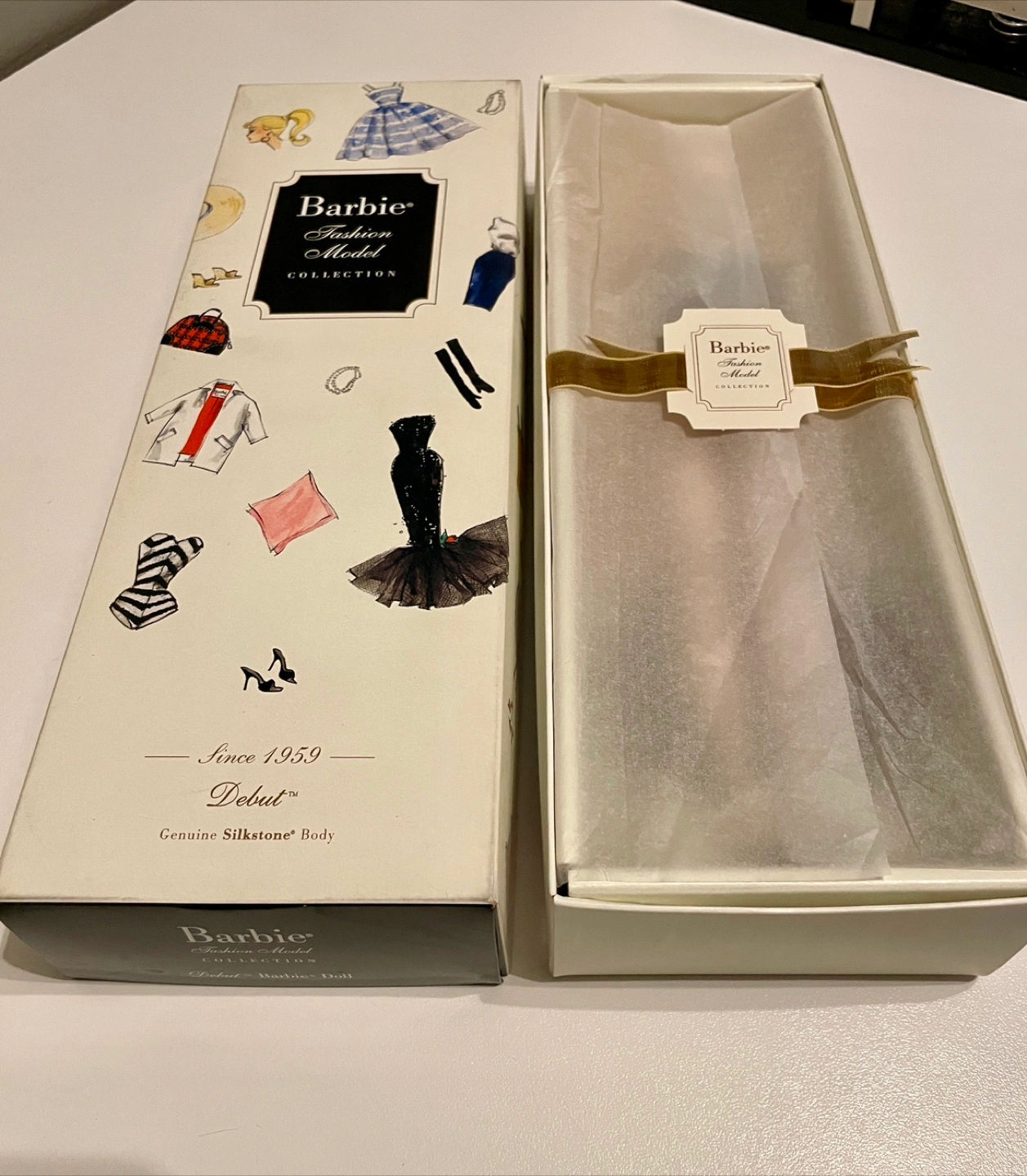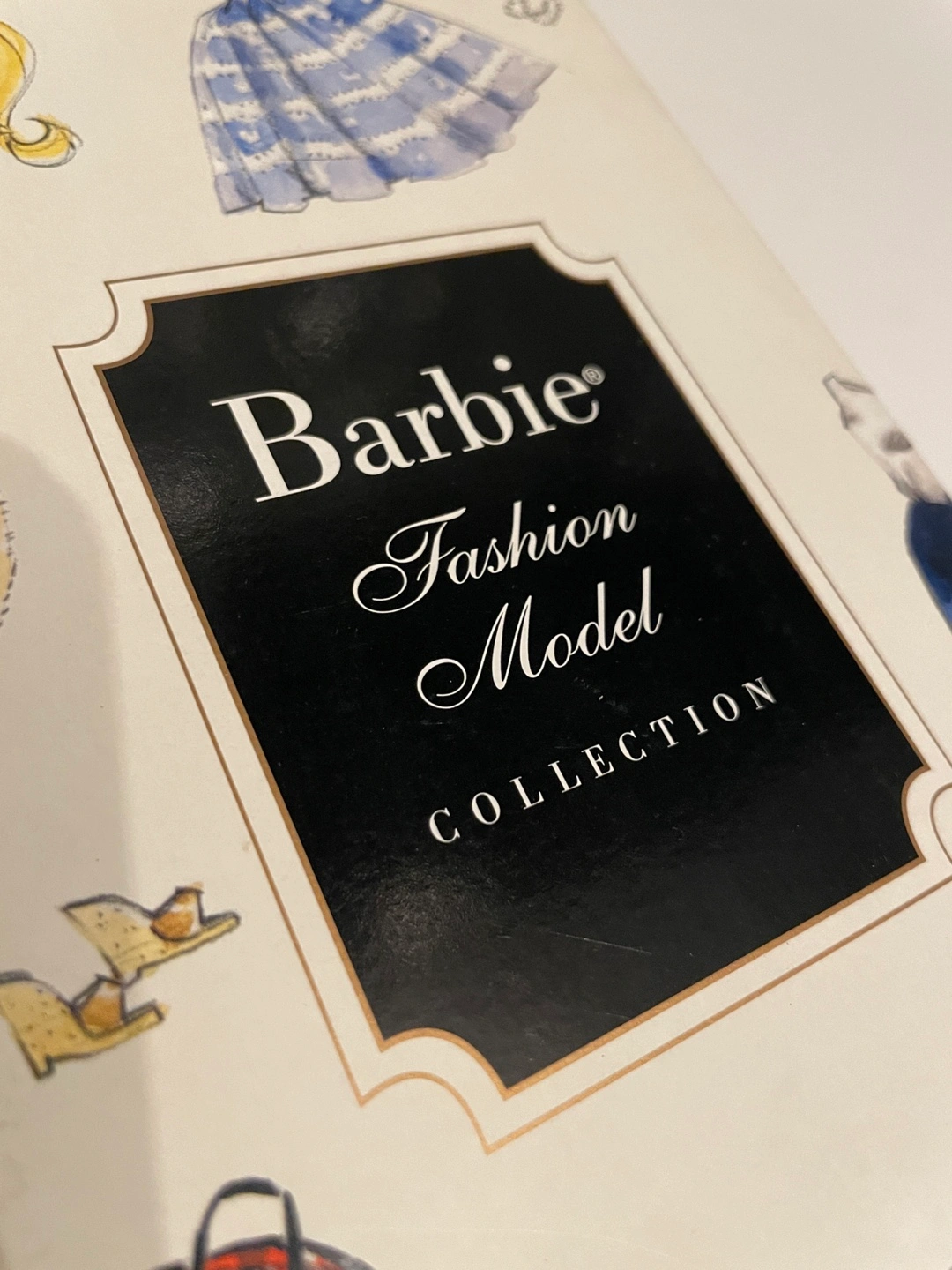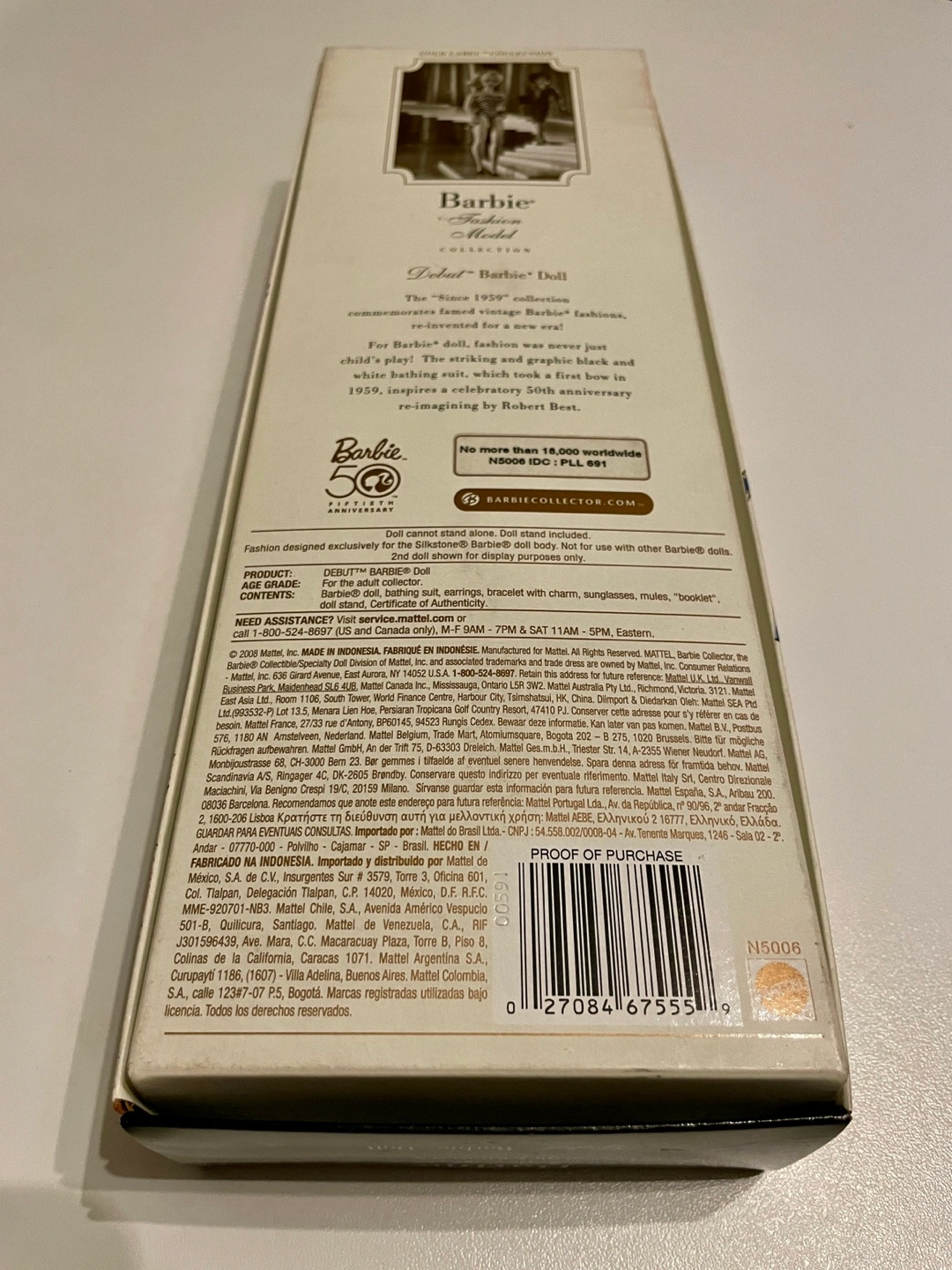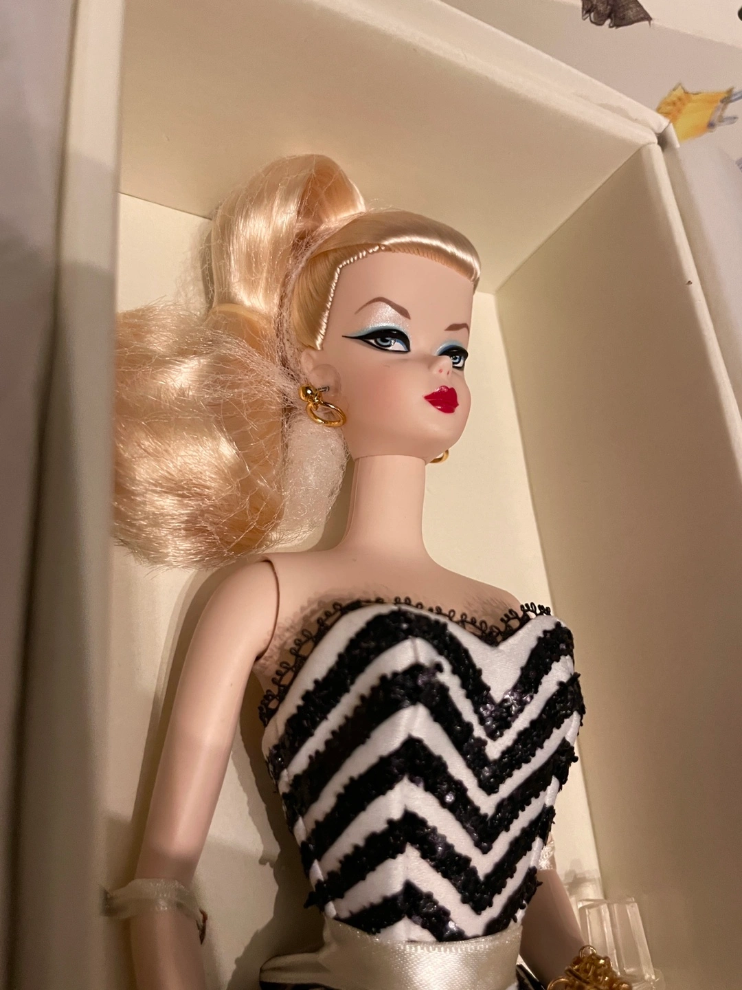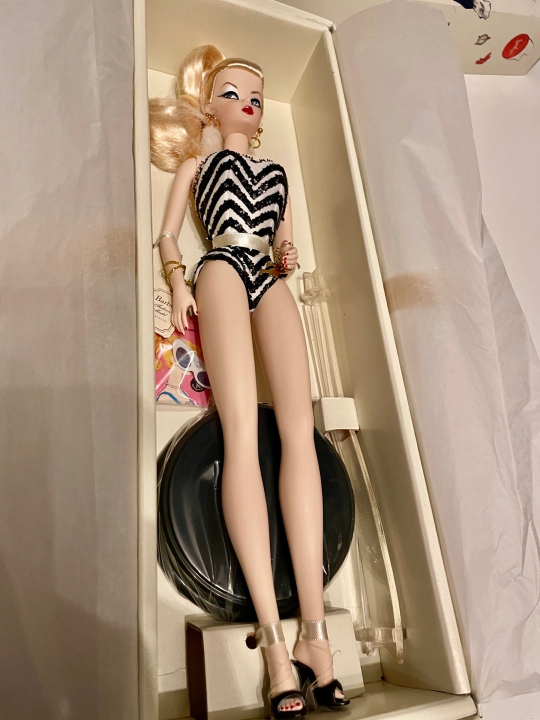 Doll inside a box with packaging. The doll has blonde hair, red lipstick, and a black and white striped swimsuit. The box is cream-colored with illustrations. This doll could be a great collectible item.