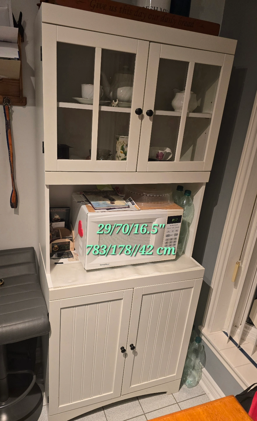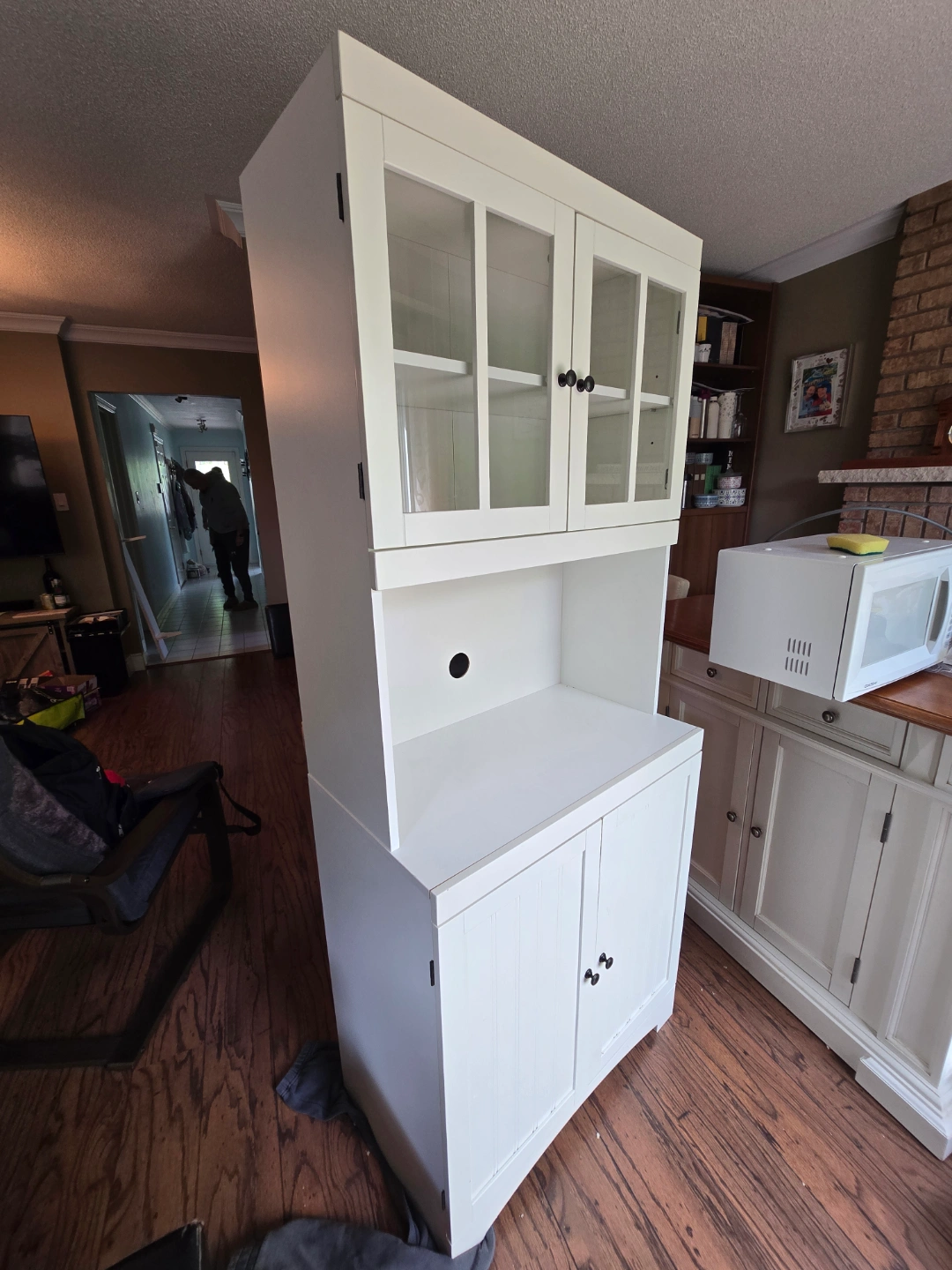 White kitchen cabinet with glass doors and microwave storage. The cabinet has a lower storage with panel doors and small black knobs. A great way to store kitchenware in a neat and organized way. It comes in one piece, can't be disassembled. No delivery available.