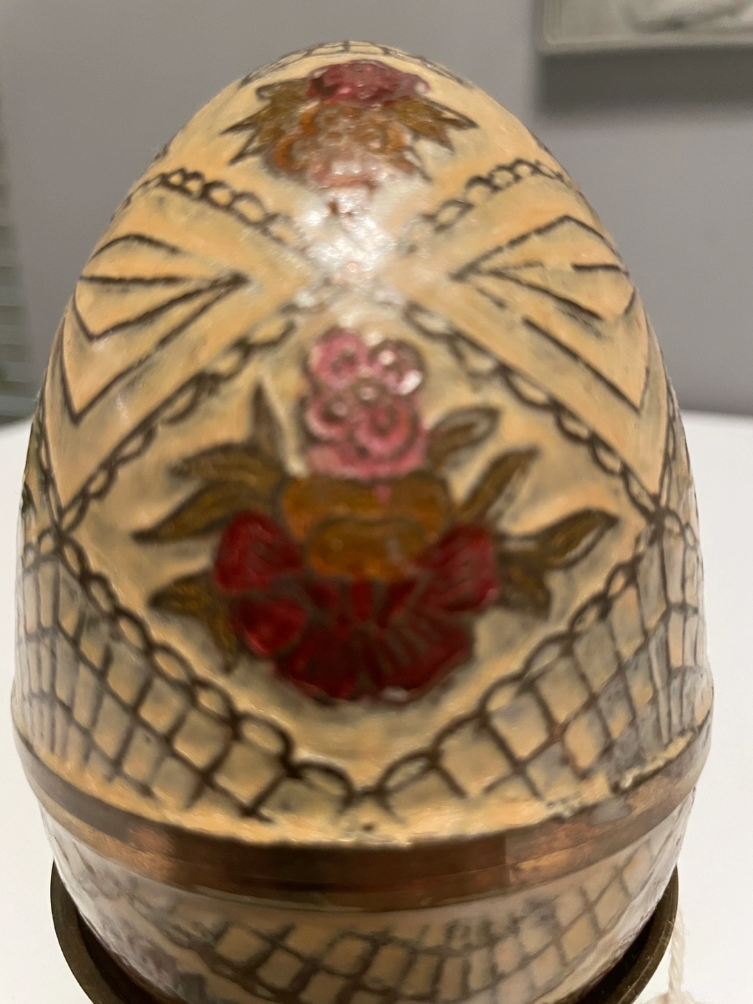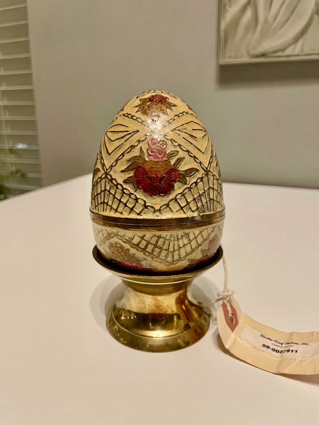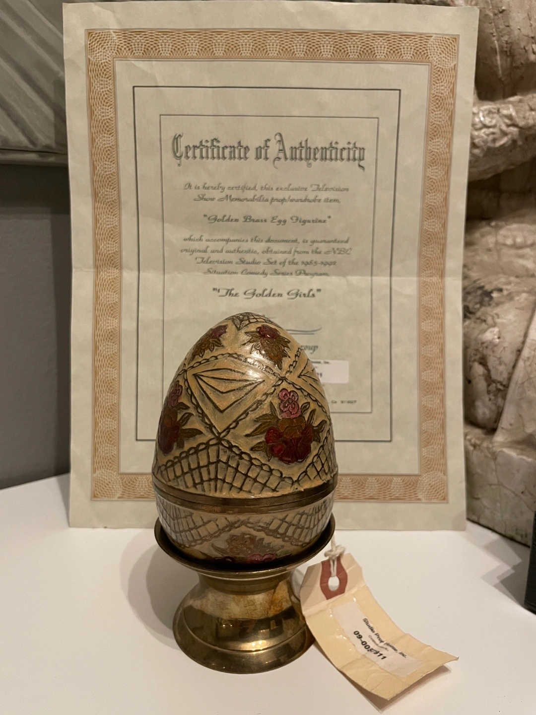 From the famous 80’s TV show The Golden Girls. Figurine of an egg with a floral pattern, on a stand. The egg appears to be in two pieces, with the top half removable. Comes with a certificate of authenticity. This decorative item could serve as a charming trinket holder.