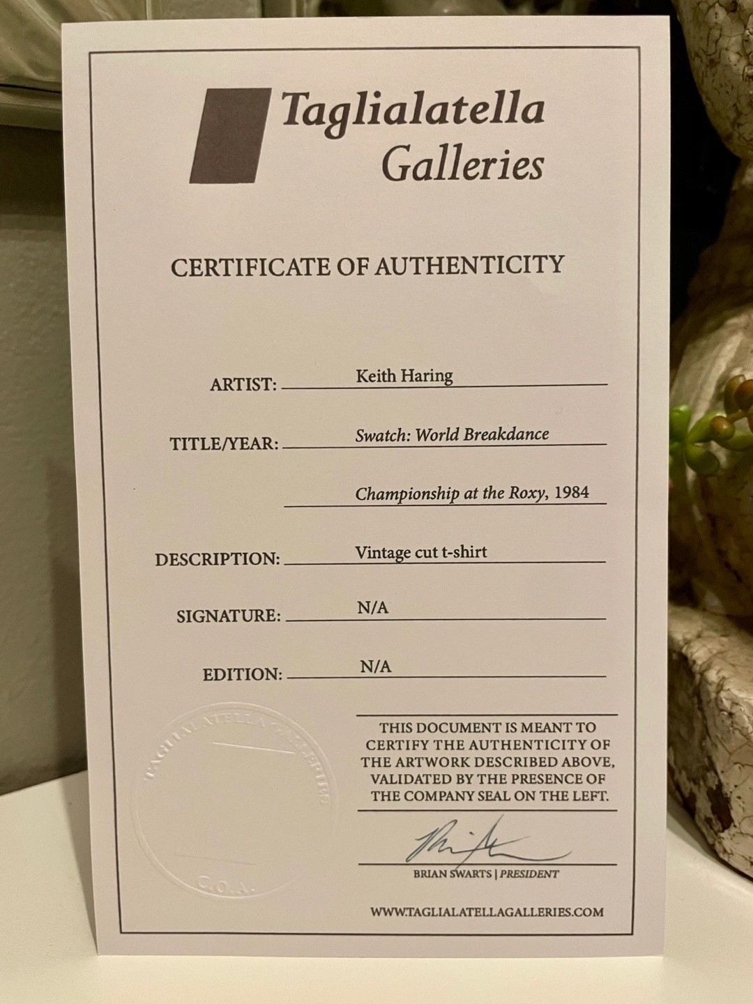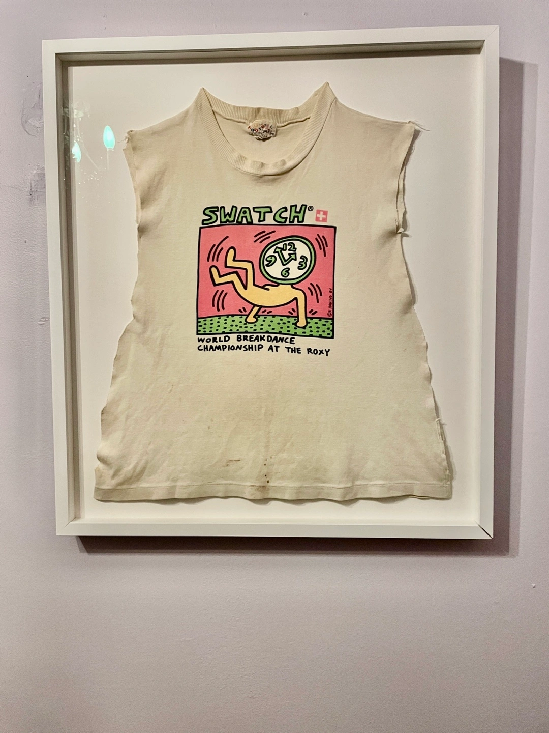Cream-colored sleeveless tee. Features a graphic by Keith Haring for the World Breakdance Championship at the Roxy. A perfect item to display as a piece of art.