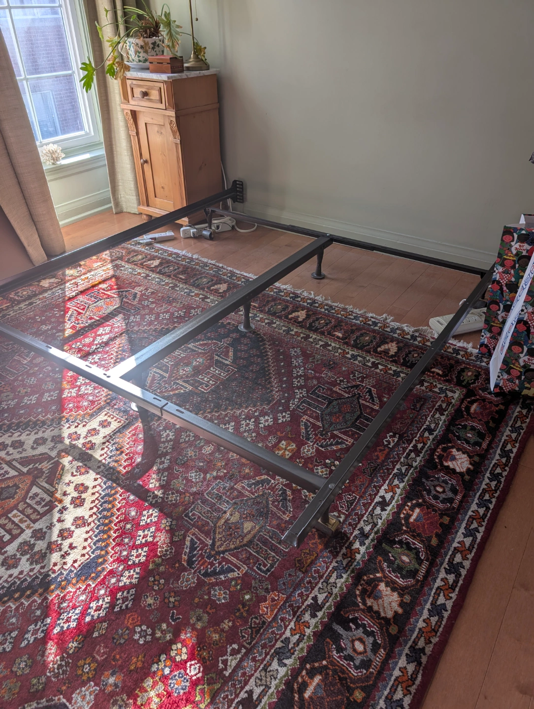 Frame is on wheels can take up to king size bed. Box spring is easier to move in stairs. Each box is 79 x 29 inches. Possibility of queen mattress from a neighbor.