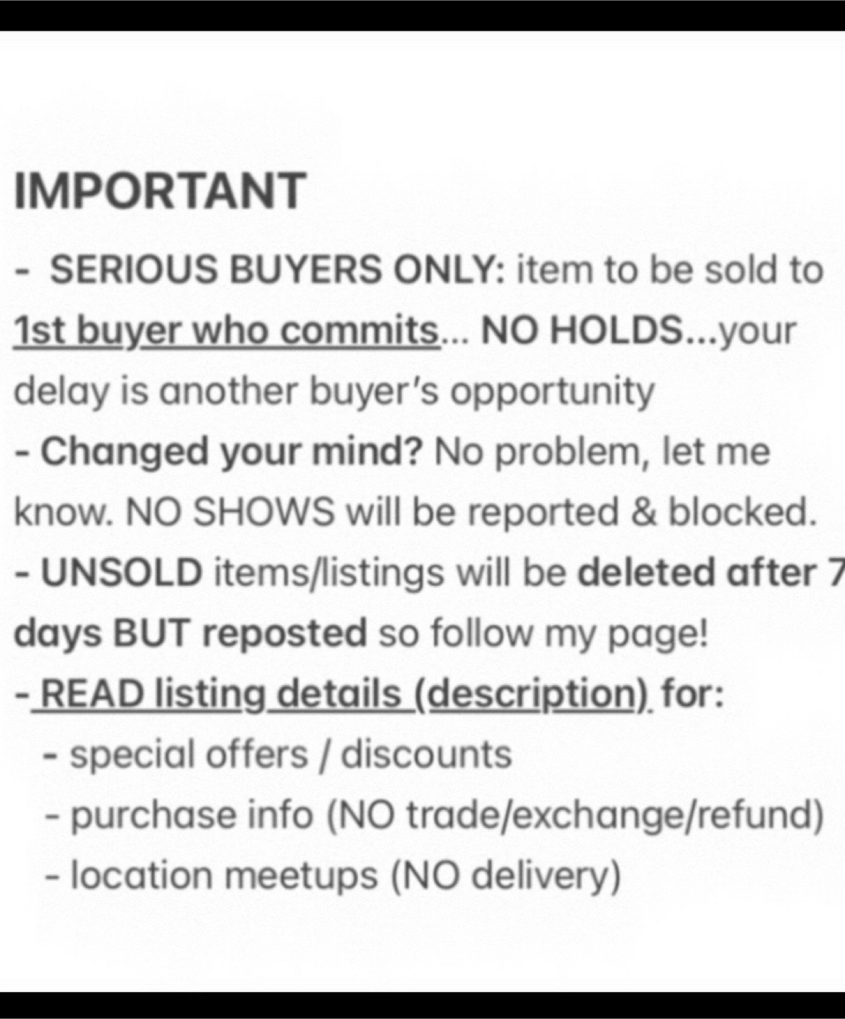 SERIOUS BUYERS ONLY / FINAL SALE / Cash Payment at pickup / NO HOLDS (Items will be sold on a FIRST-COME/PAYMENT-FIRST-SERVE basis!)