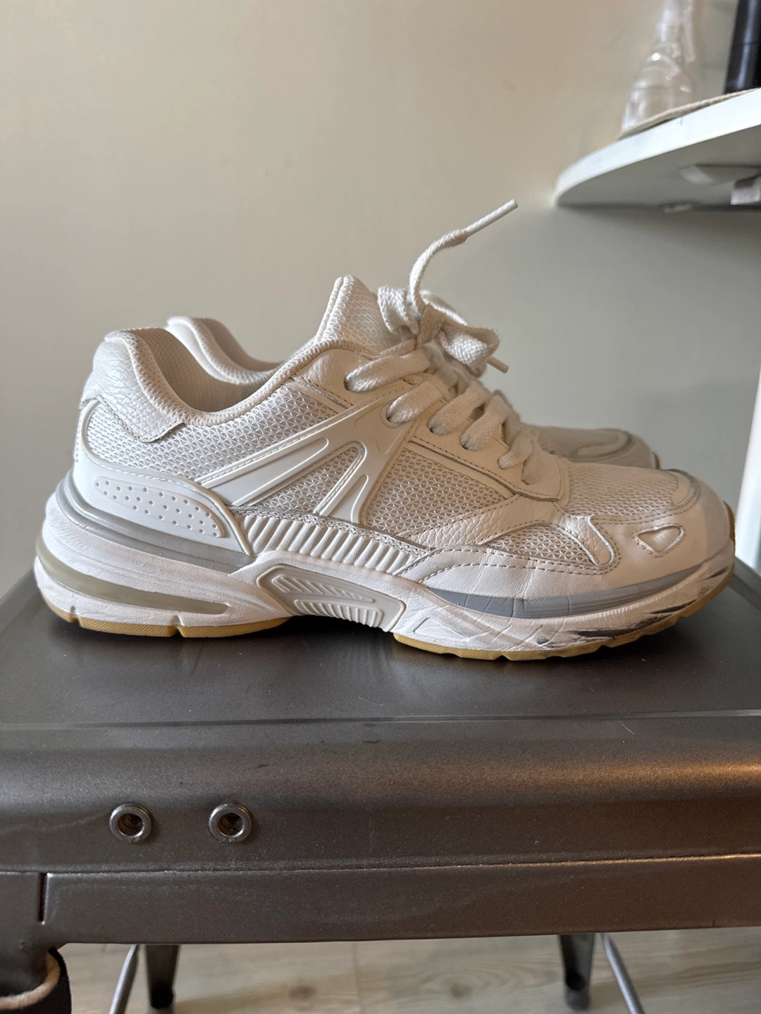 White sneakers, with laces. Mesh detailing visible. Worn once for 30 mins and I realized they’re way too small for me, and I’m outside the return window lol…