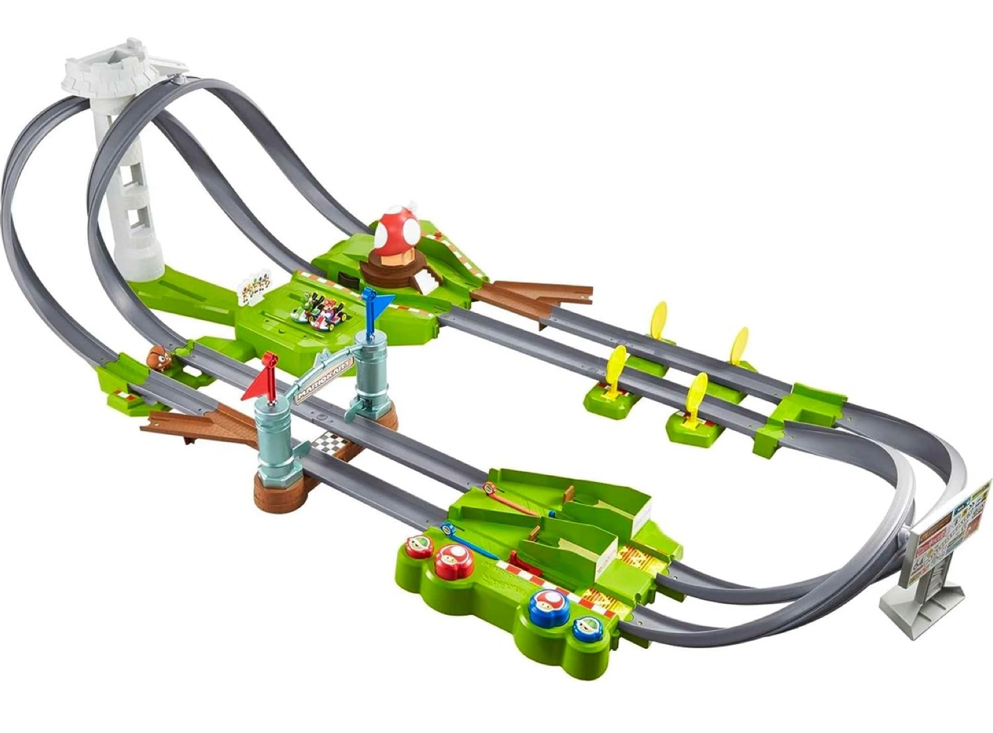 Track set with Mario Kart theme. Loop-de-loop track, various accessories. Great for imaginative play and peaceful relaxation.