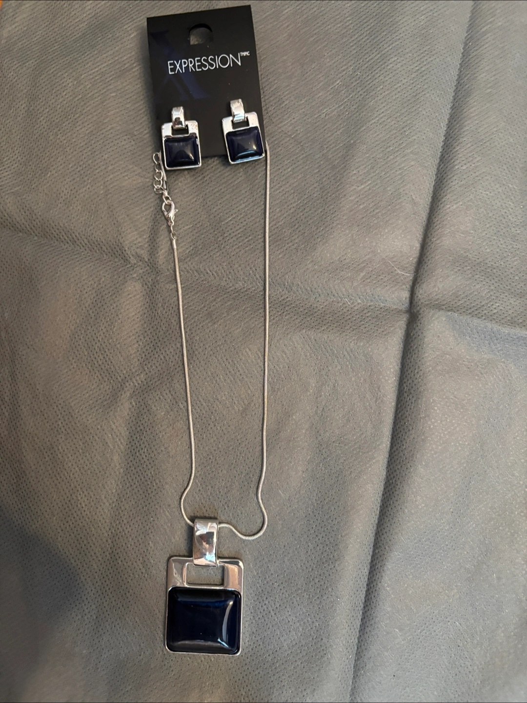 Matching necklace and earrings set. The necklace features a pendant and a chain. The earrings are a stud type, in a similar style to the necklace pendant. Such a classy set would be perfect to wear on a night out, or to make your style a little bit more elegant every day.