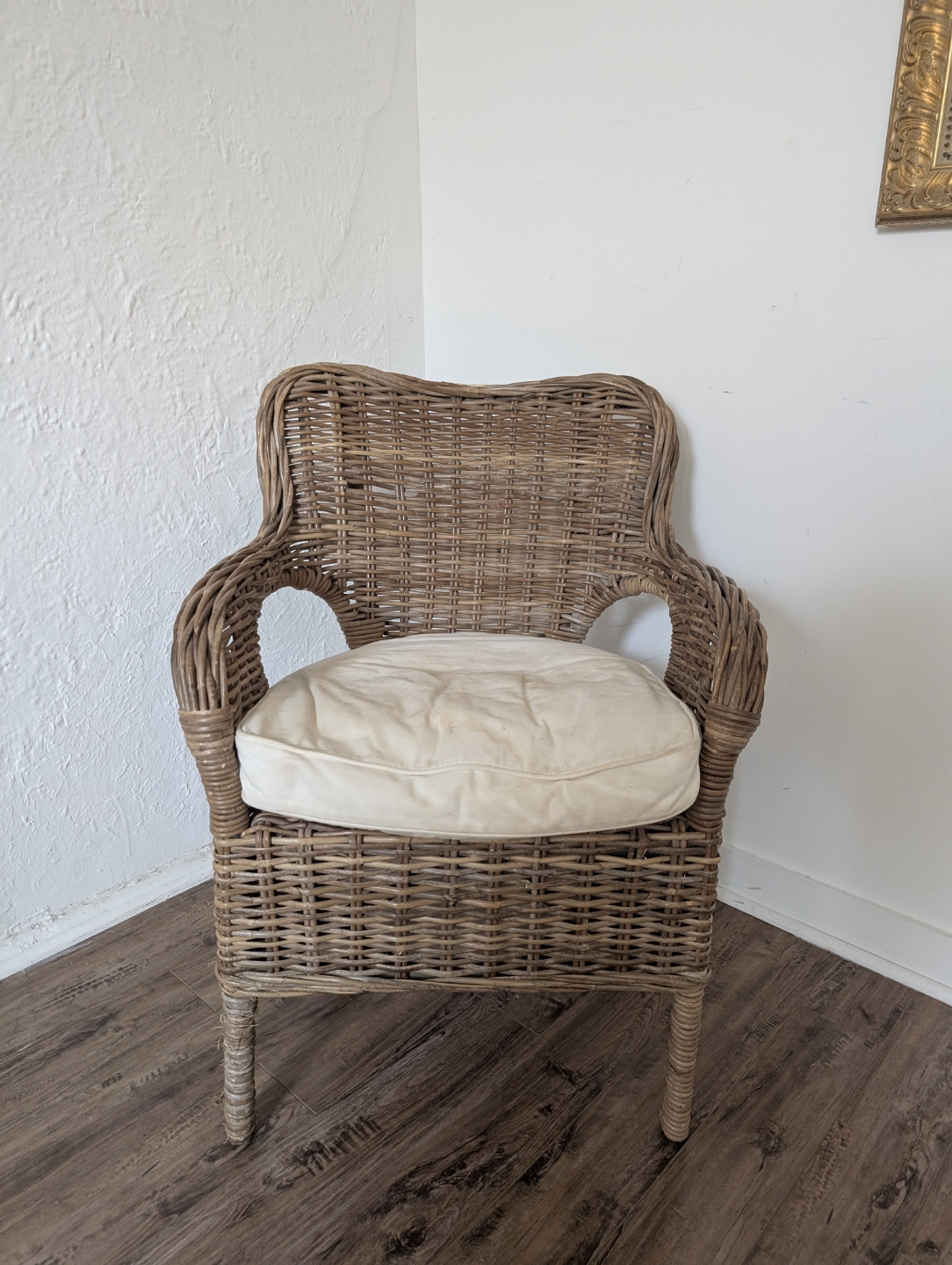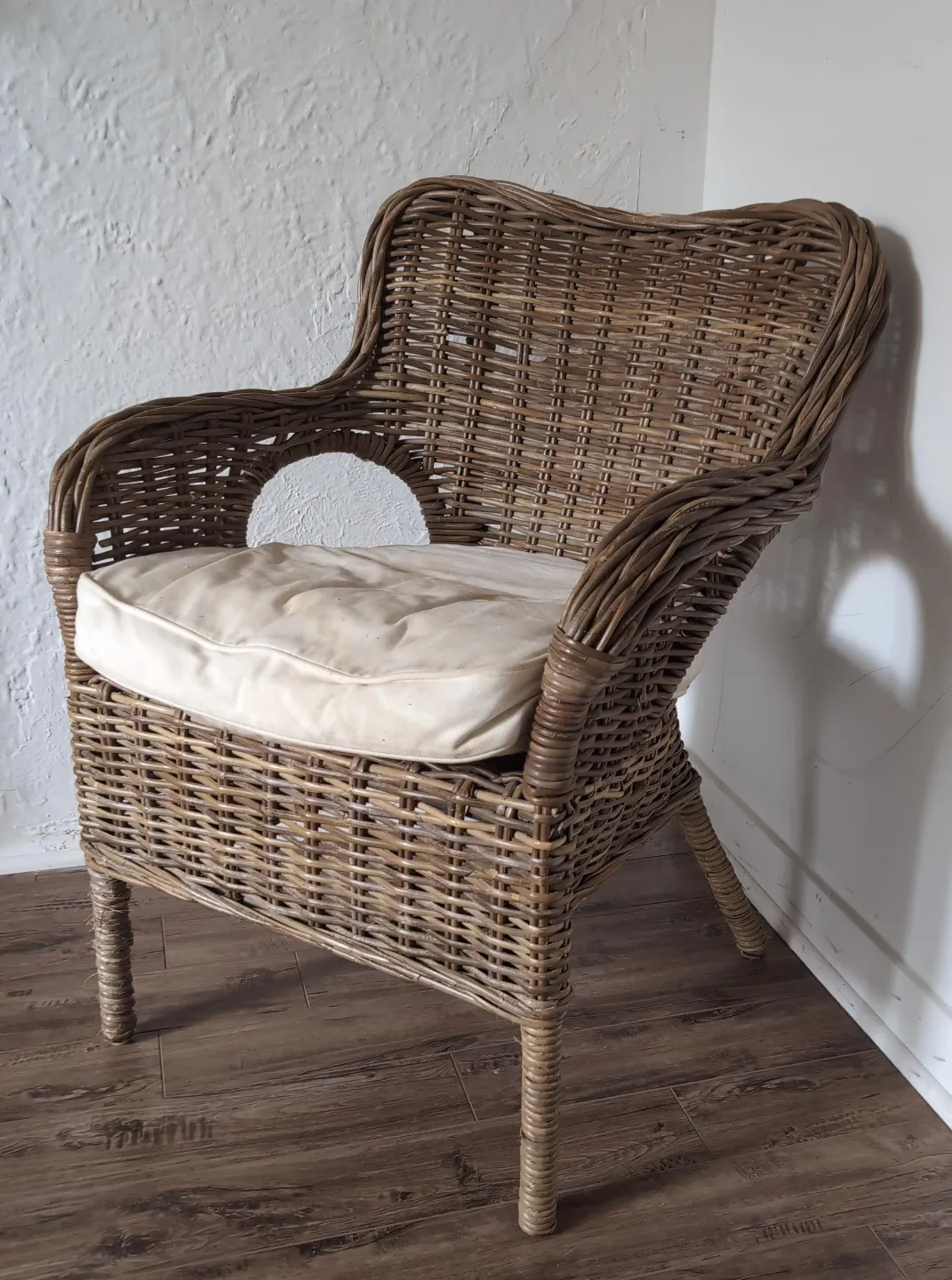 Wicker armchair. Features a woven design. A perfect place to curl up with a good book.