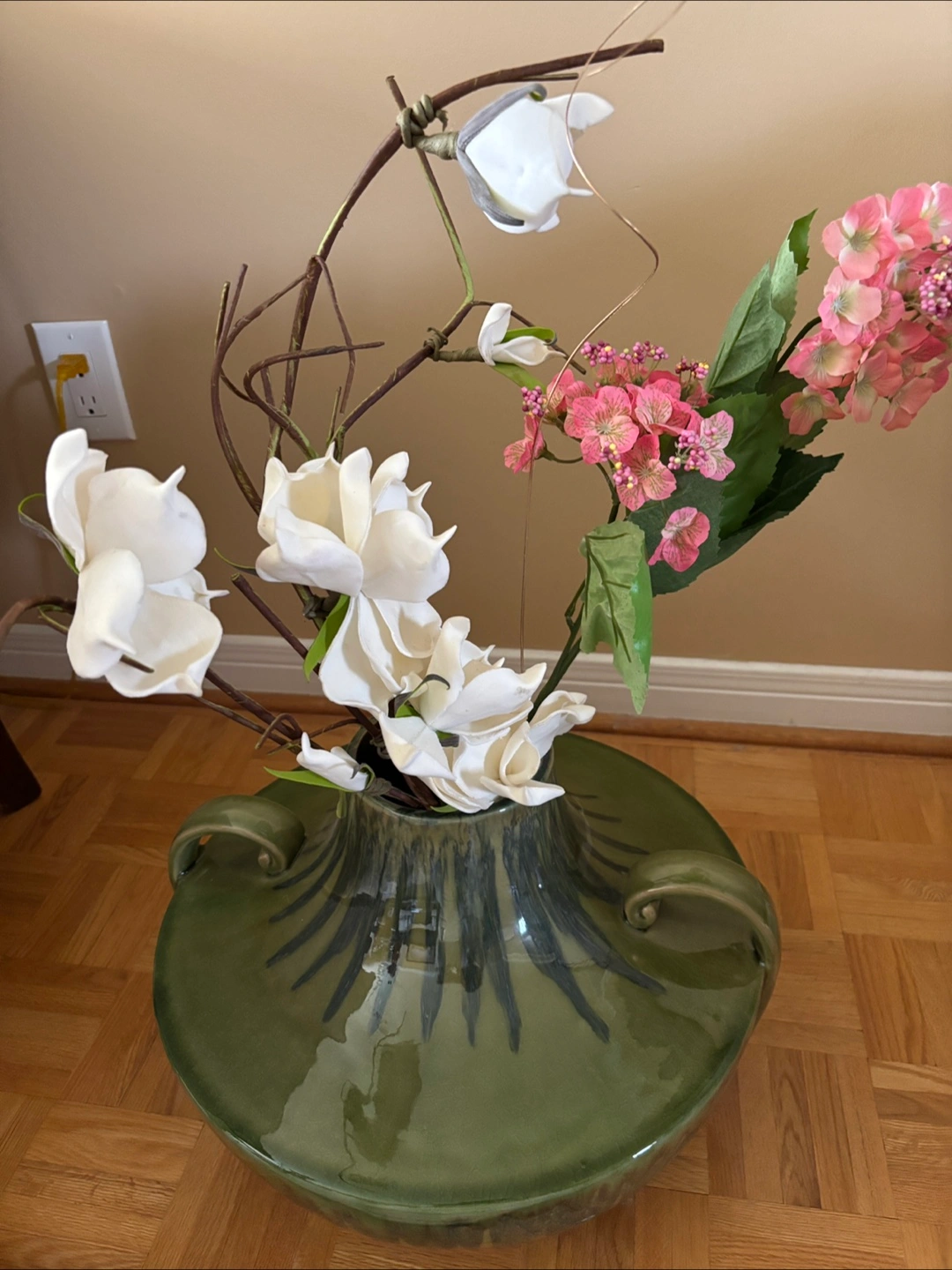 A large ceramic vase. Green in colour. Features two side handles. The vase has decorative floral arrangement. This beautiful vase is perfect for adding a touch of nature to any room.